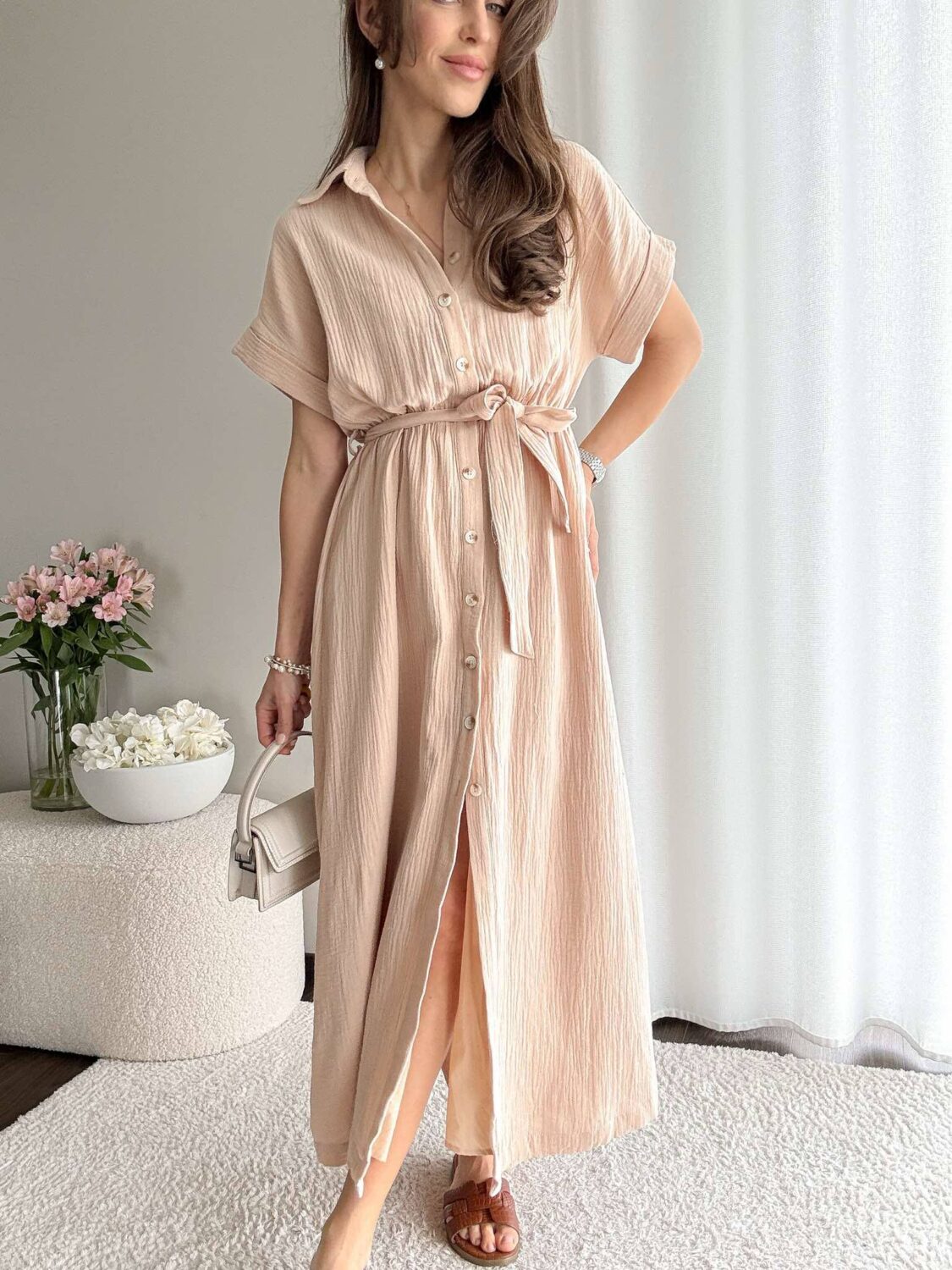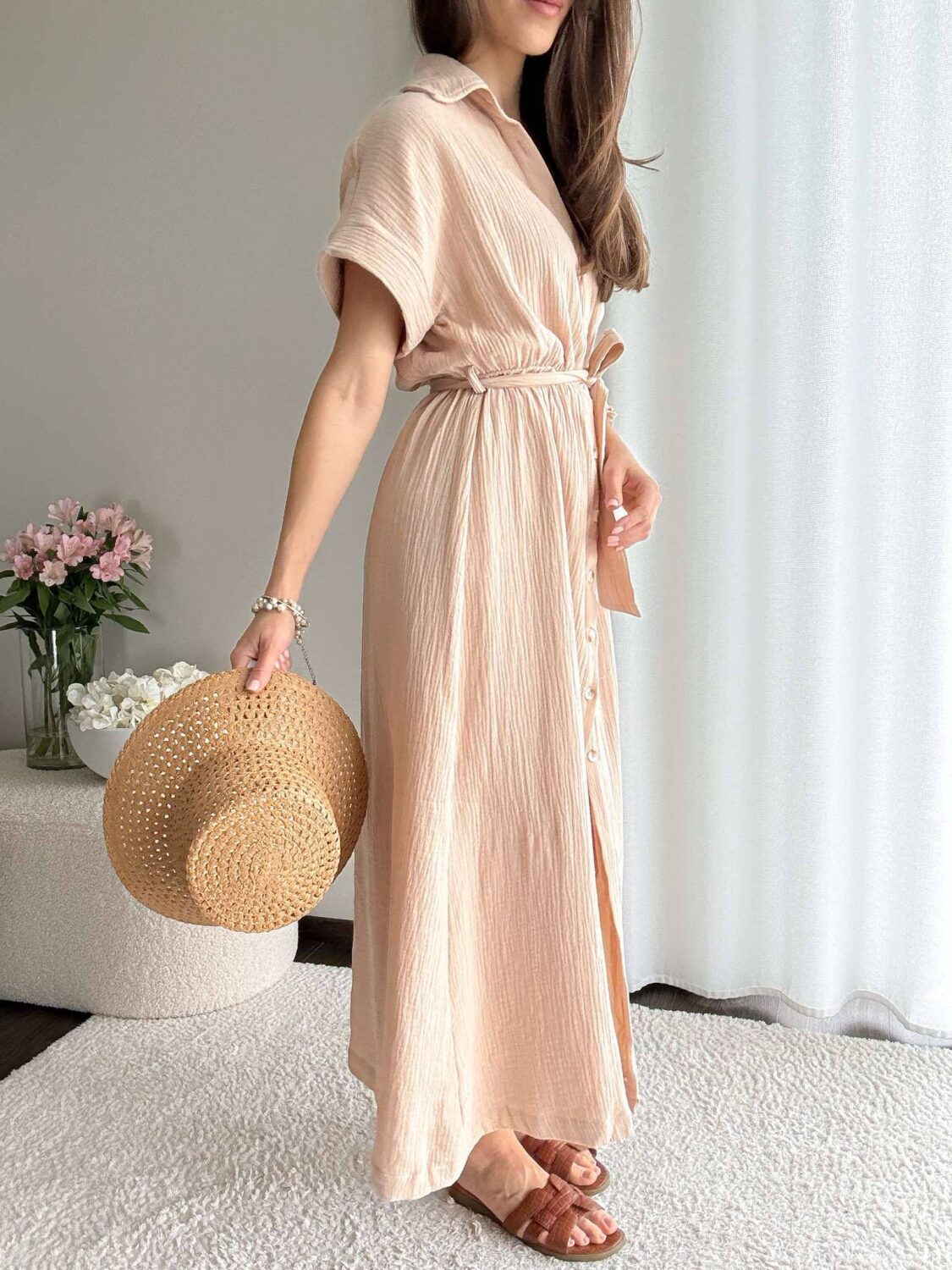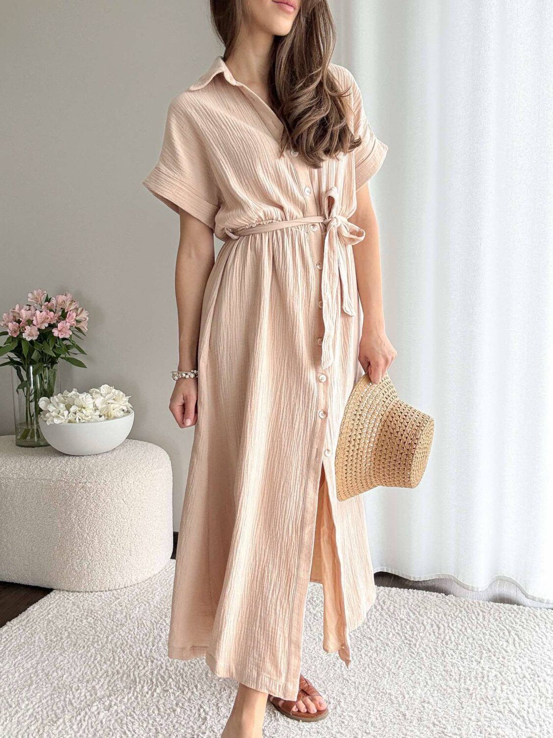 Muślinowa sukienka o fasonie szmizjerki, wiązana w pasie materiałowym paskiem na krótki rękaw.