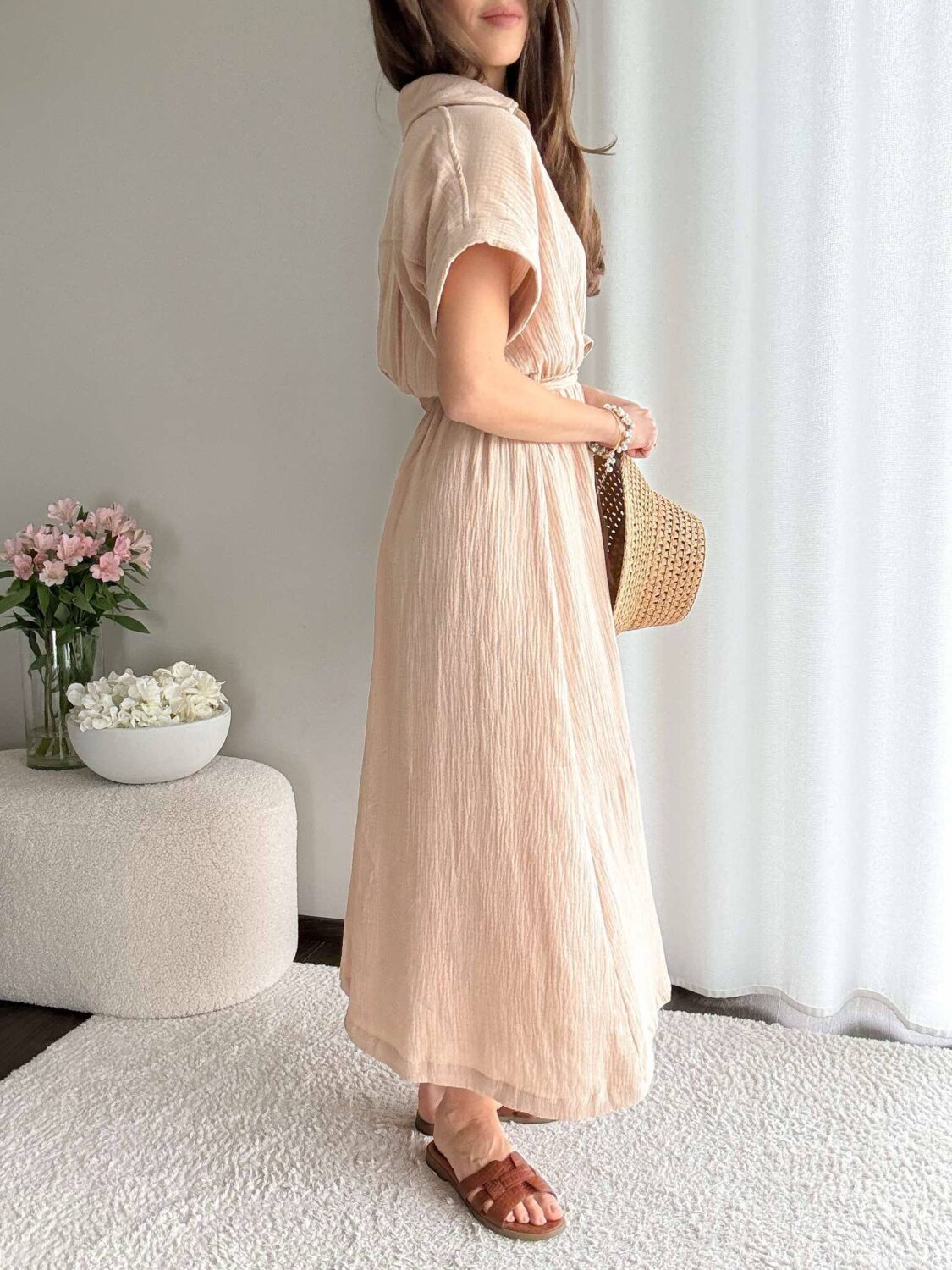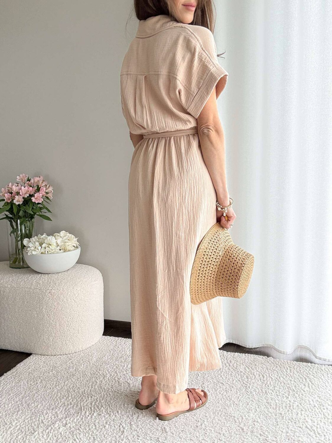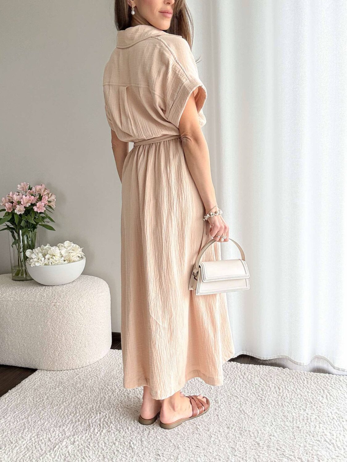 Muślinowa sukienka o fasonie szmizjerki, wiązana w pasie materiałowym paskiem na krótki rękaw.