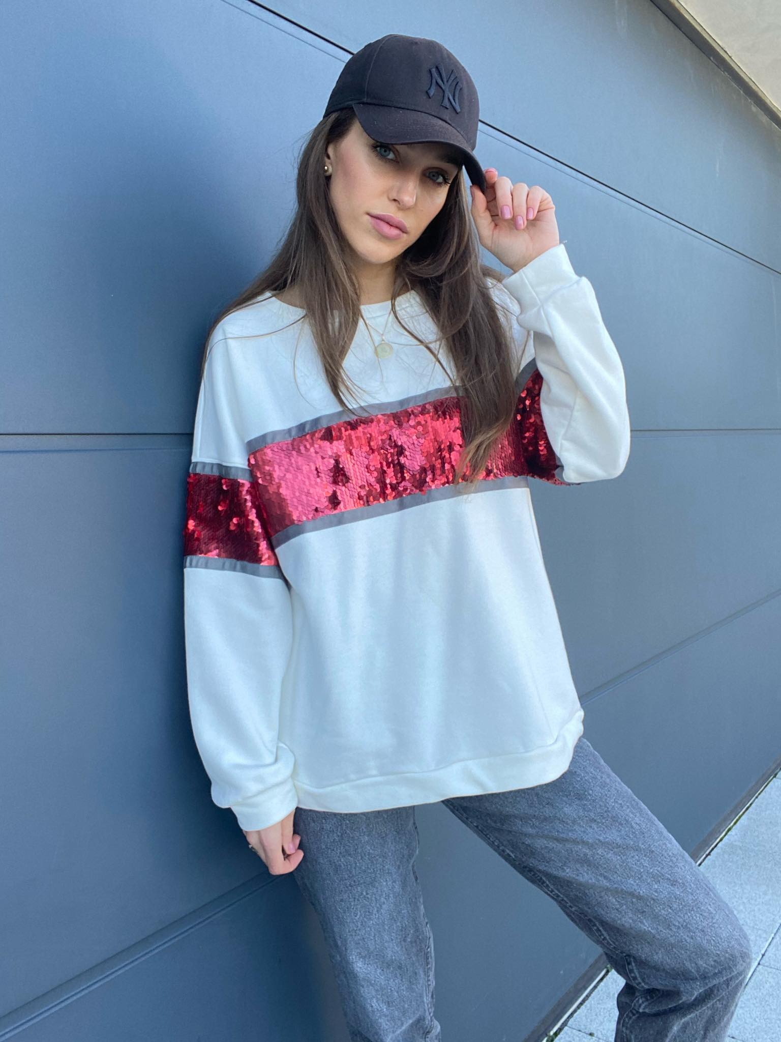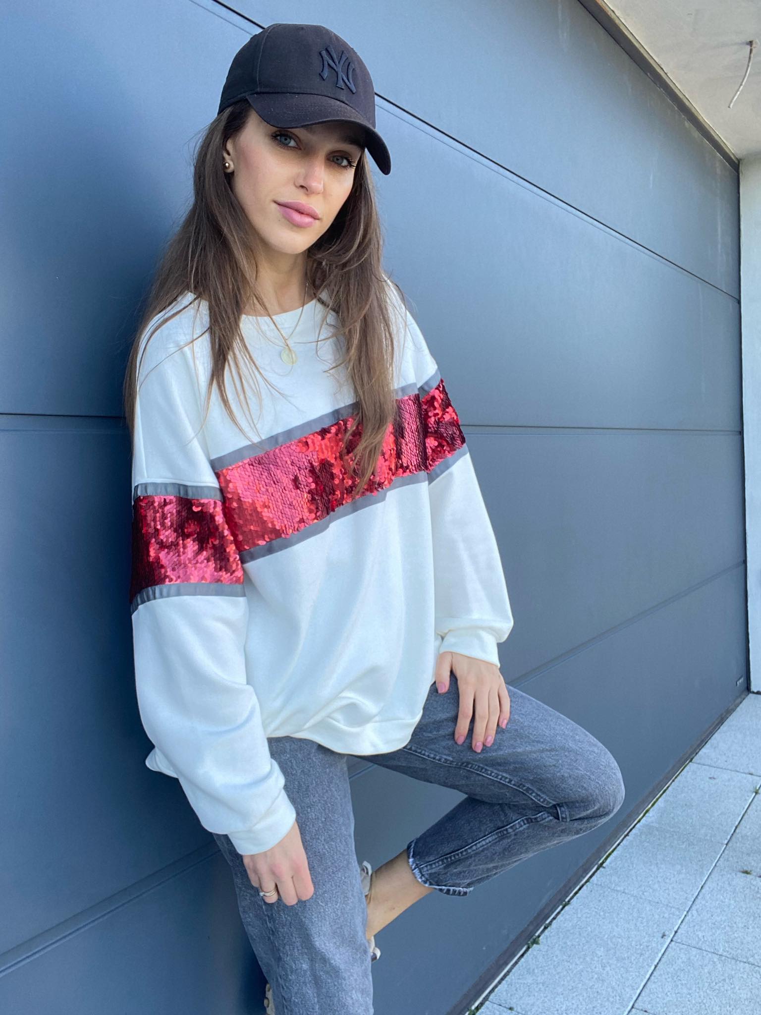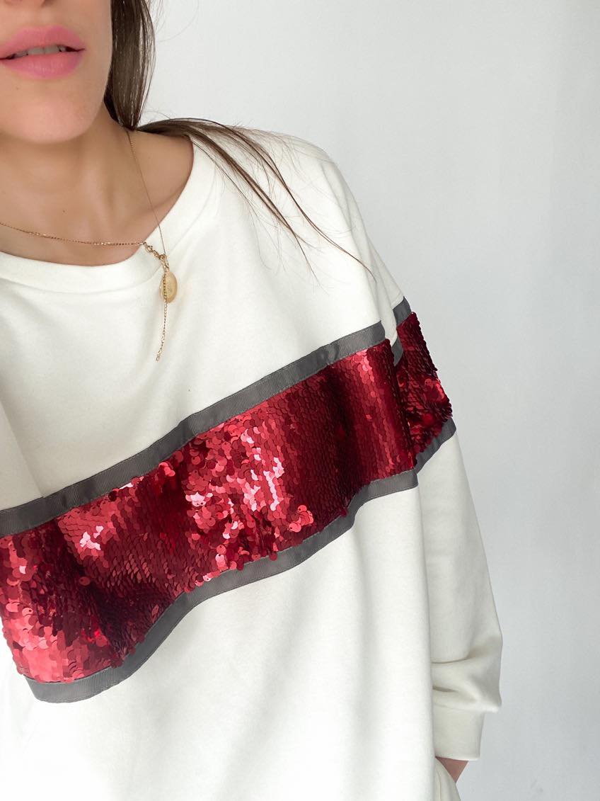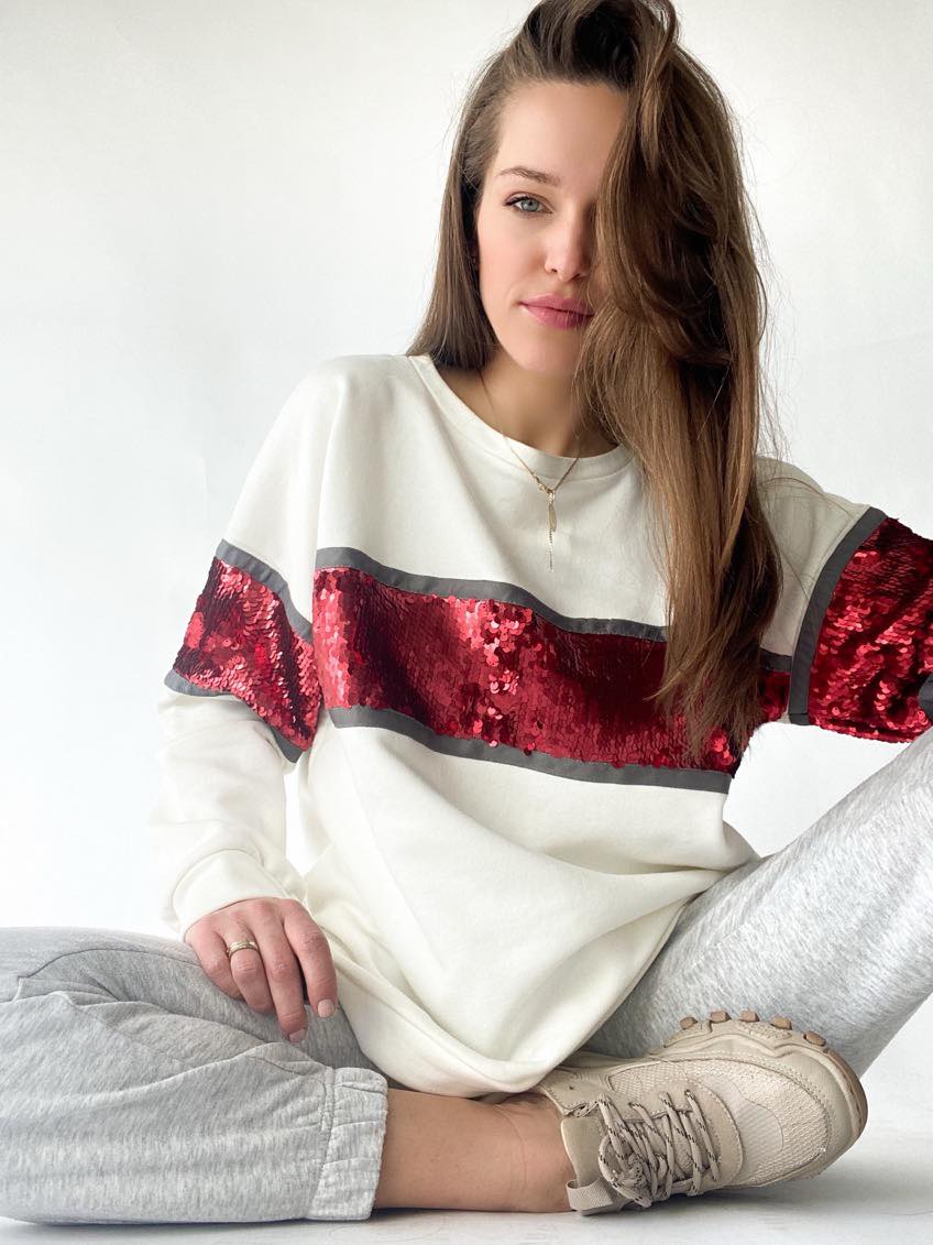 Dzięki czerwonej cekinowej wstawce bluza jest gwarancją oryginalnego looku.
