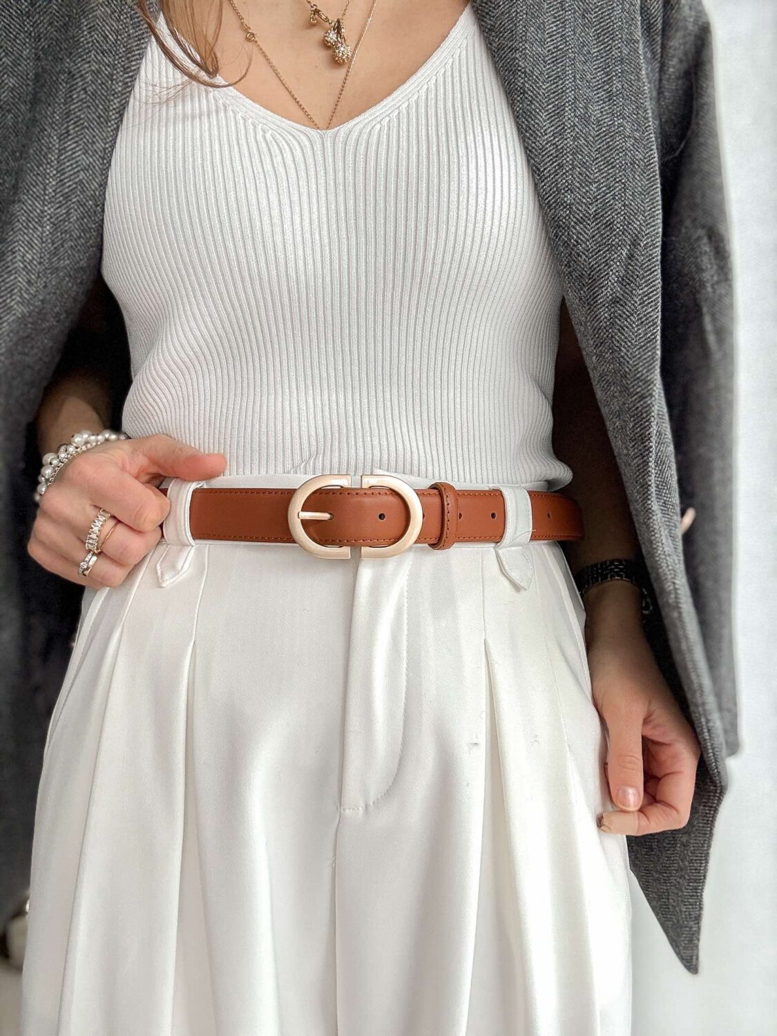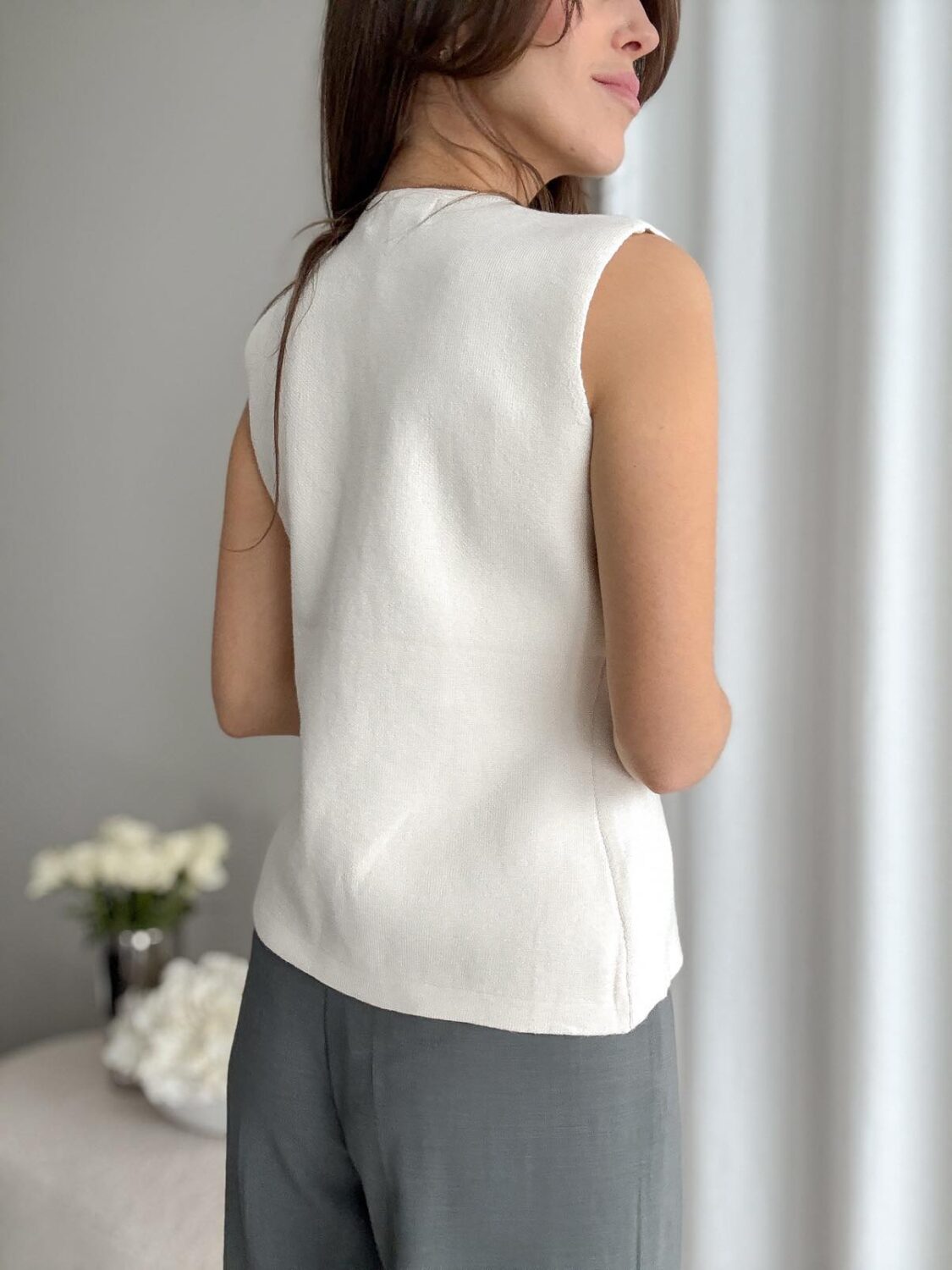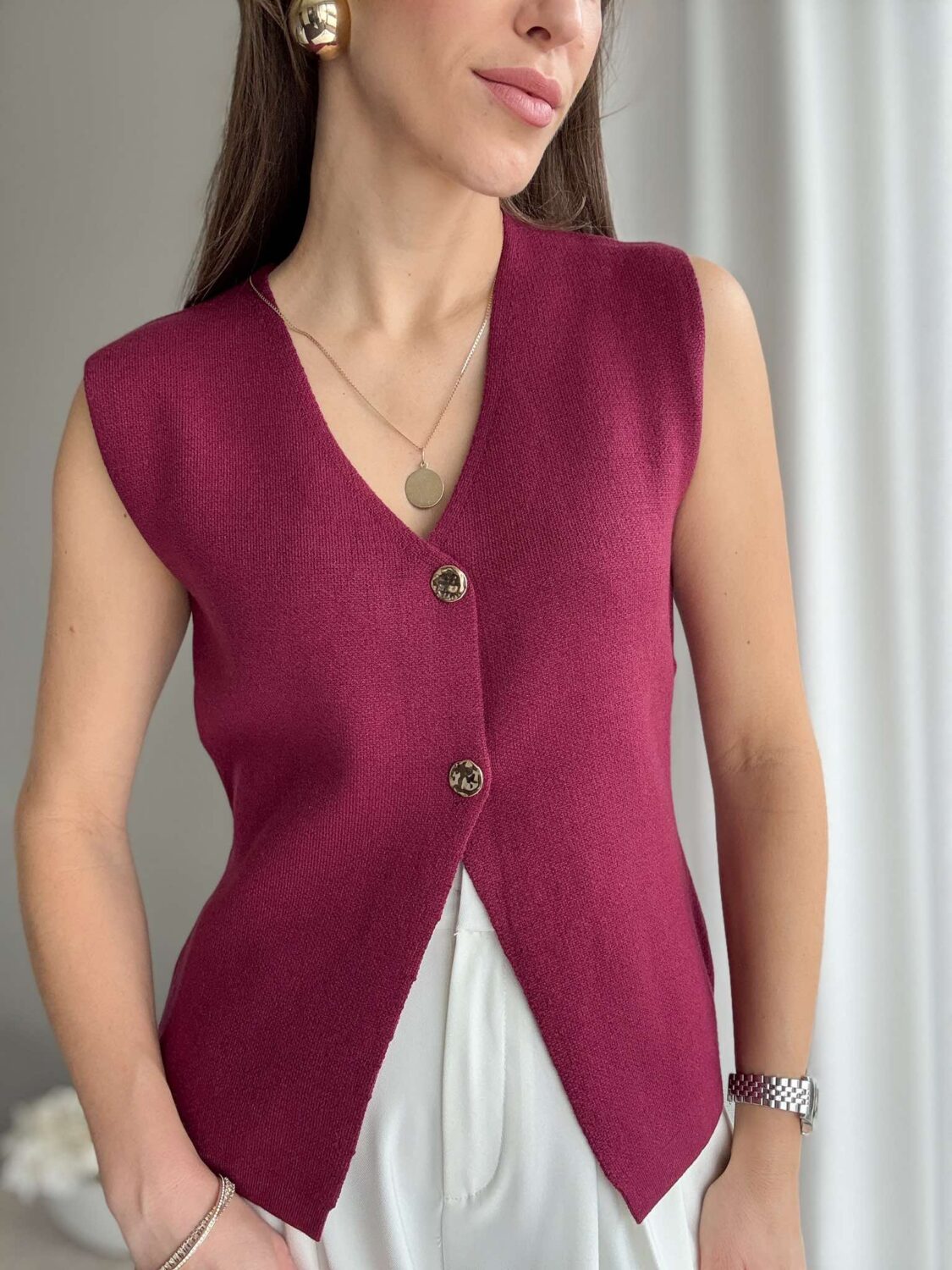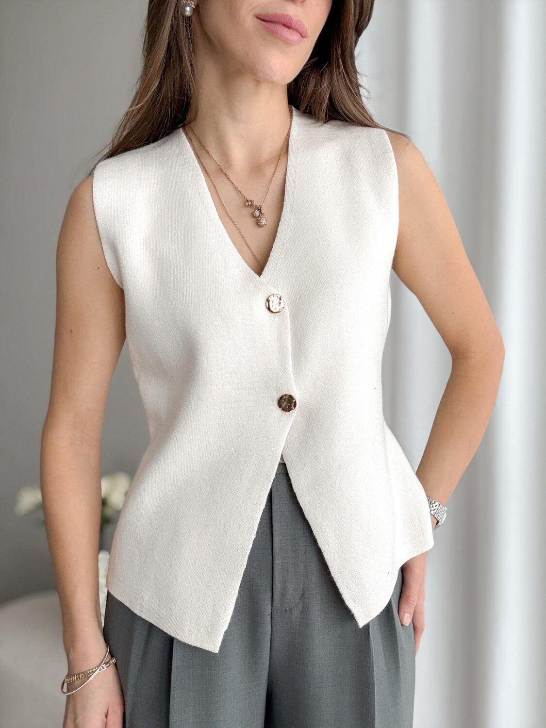 Dzianinowa bluzka bez rękawów, zapinana na 2 dekoracyjne złote guziki.