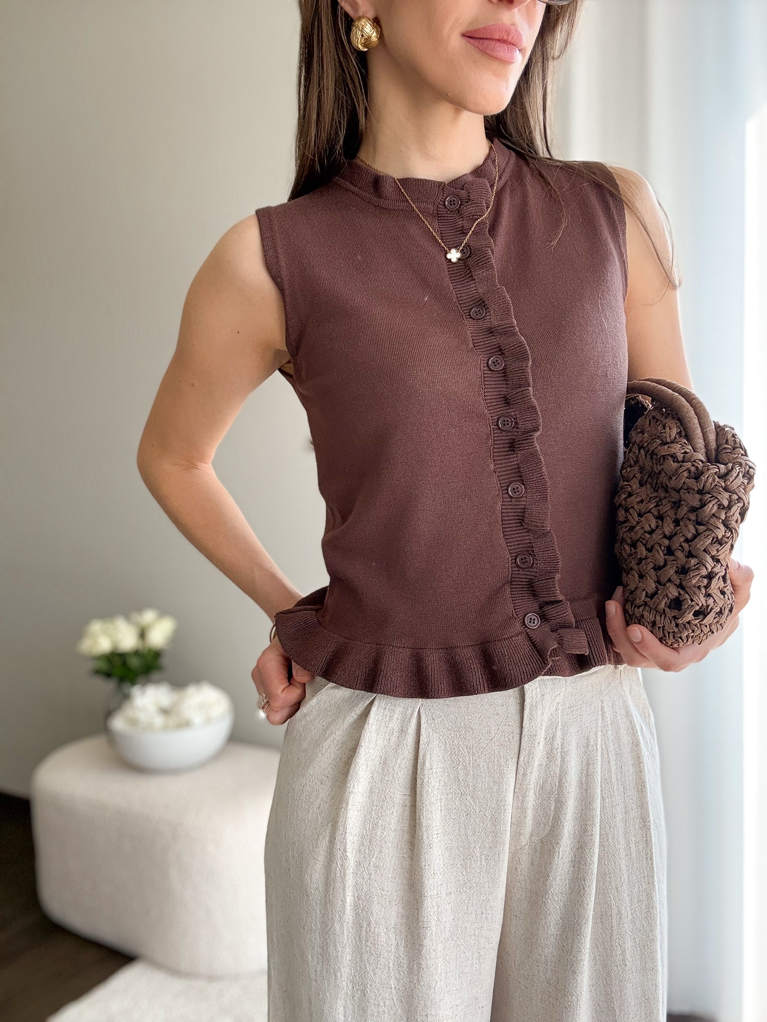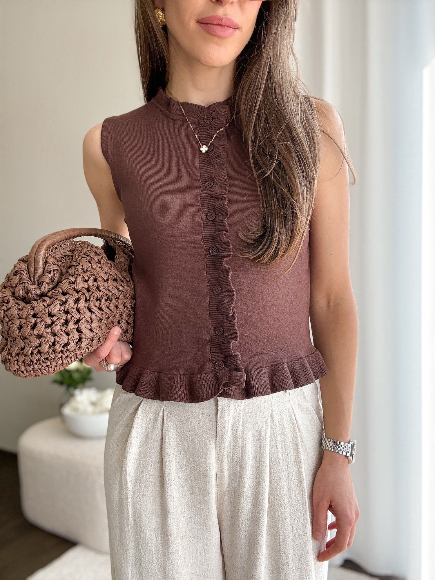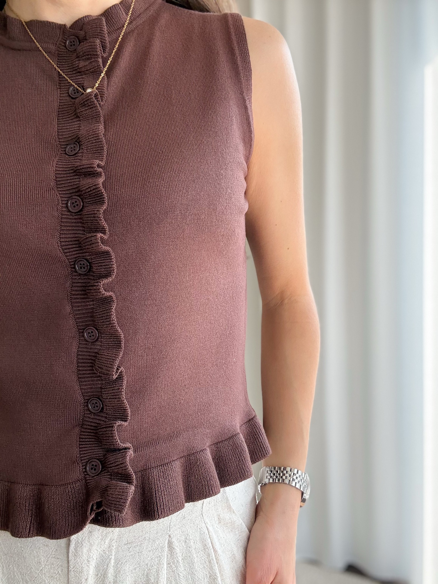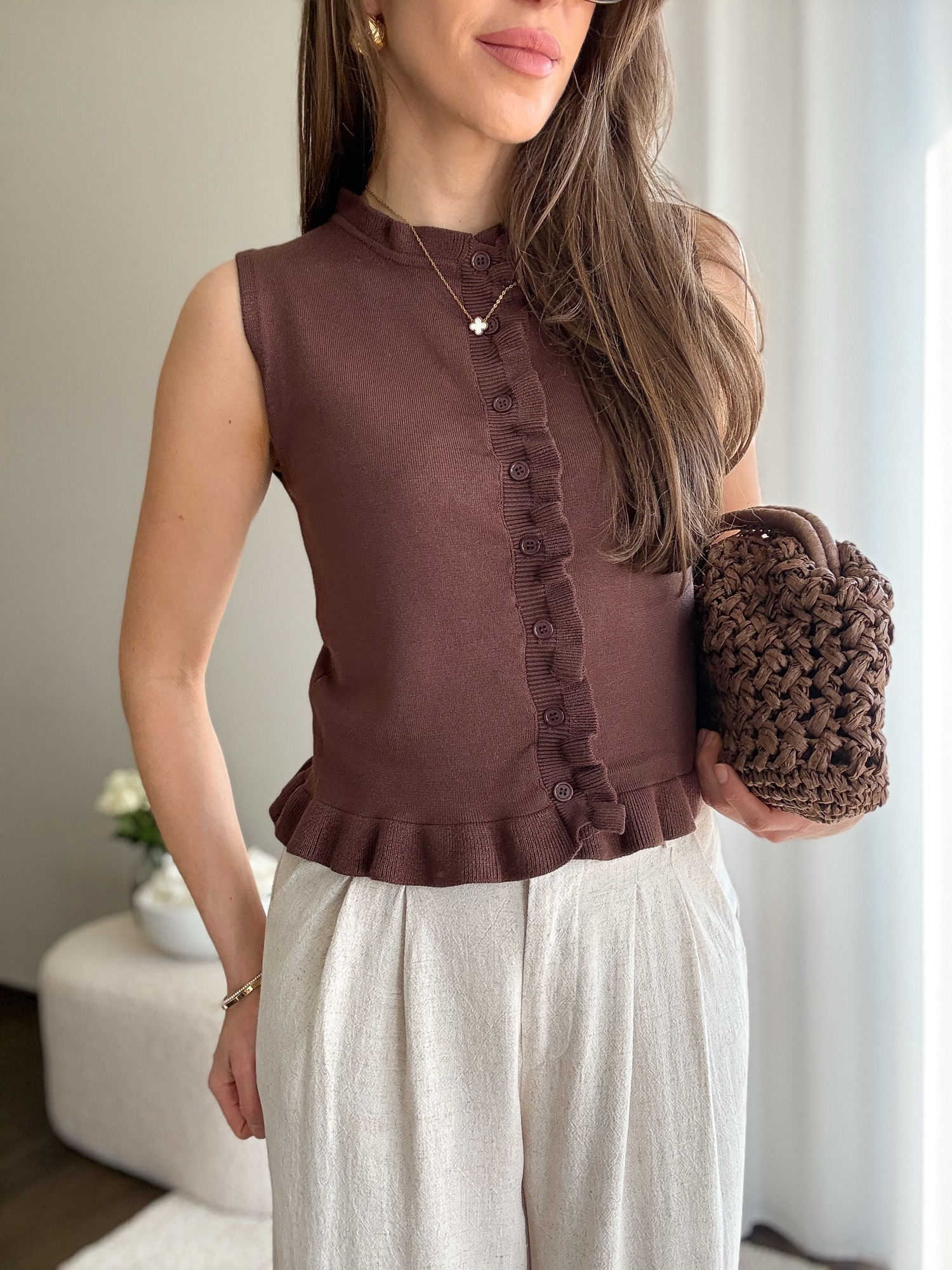 Dzianinowa bluzka bez rękawów, zapinana po całości na guziki.