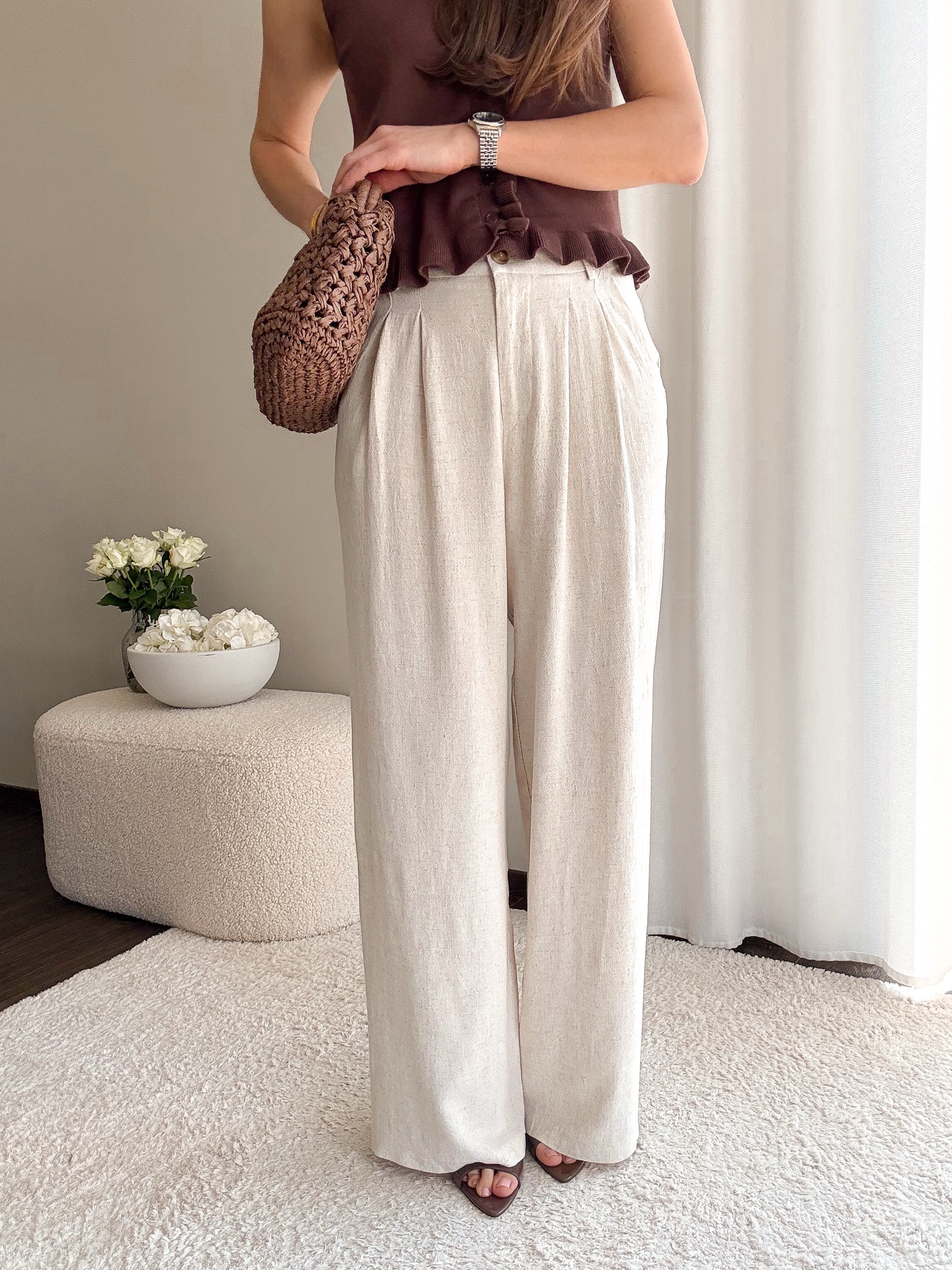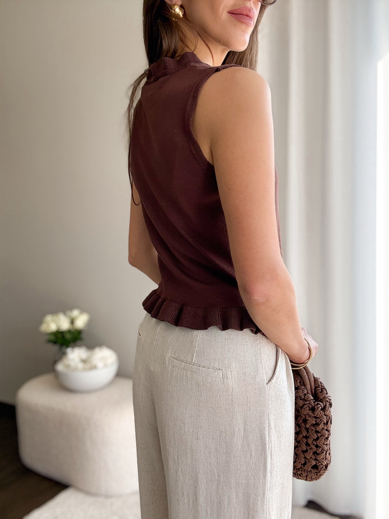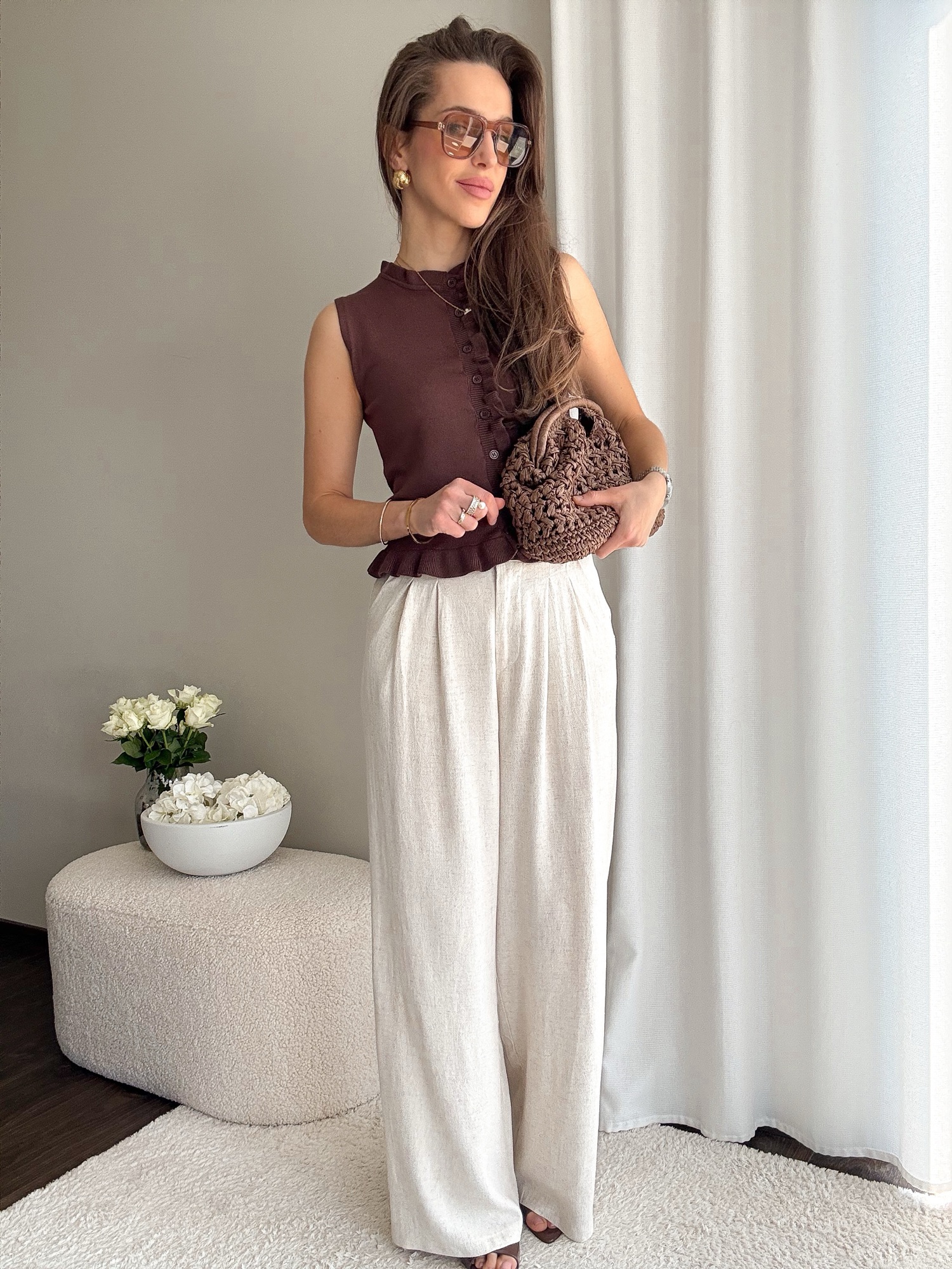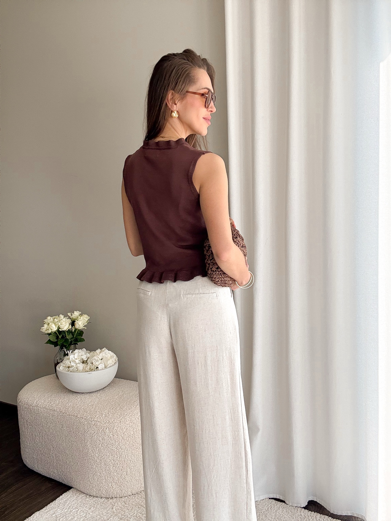 Dzianinowa bluzka bez rękawów, zapinana po całości na guziki.