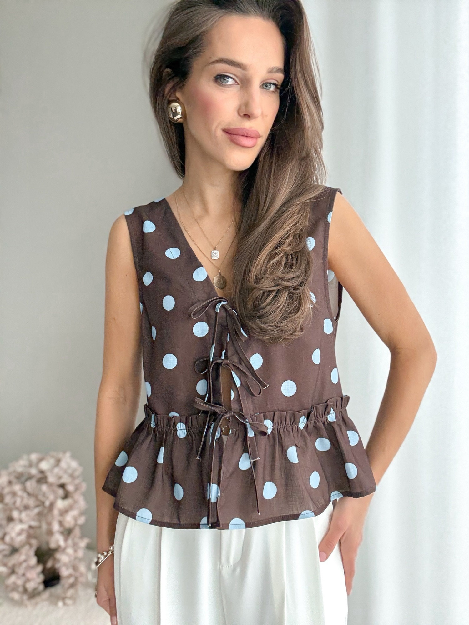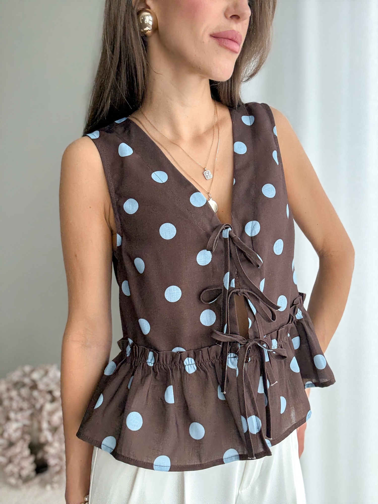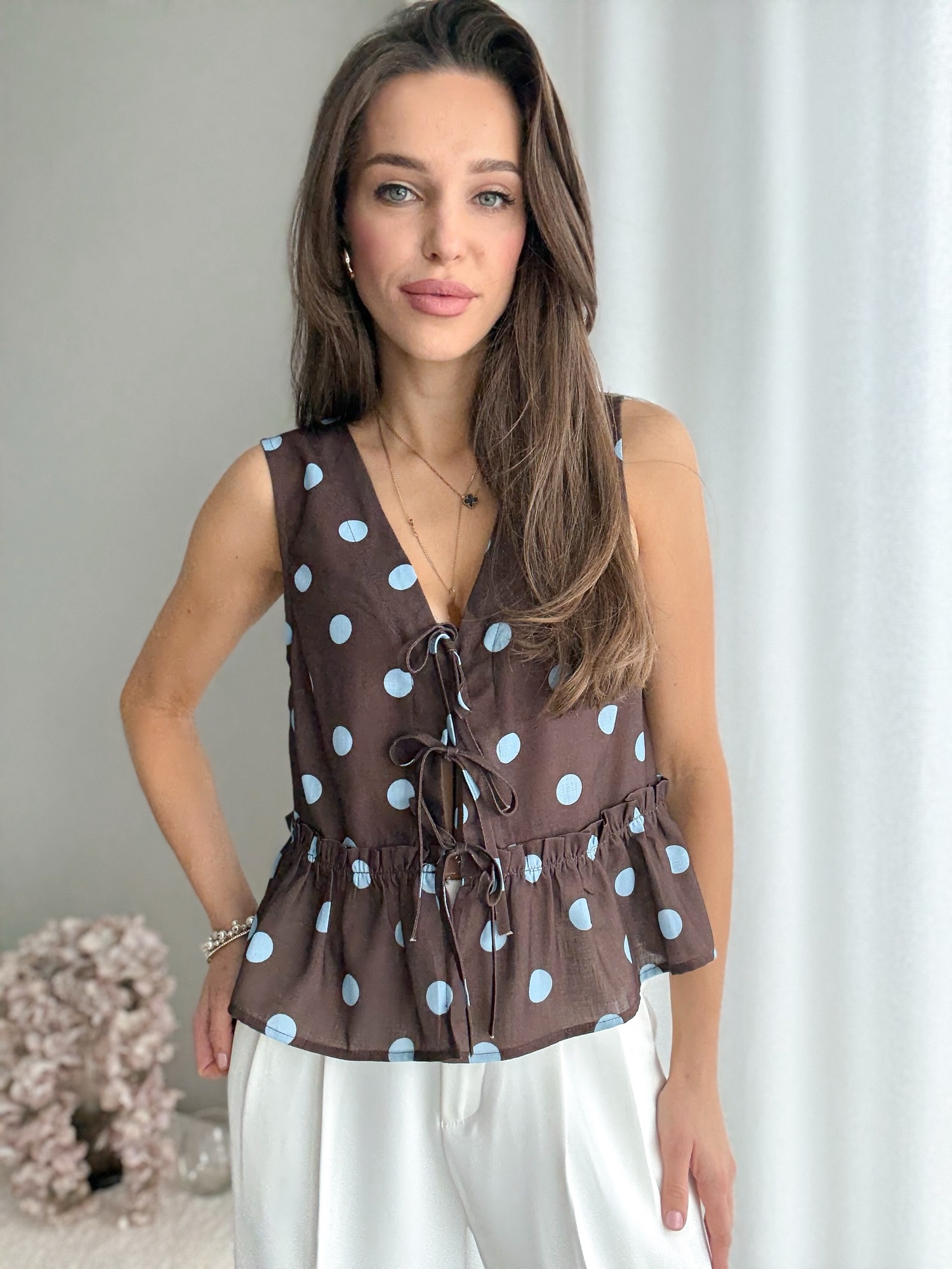 Bluzka w grochy z baskinką, zapinana na wiązane sznureczki.