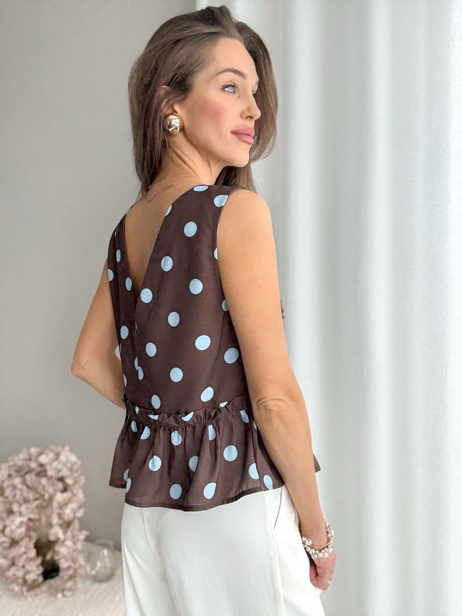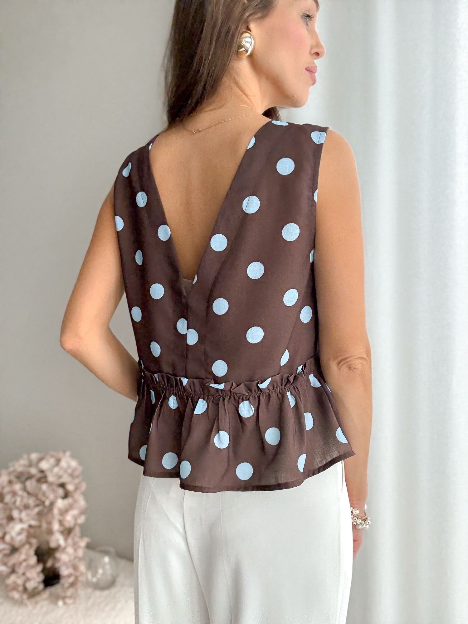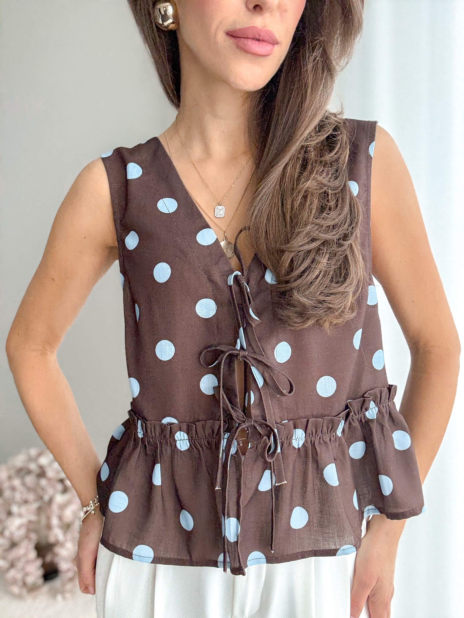 Bluzka w grochy z baskinką, zapinana na wiązane sznureczki.