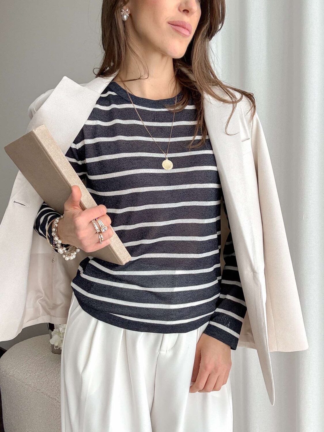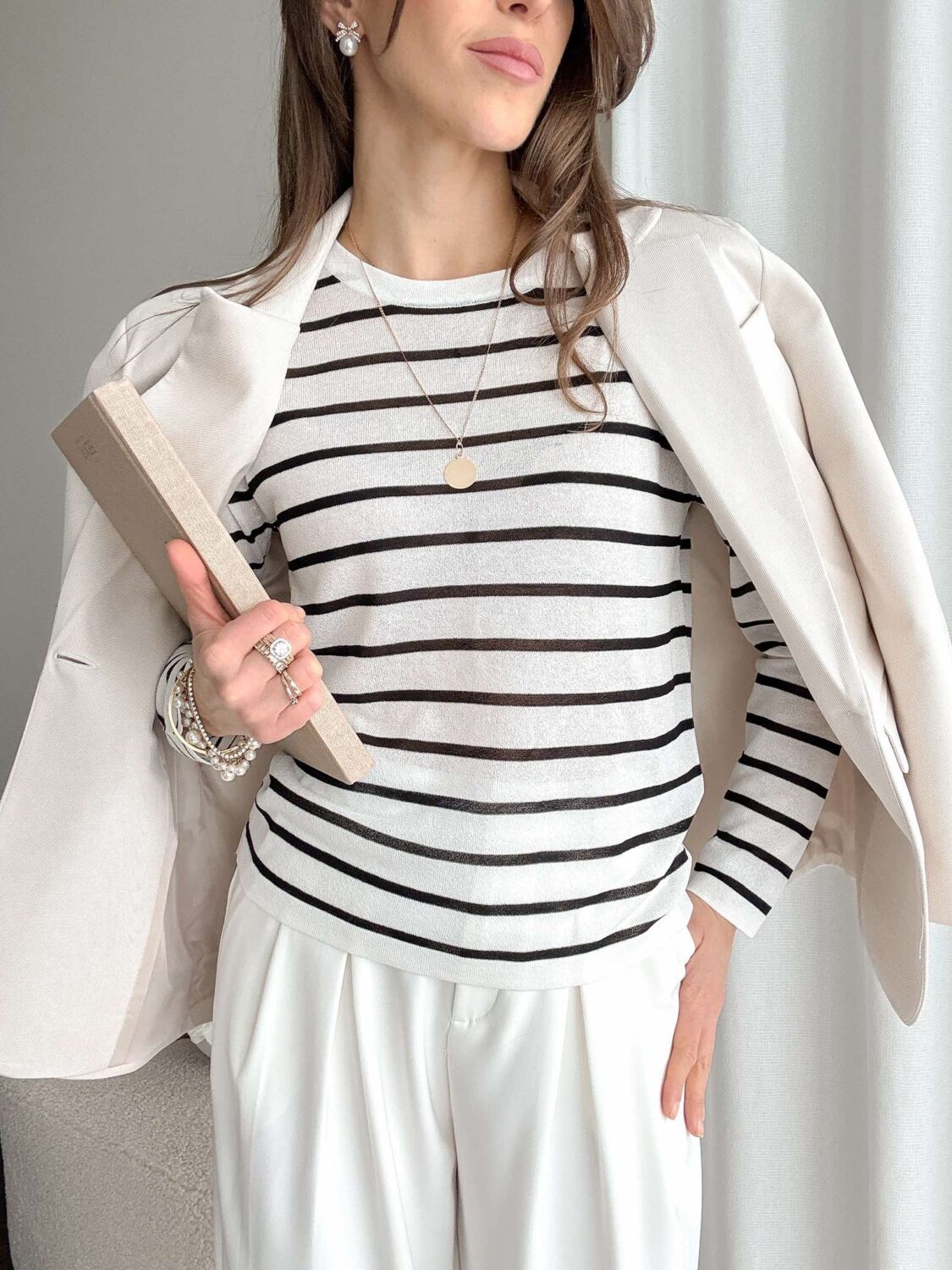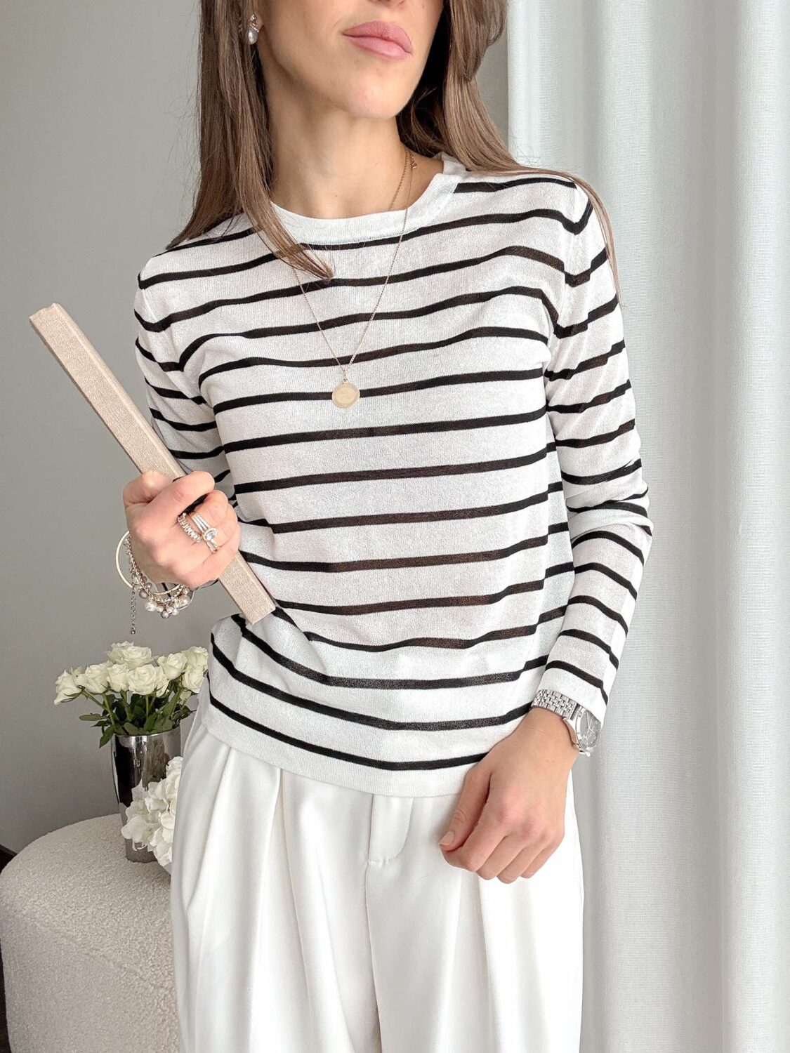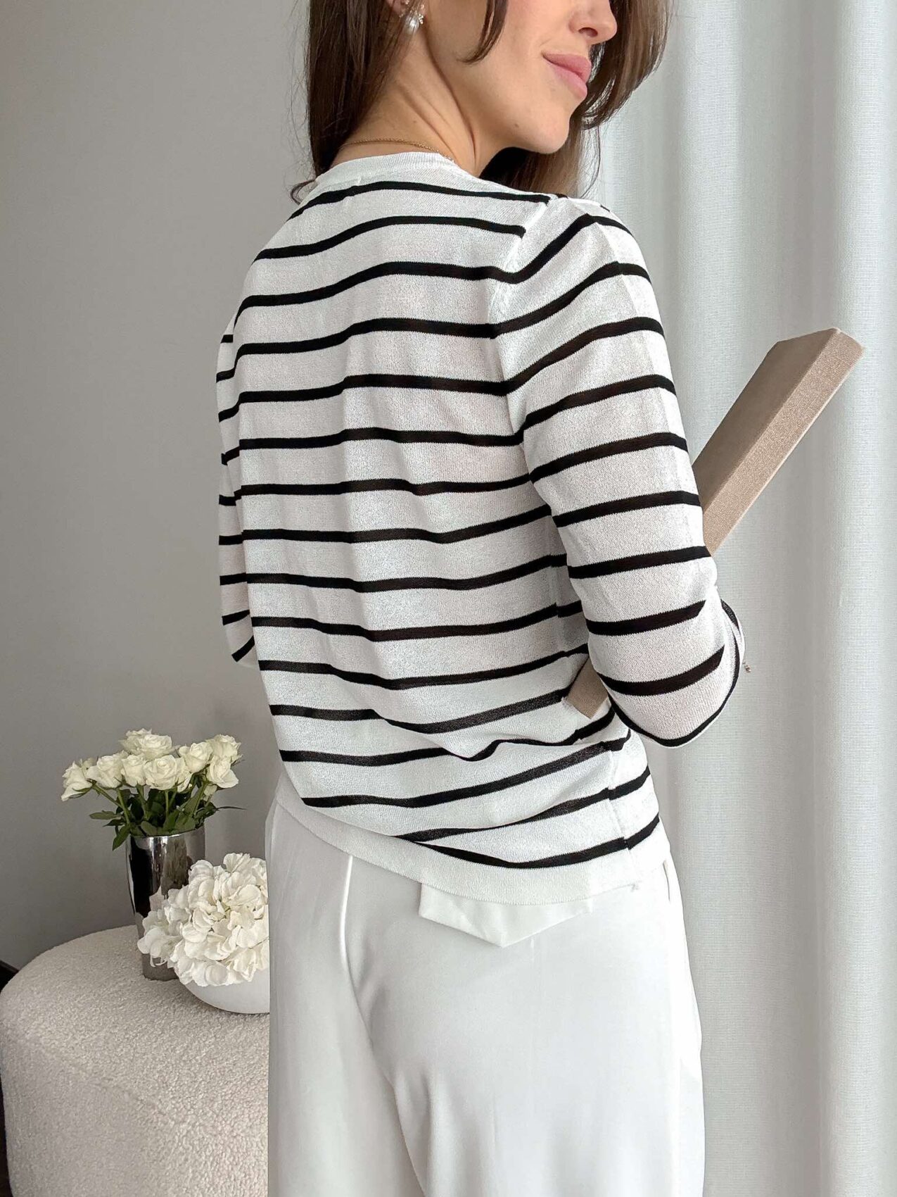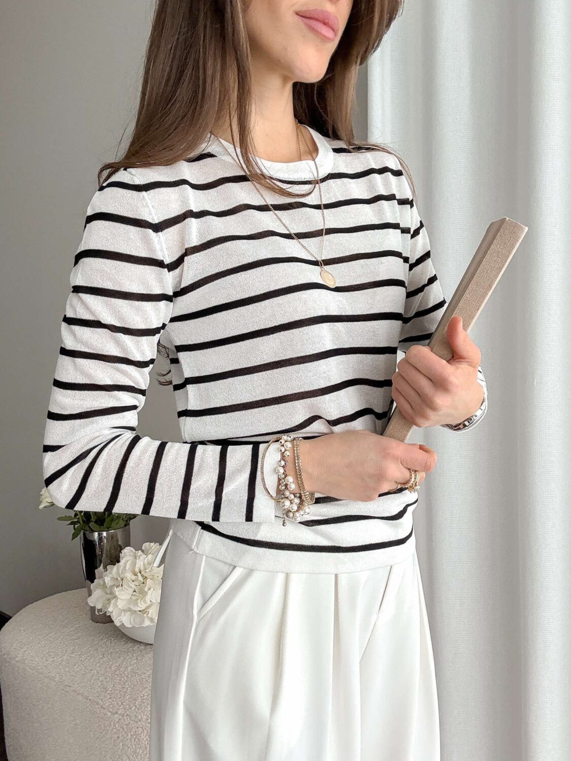 Sweter z delikatnej i przyjemnej dzianiny w wąskie paski.