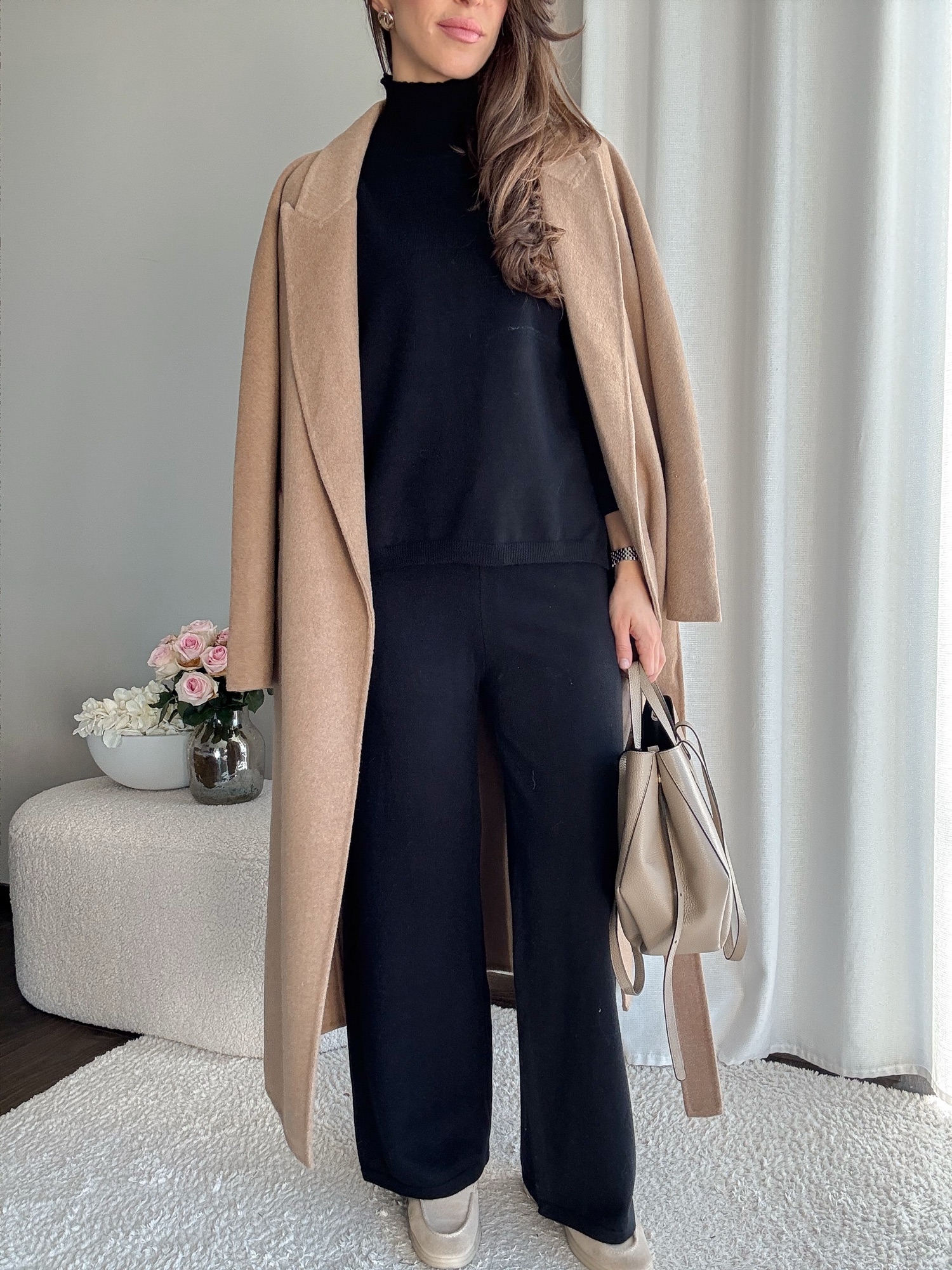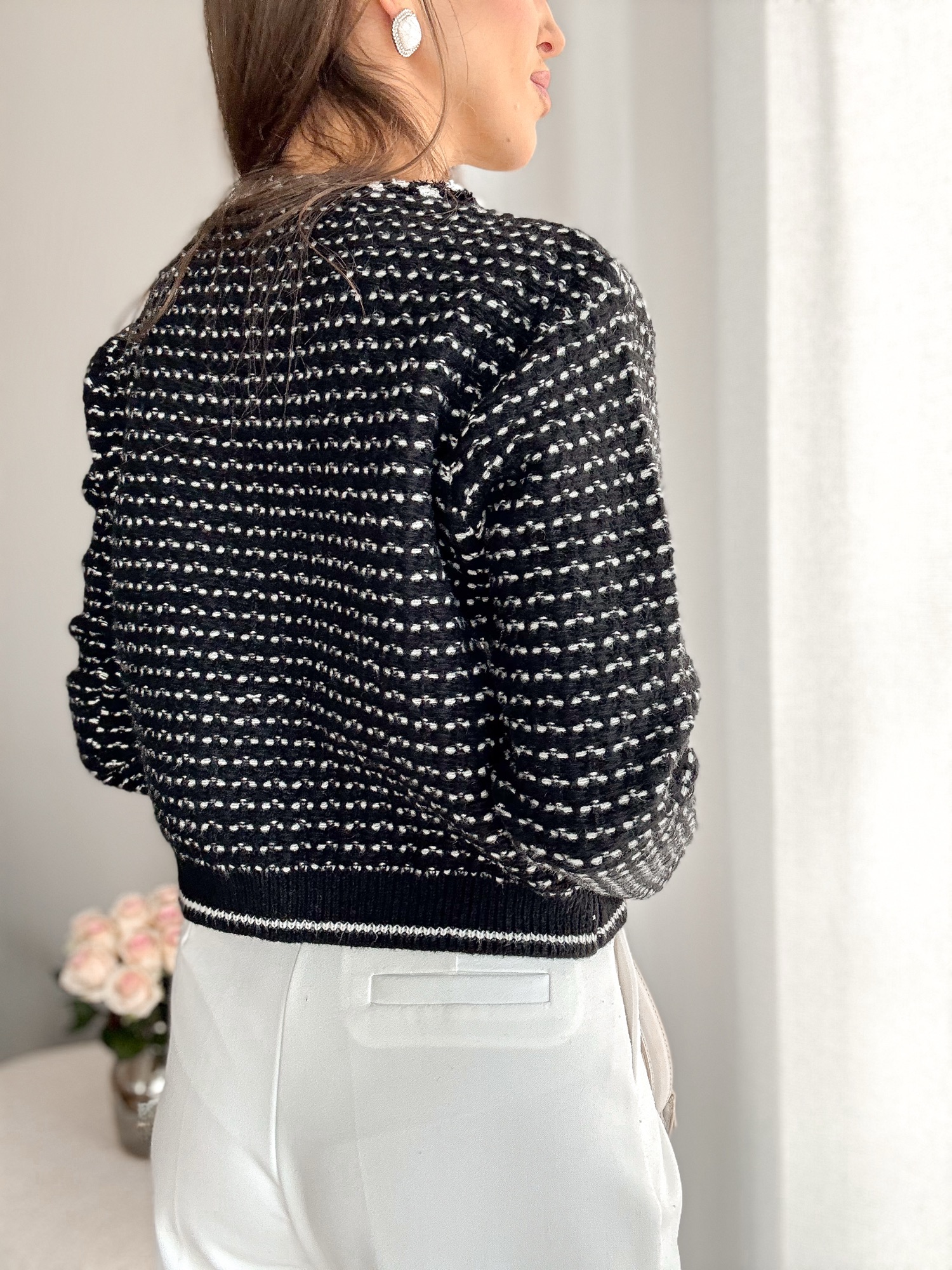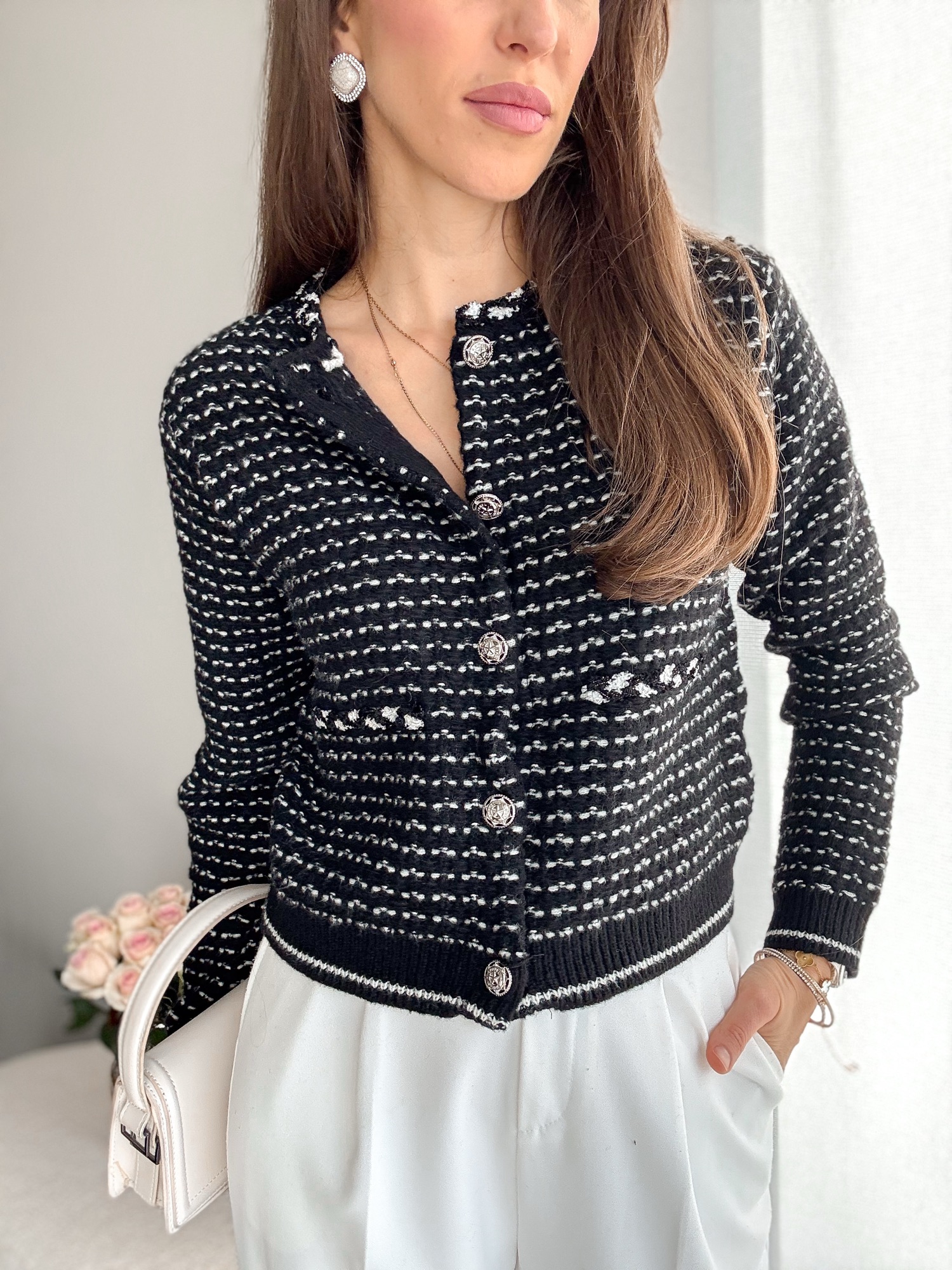 Cadigan czarno biały z ozdobnymi, biżuteryjnymi guzikami.