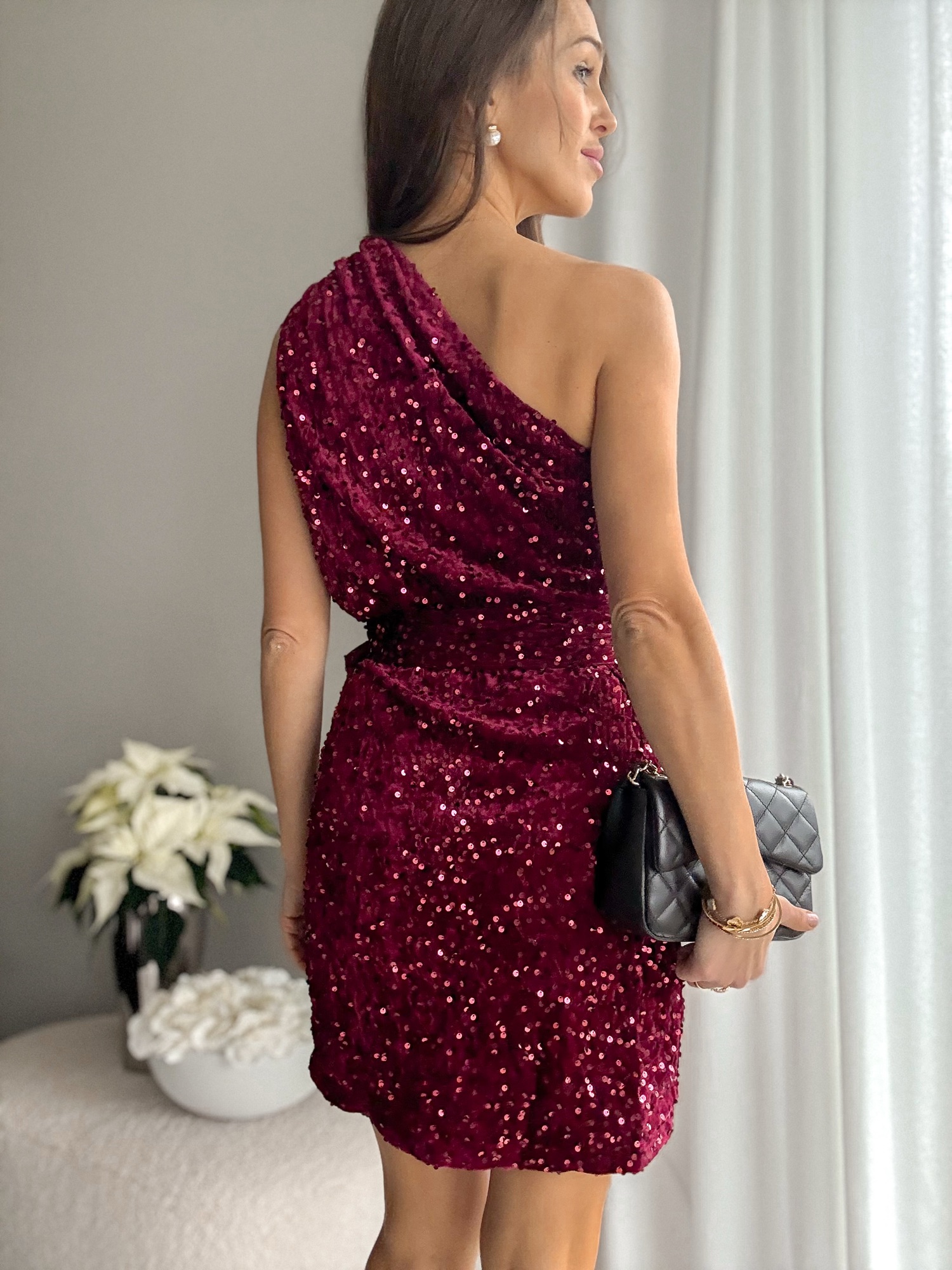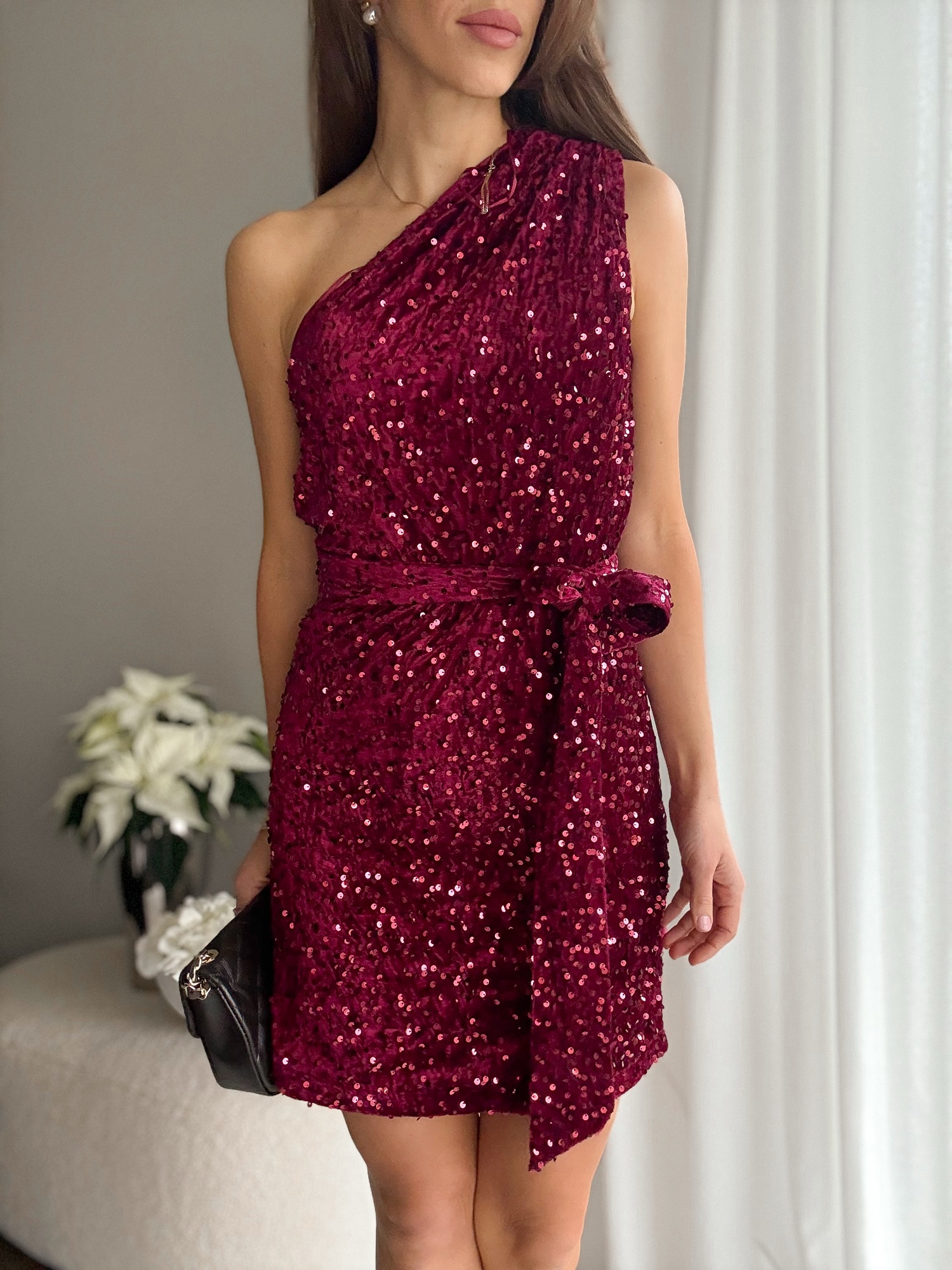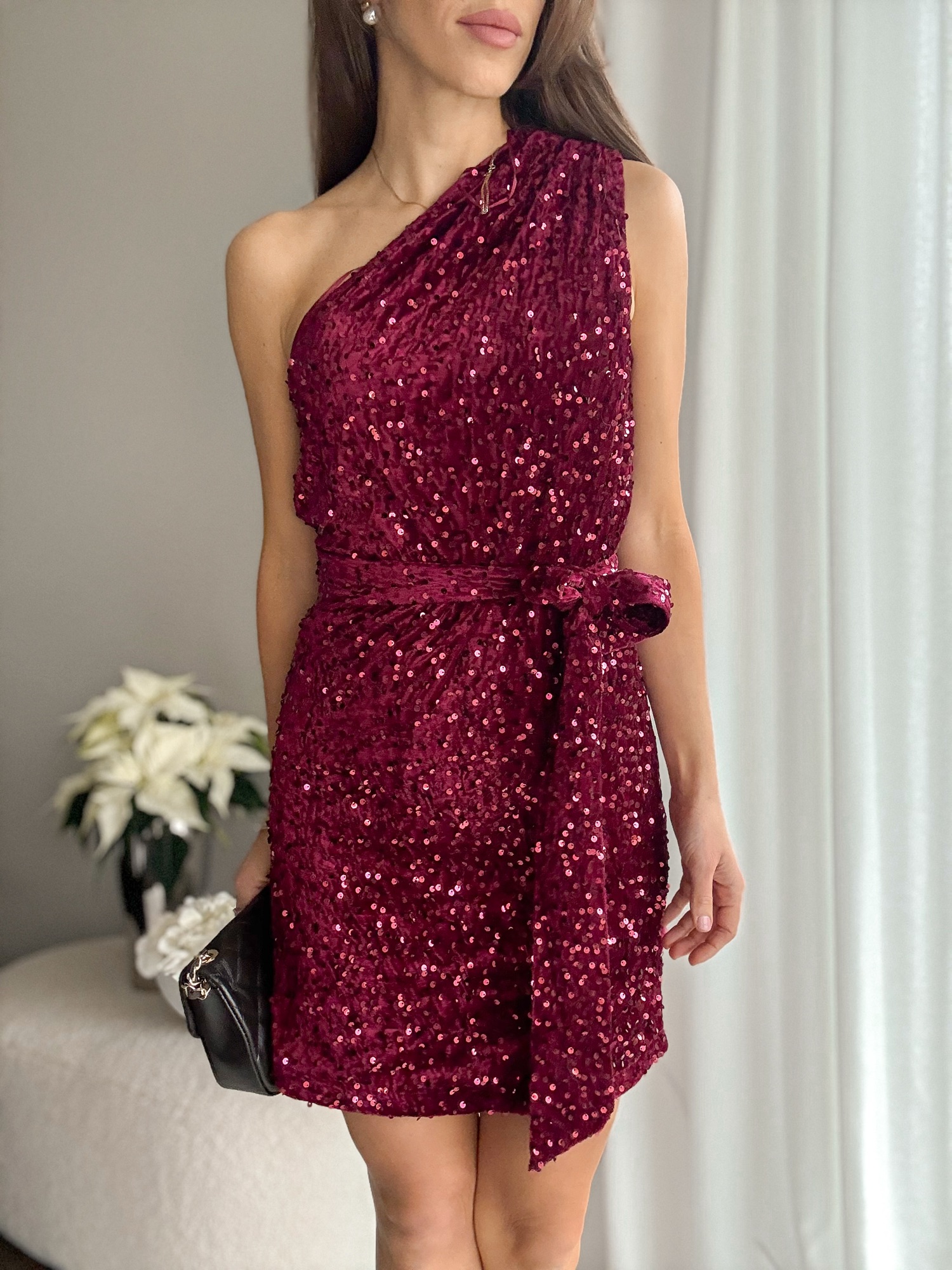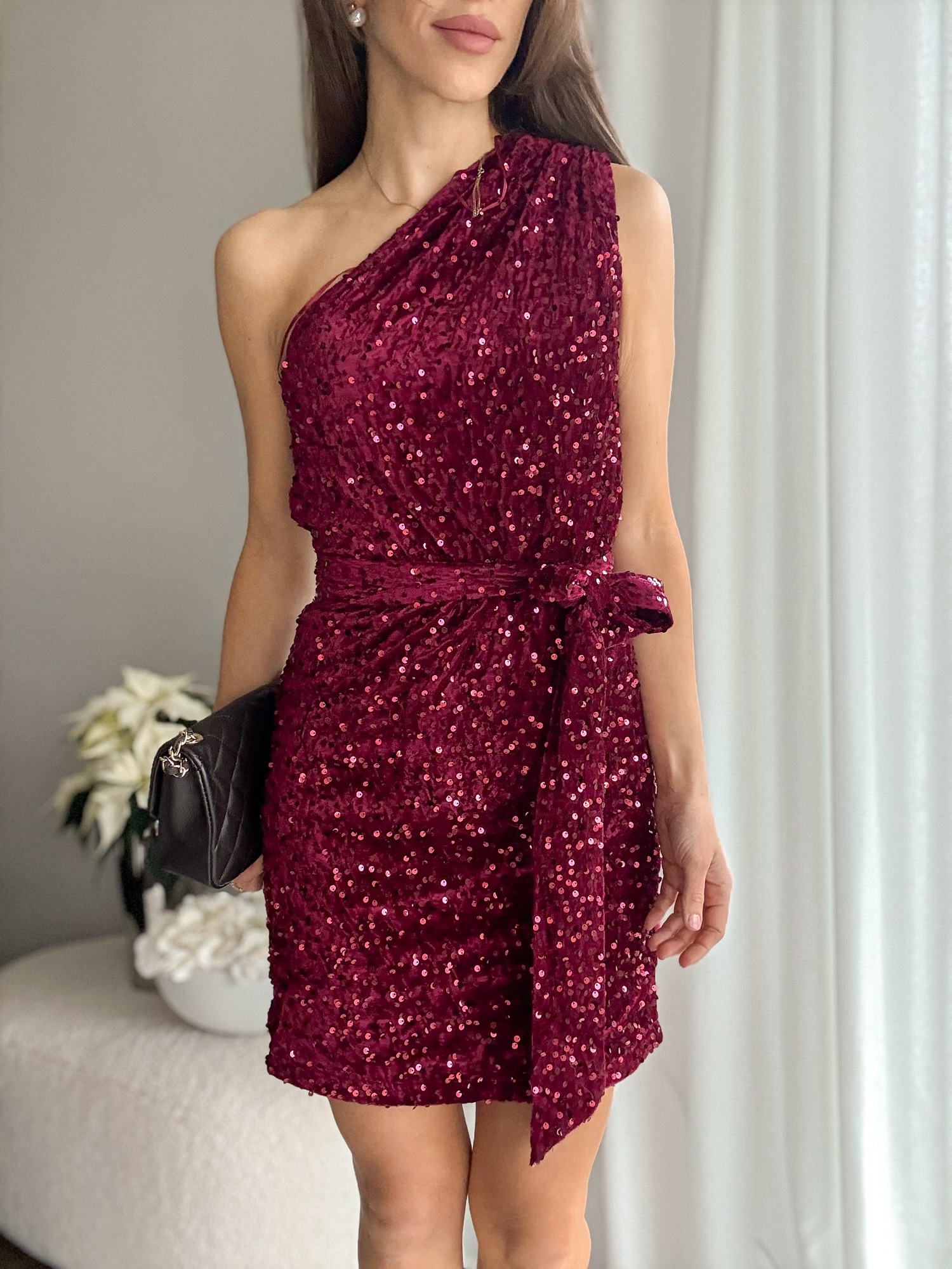 Cekinowa sukienka na jedno ramię burgund