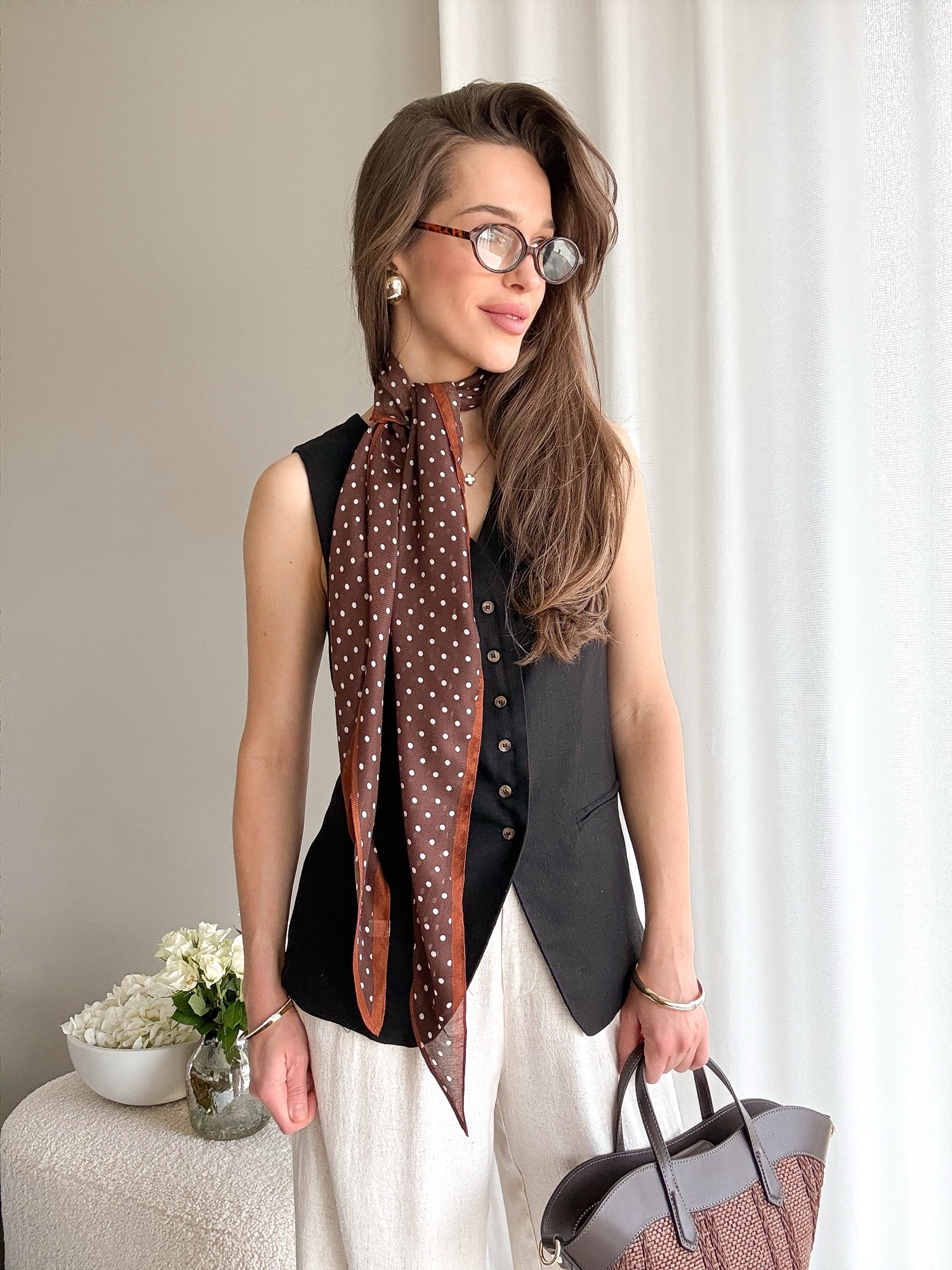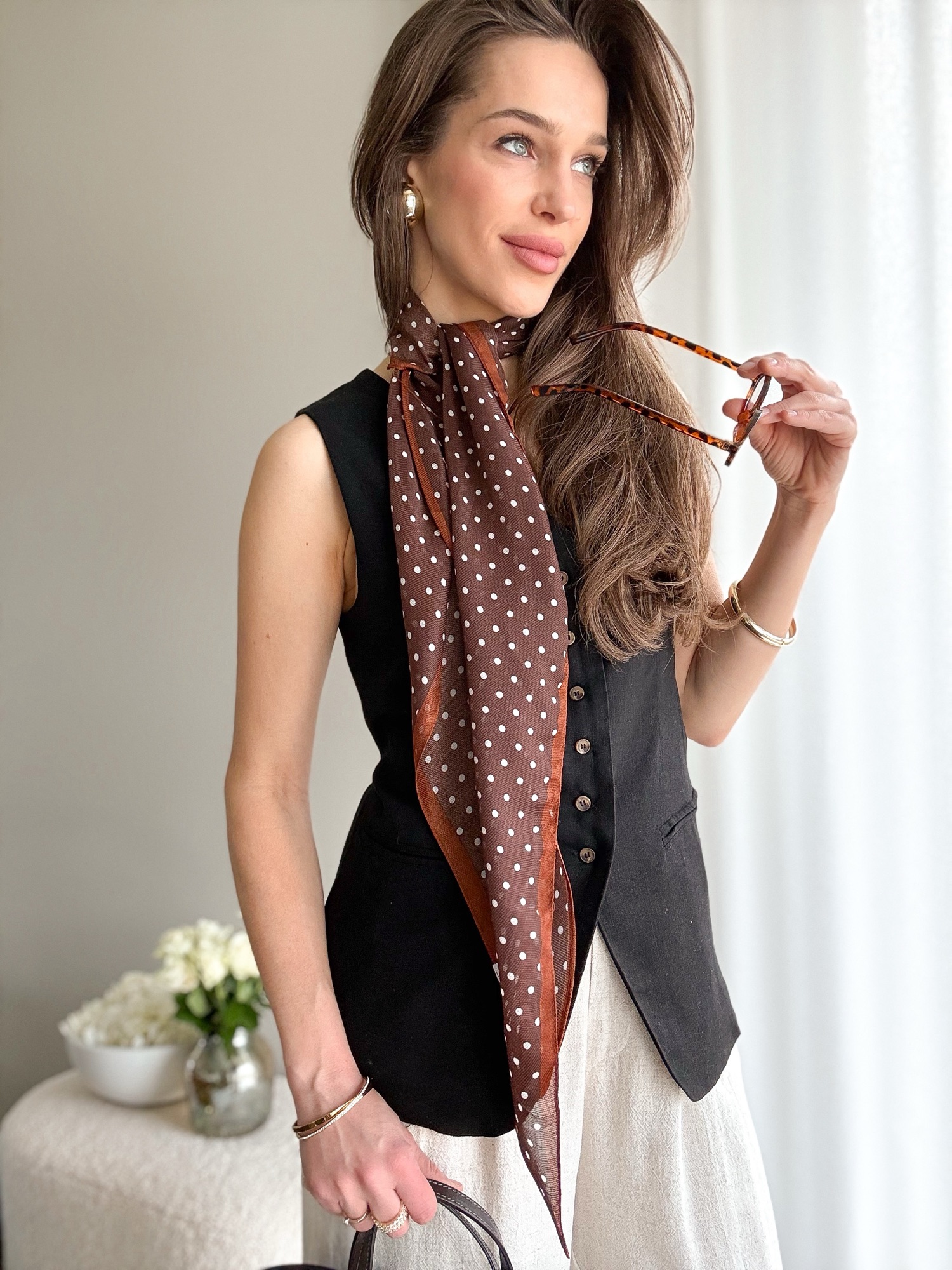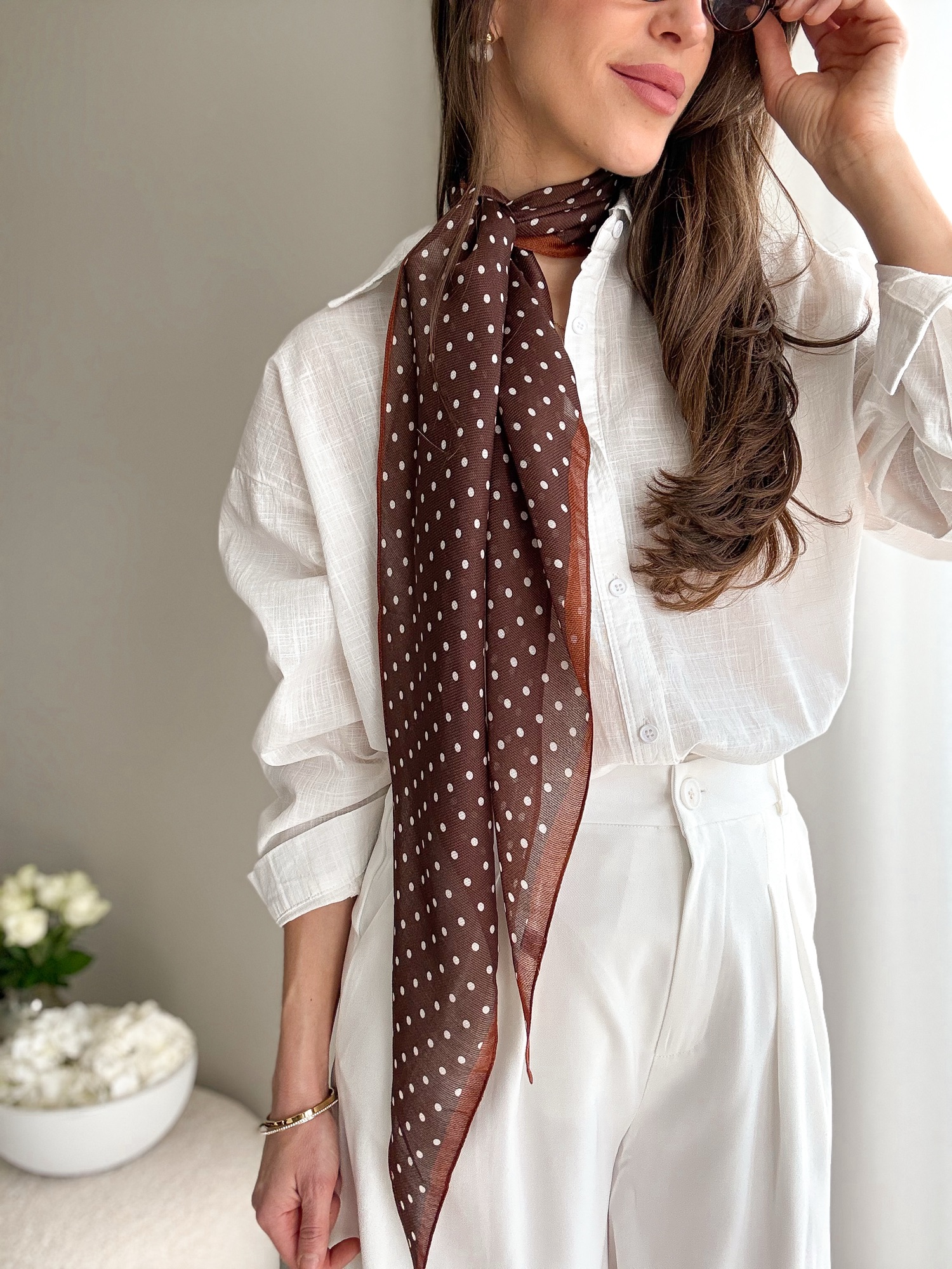 Cieniutka apaszka w kropki wykonana z wiskozy i bawełny w kształcie trójkąta.