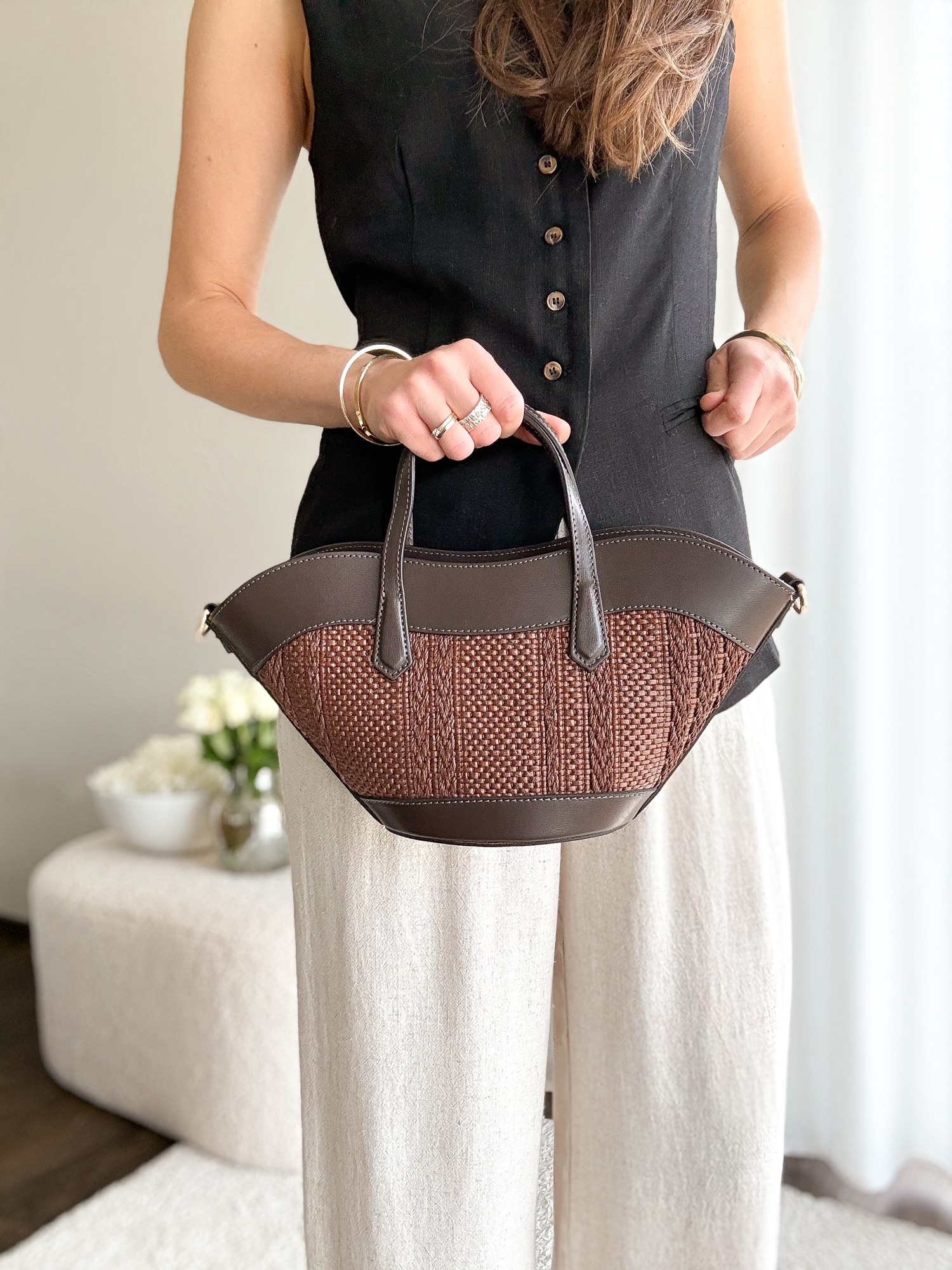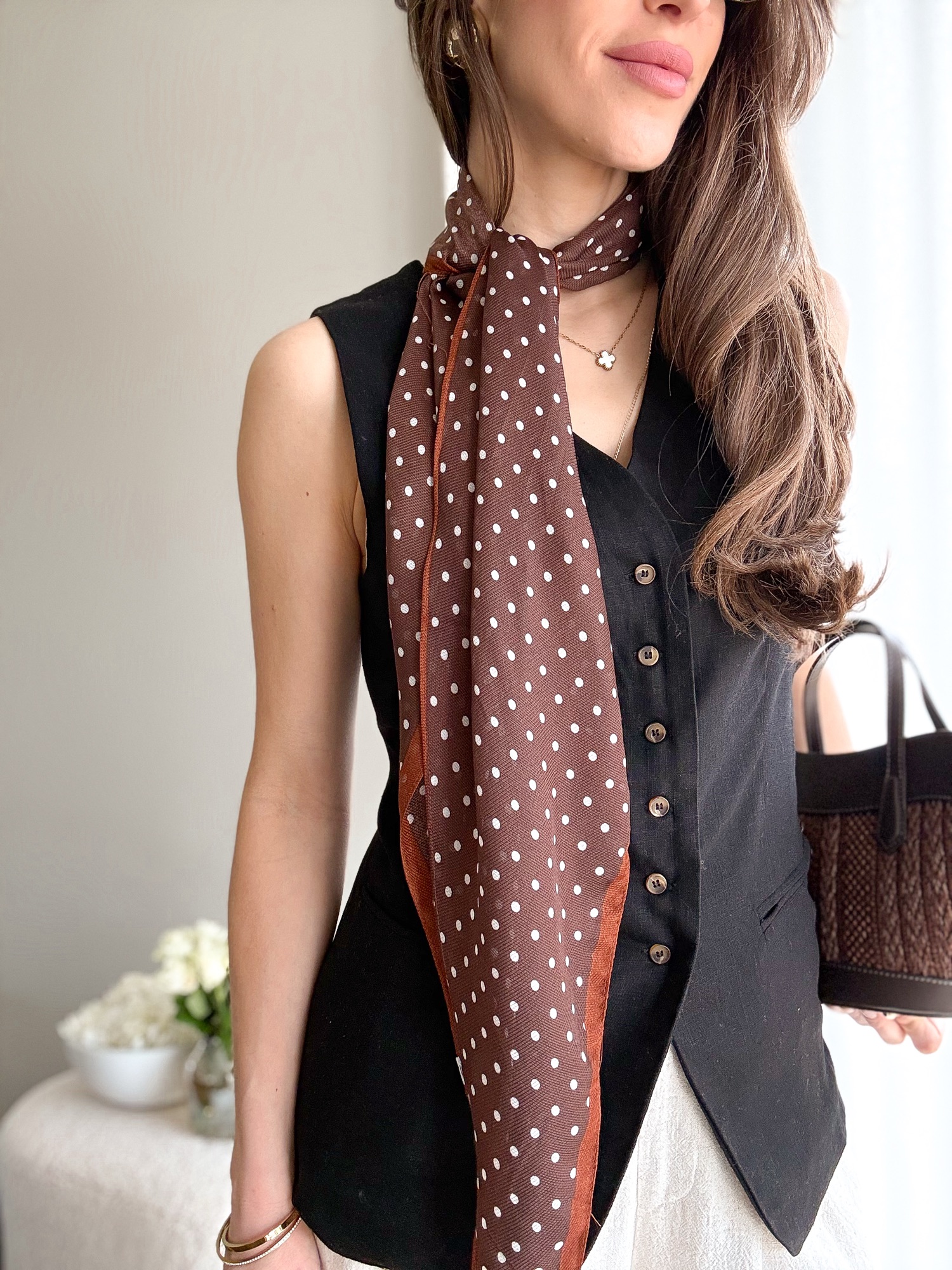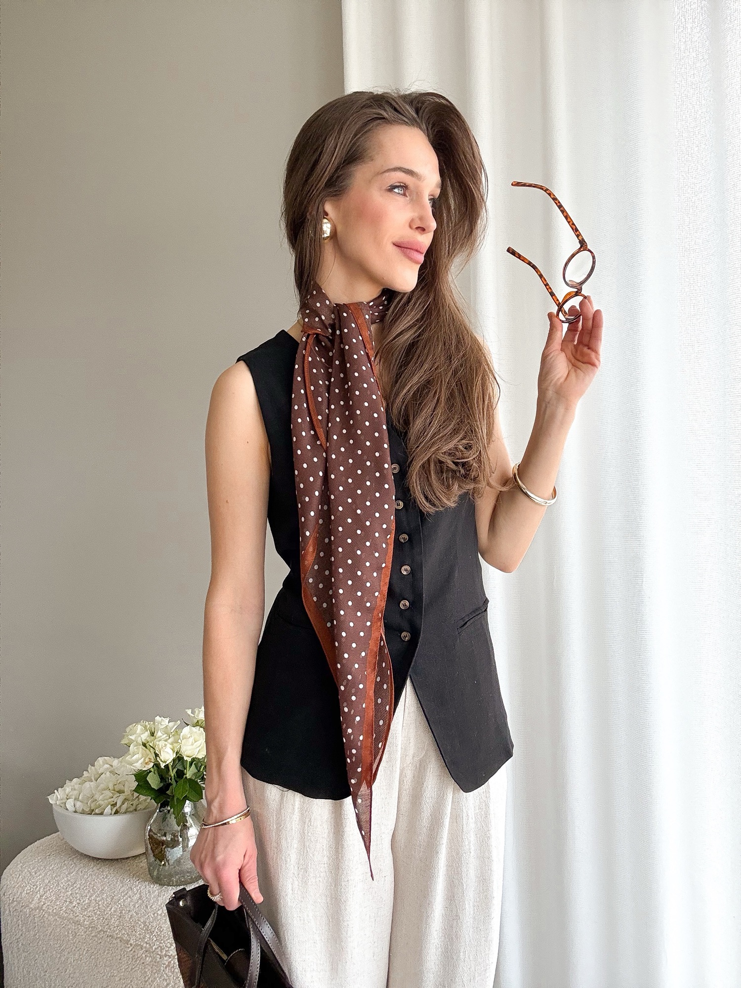 Cieniutka apaszka w kropki wykonana z wiskozy i bawełny w kształcie trójkąta.