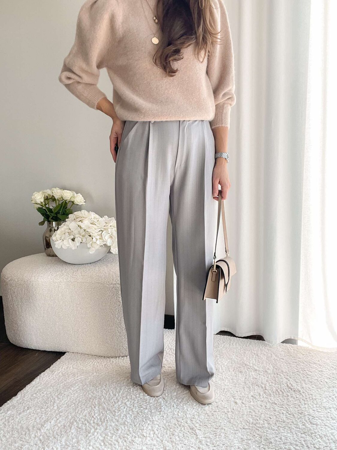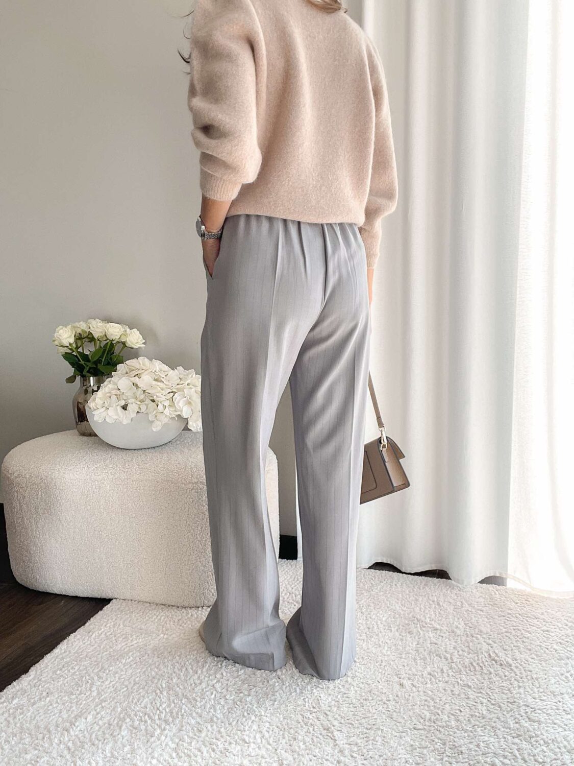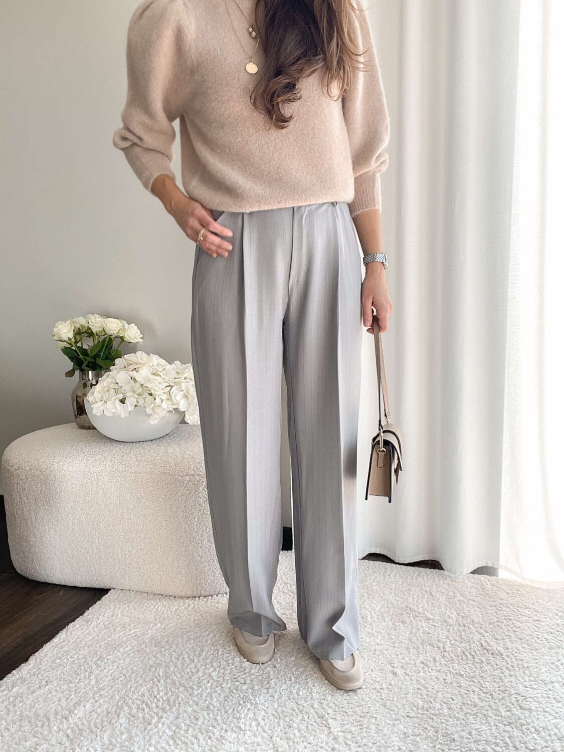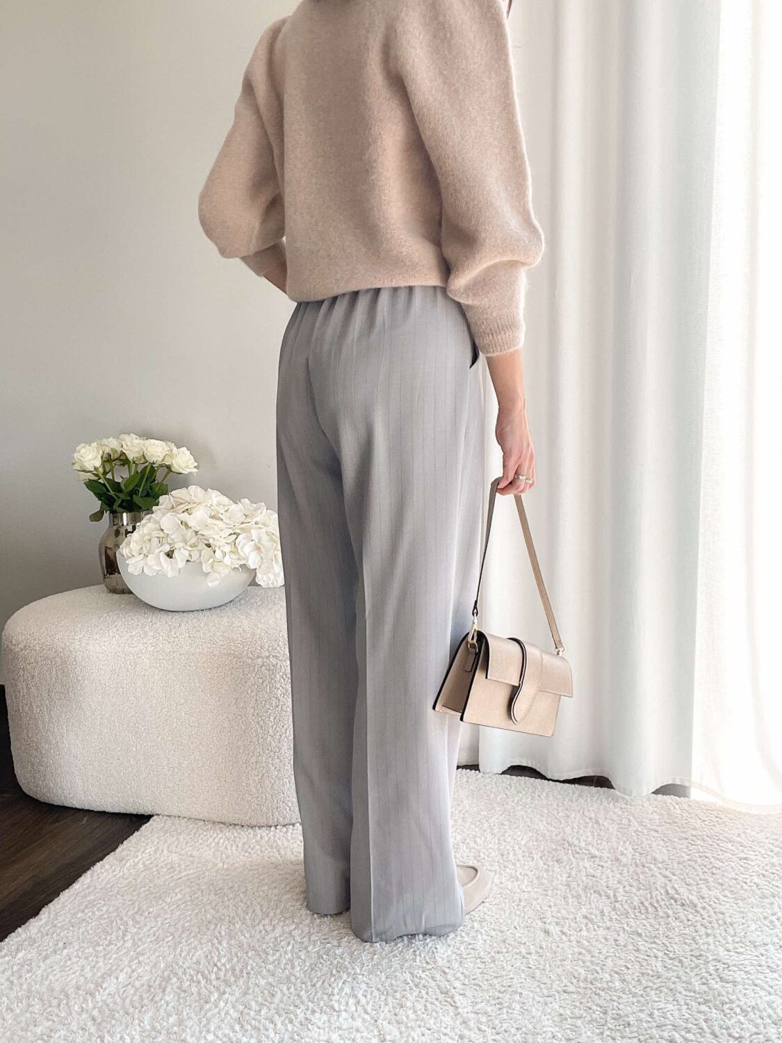 Garniturowe spodnie o luźnym fasonie, szerokich nogawkach.