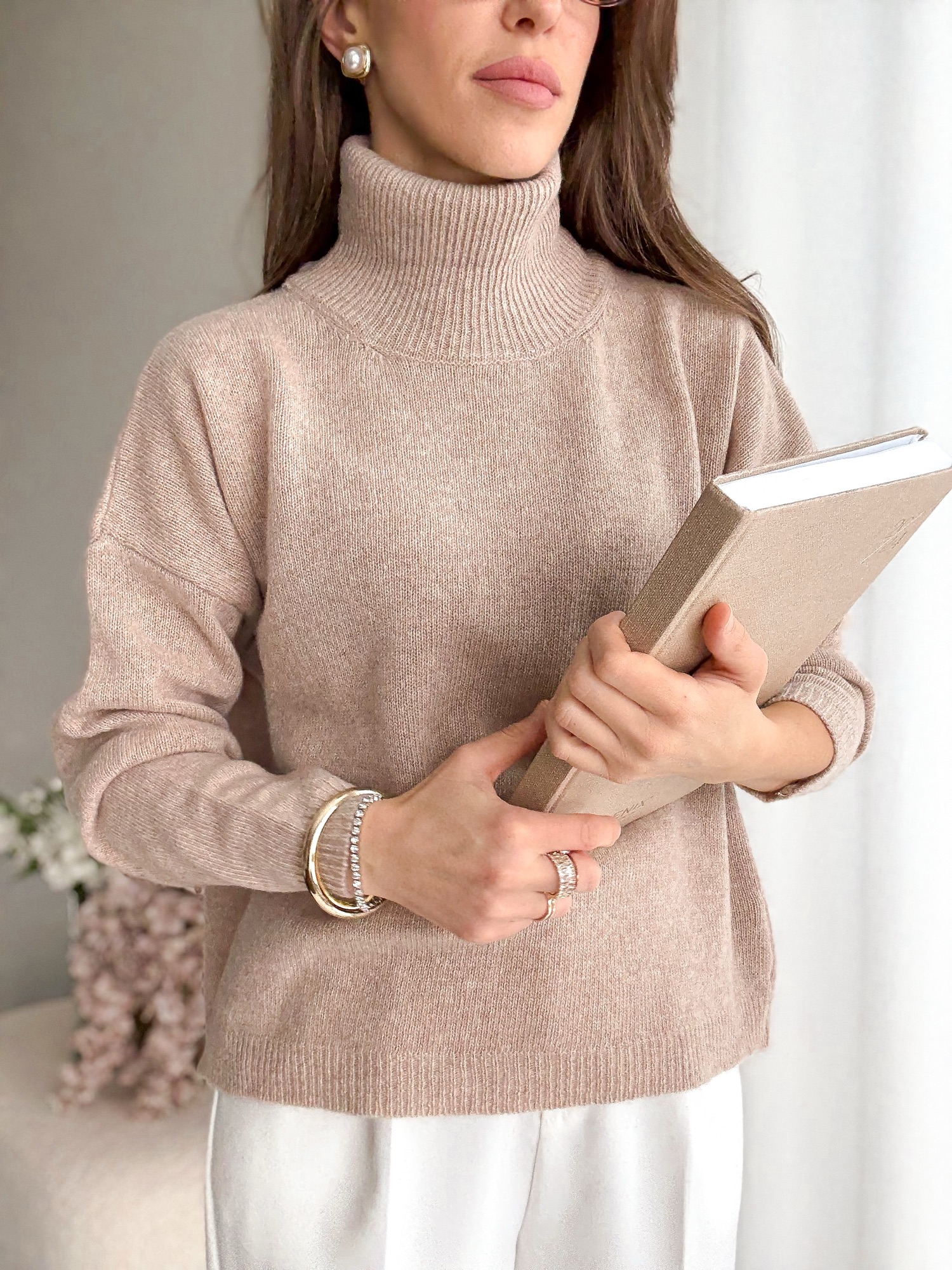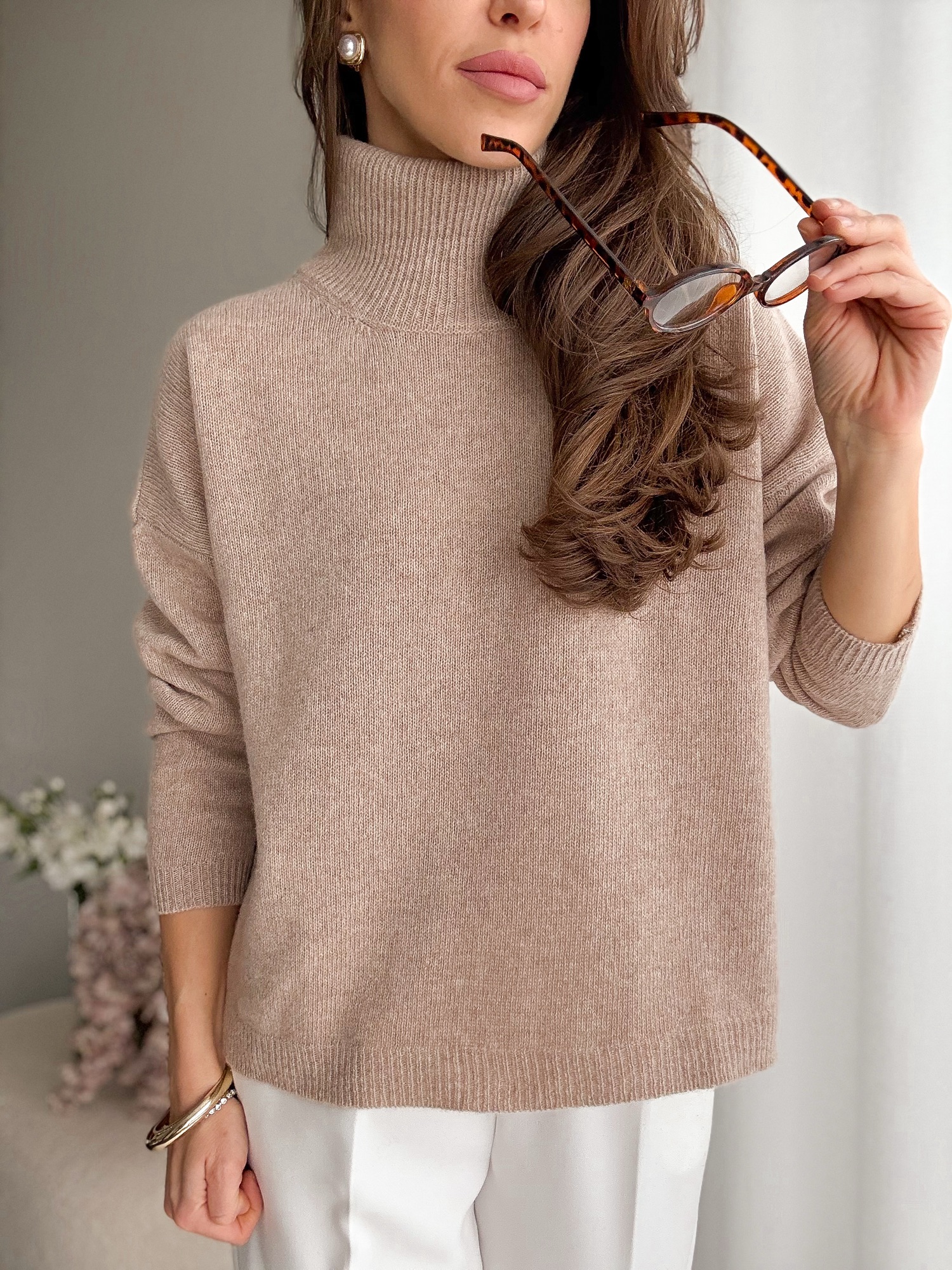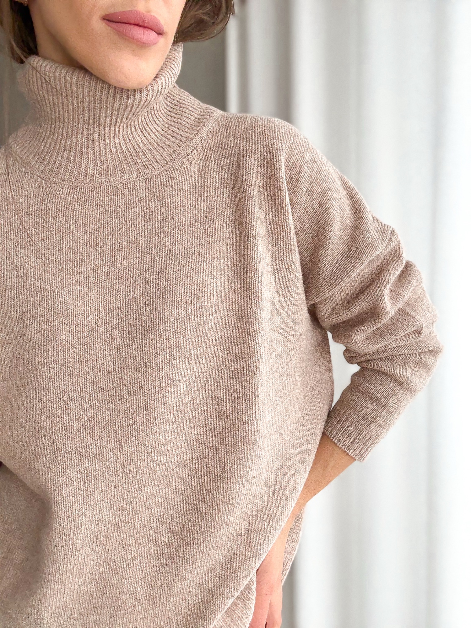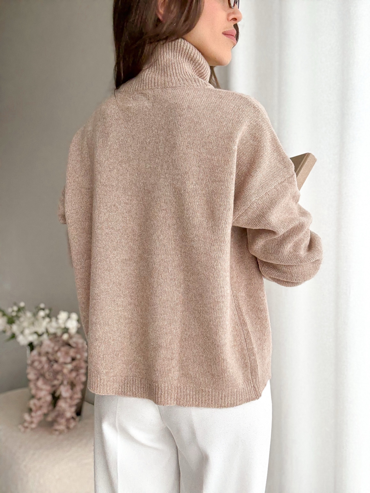 Sweter z luźnym, obszernym golfem i obniżoną linią ramion wykonany w 100% z wełny merino.