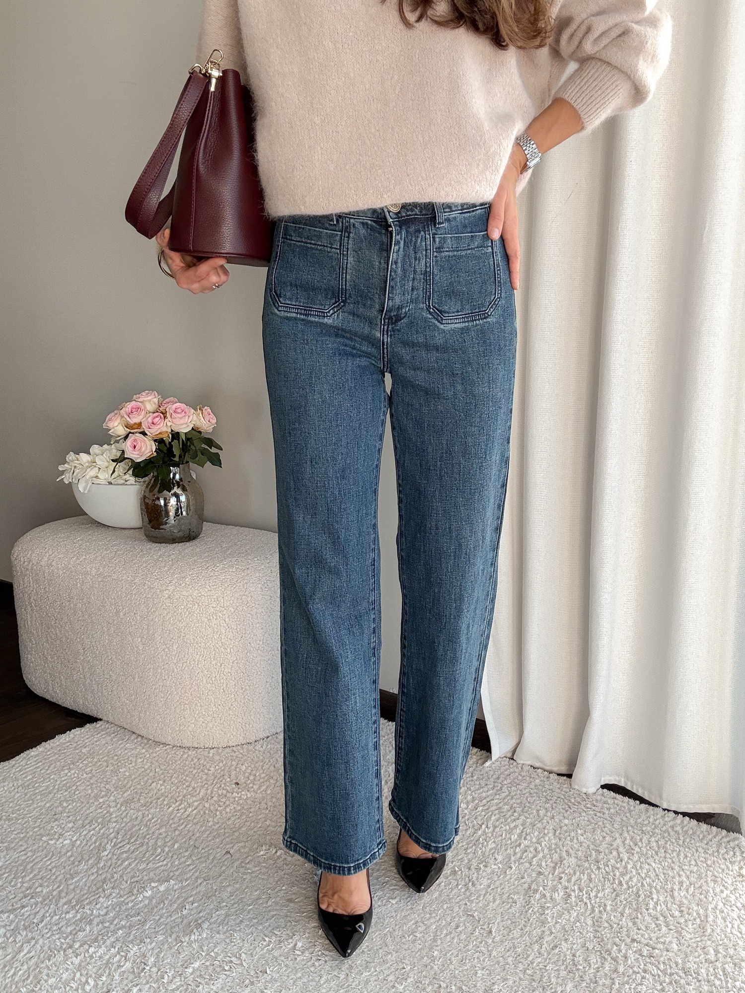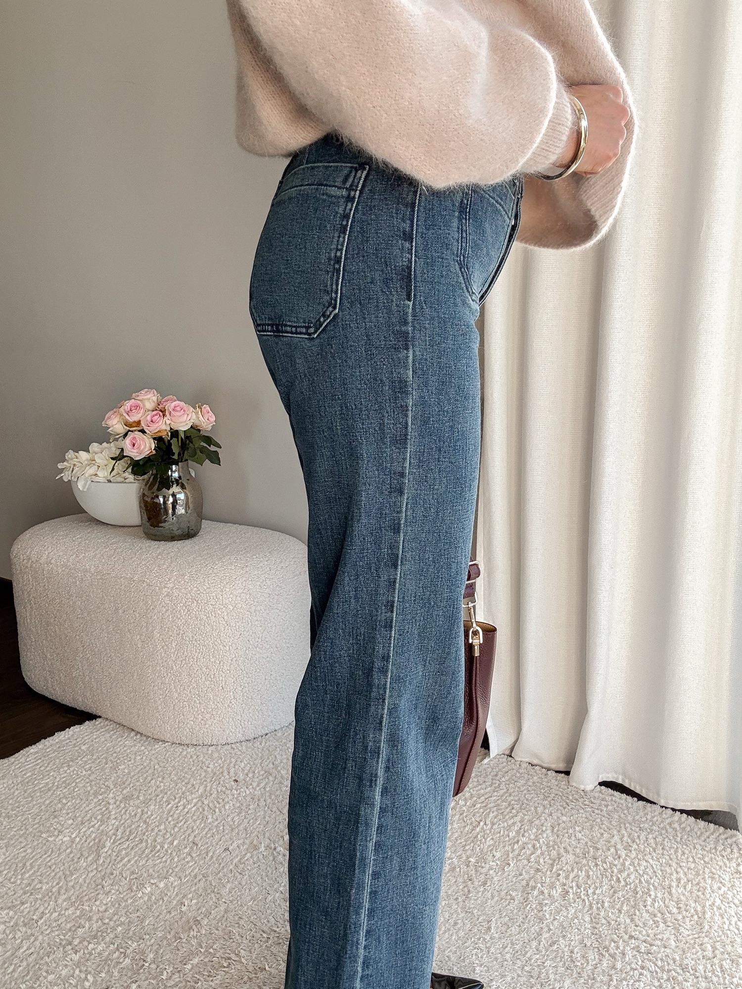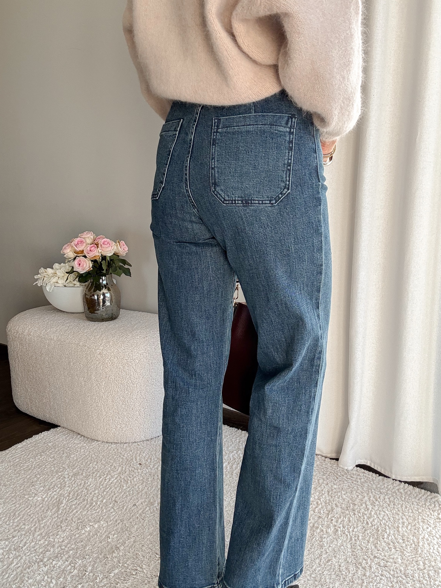 Jeansy z prostymi, długimi nogawkami.