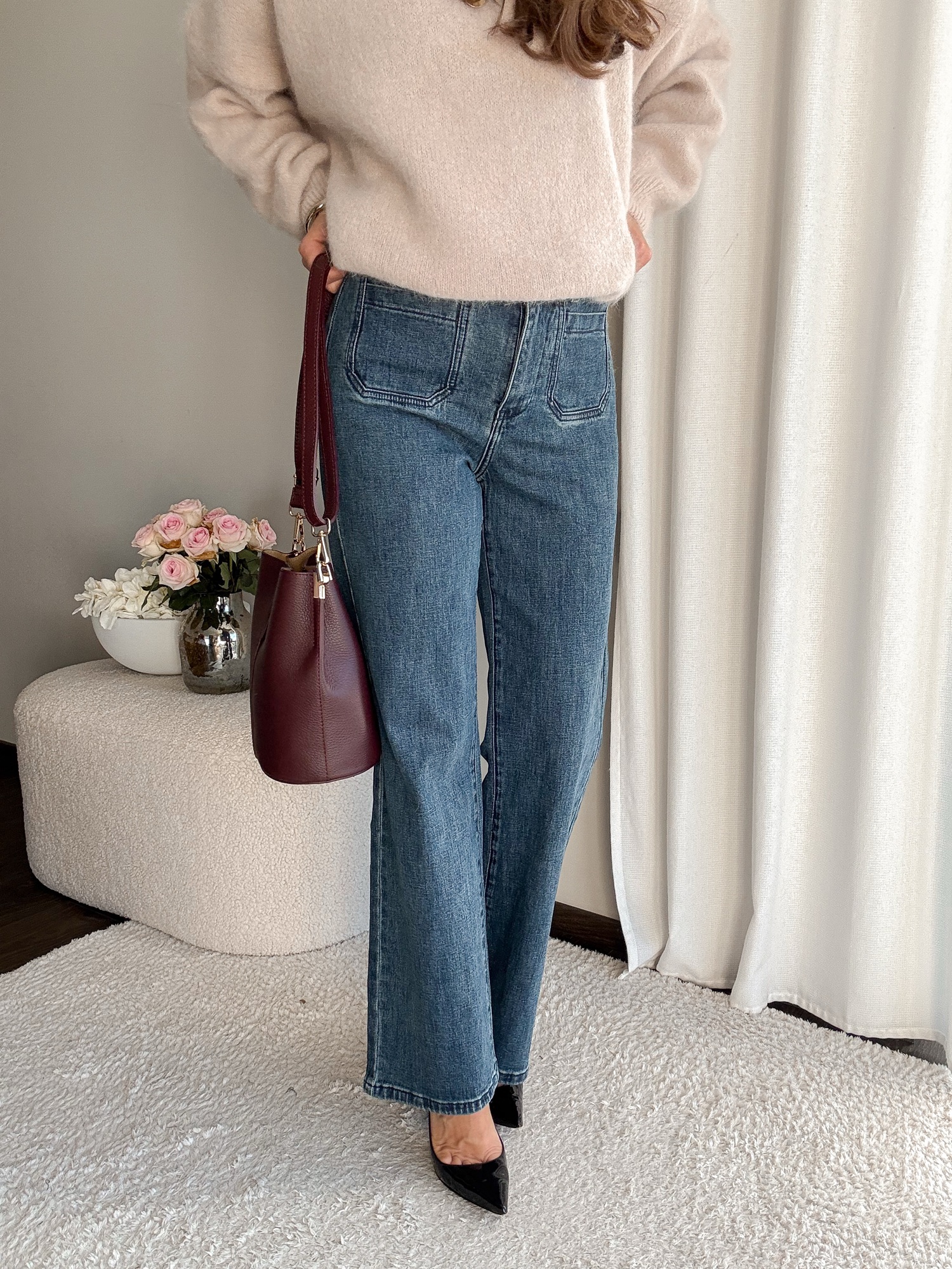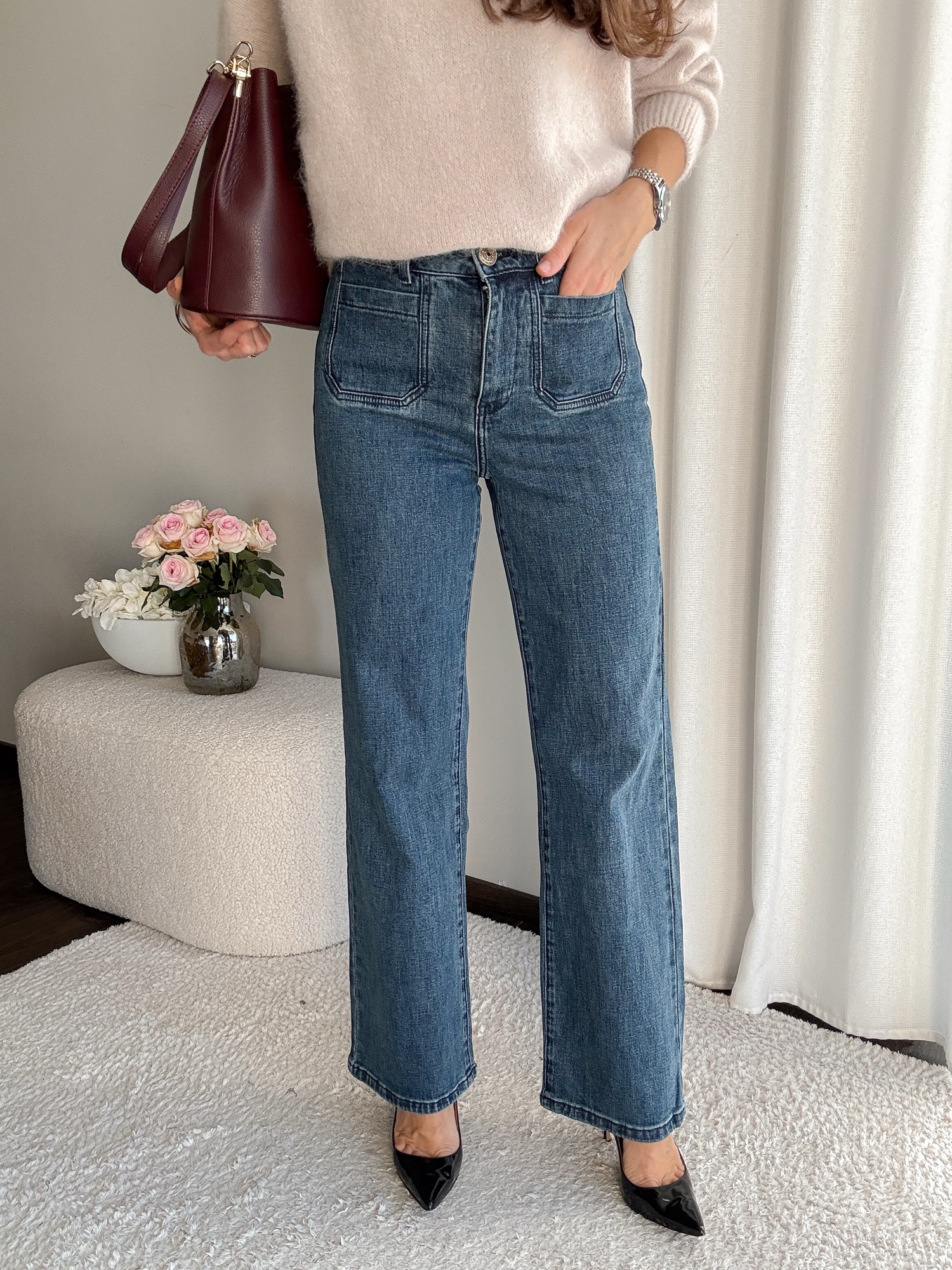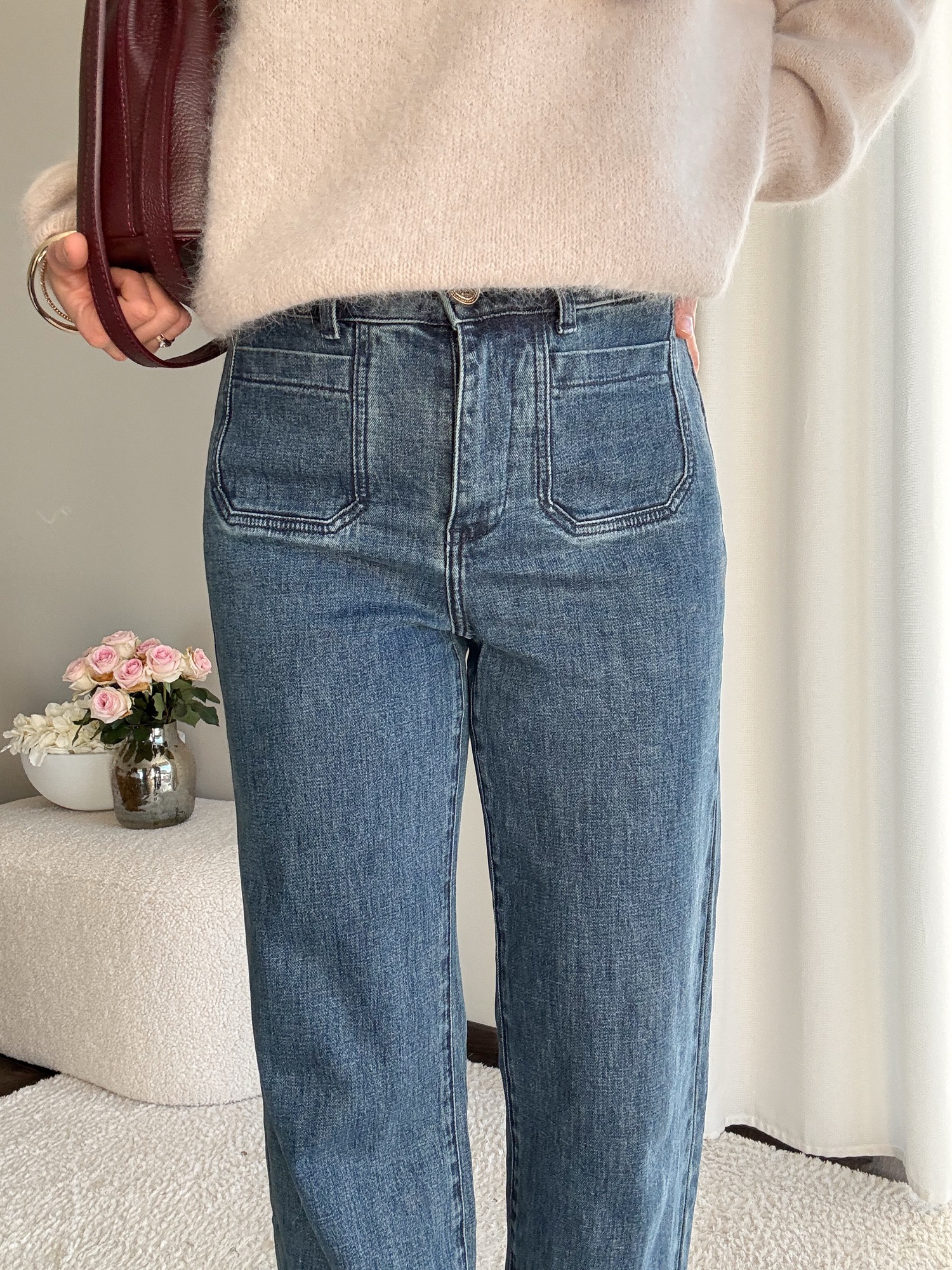 Jeansy z prostymi, długimi nogawkami.