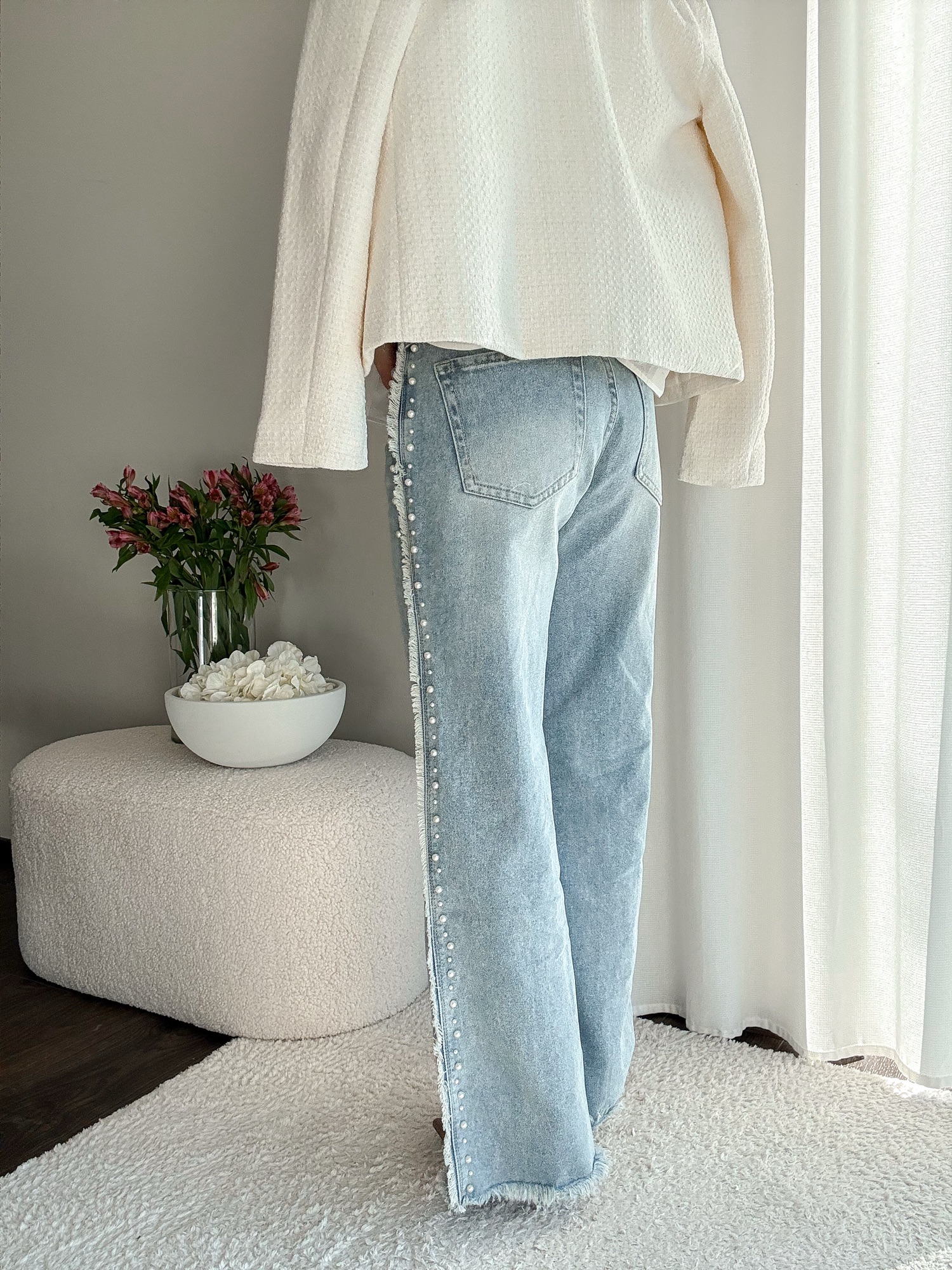 Jeansy zdobione perełkami po bokach spodni oraz przy kieszeniach.