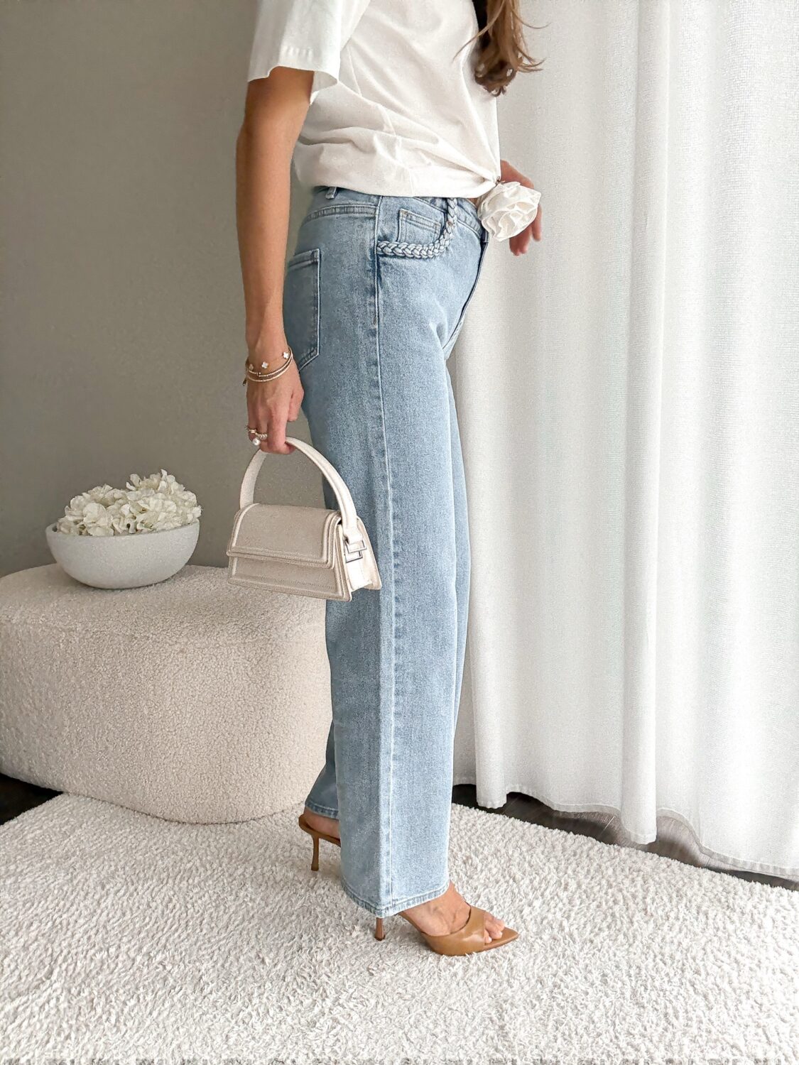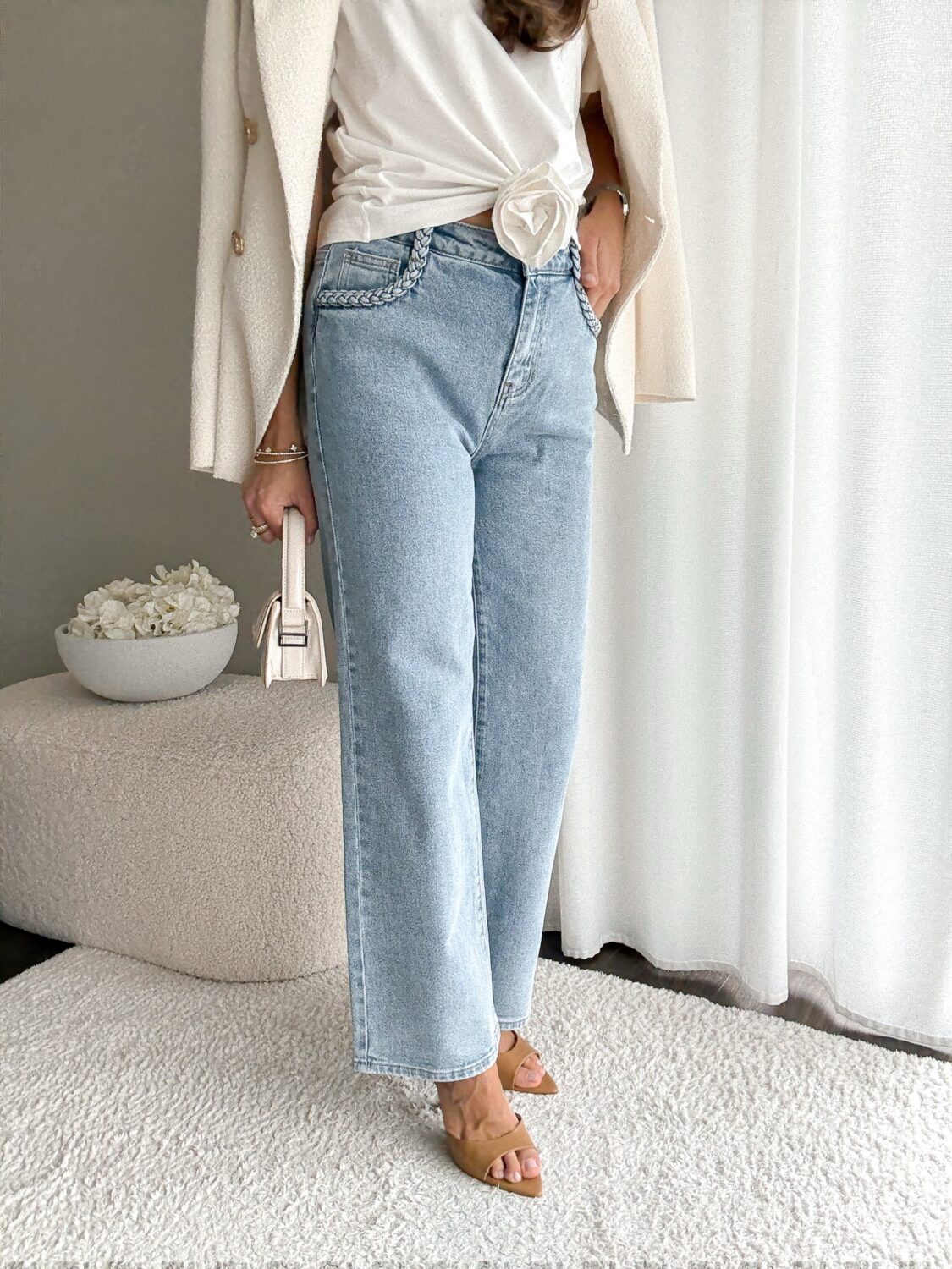 Jeansy z plecionką przy kieszonkach i szlufkach.