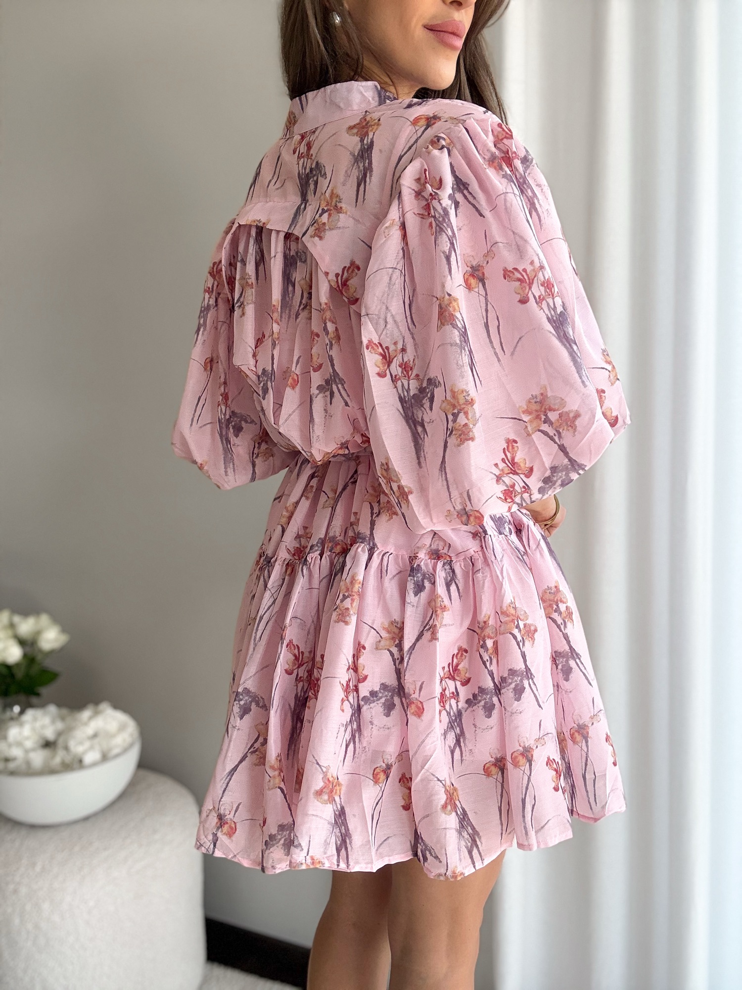 Sukienka o długości midi z bufiastymi rękawami.