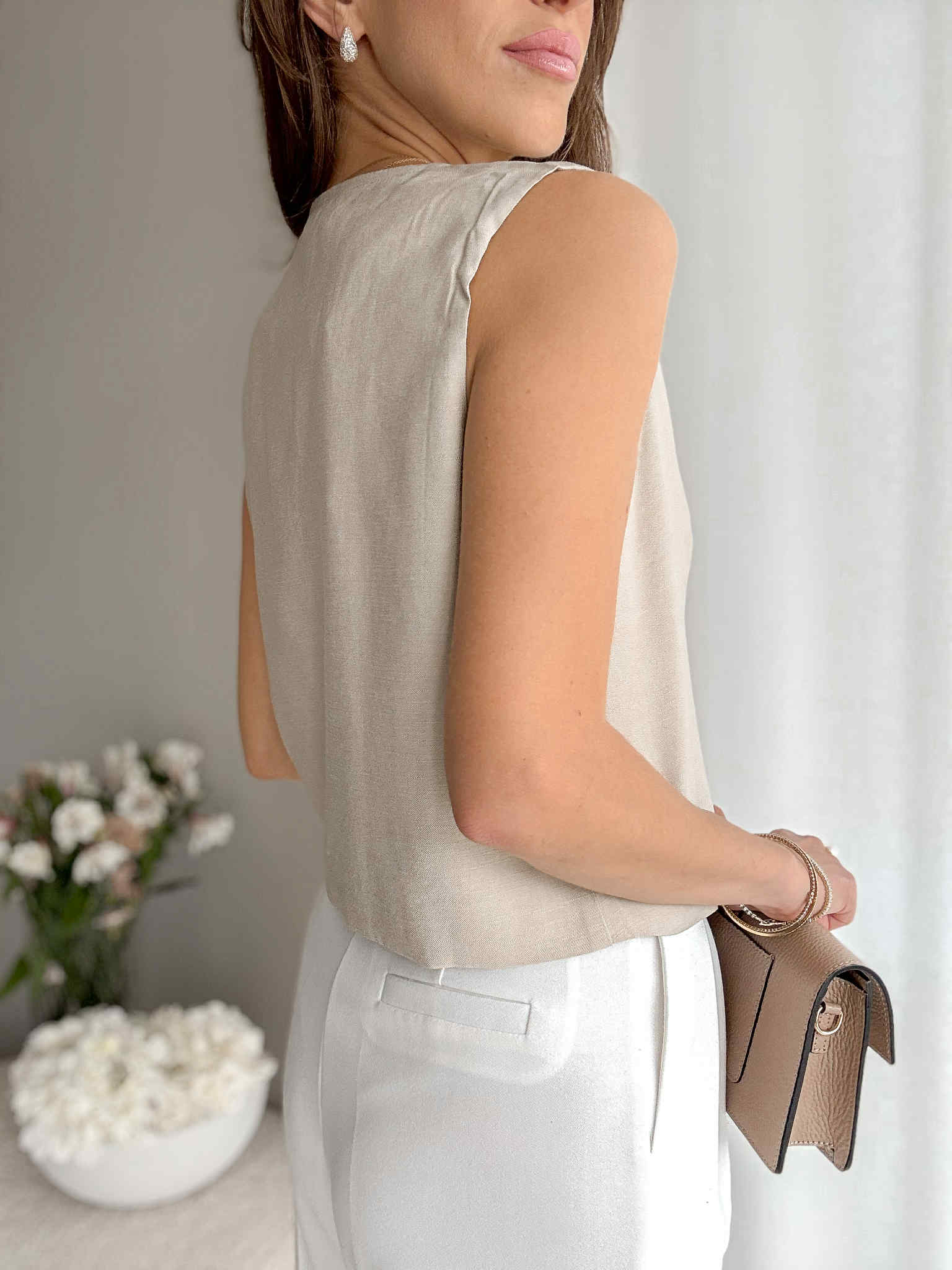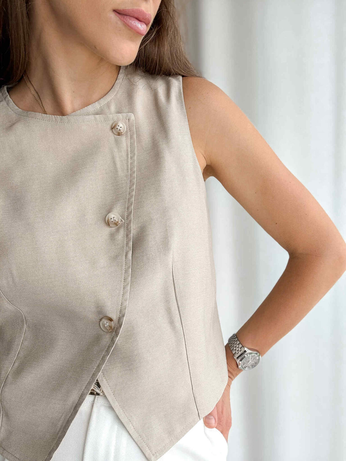 Elegancki top/kamizelka o asymetrycznym kroju – zapinana na ukos na guziki.