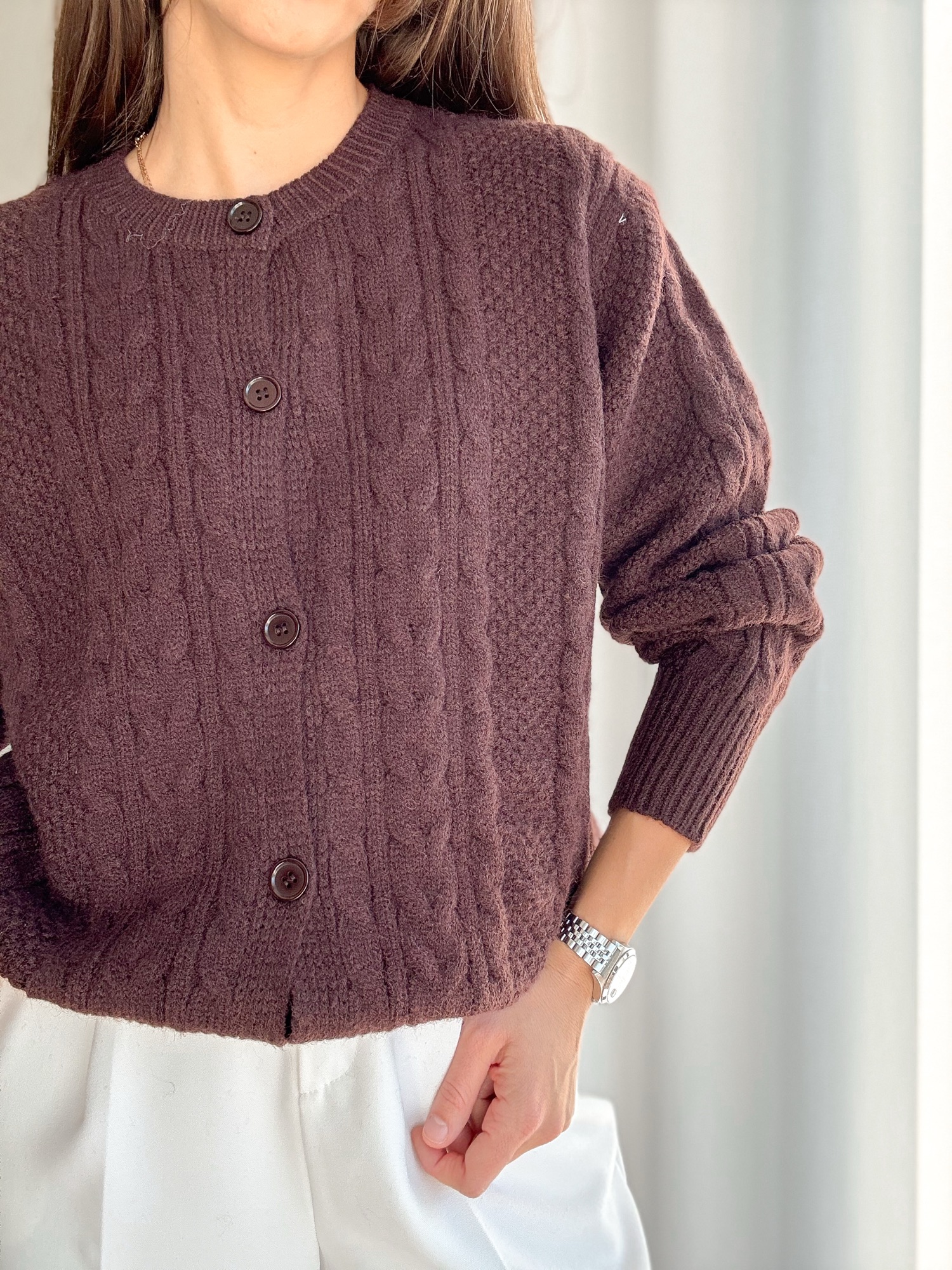 Gruby, mięsisty cardigan z warkoczowym splotem.