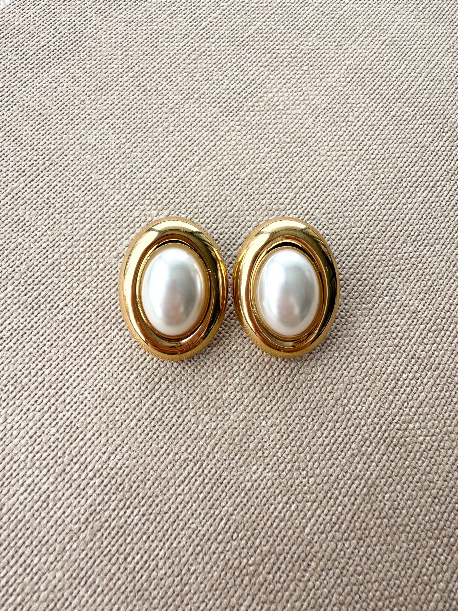 Owalny kształt, środek wypleniony perłą otoczka postarzanym złotem.