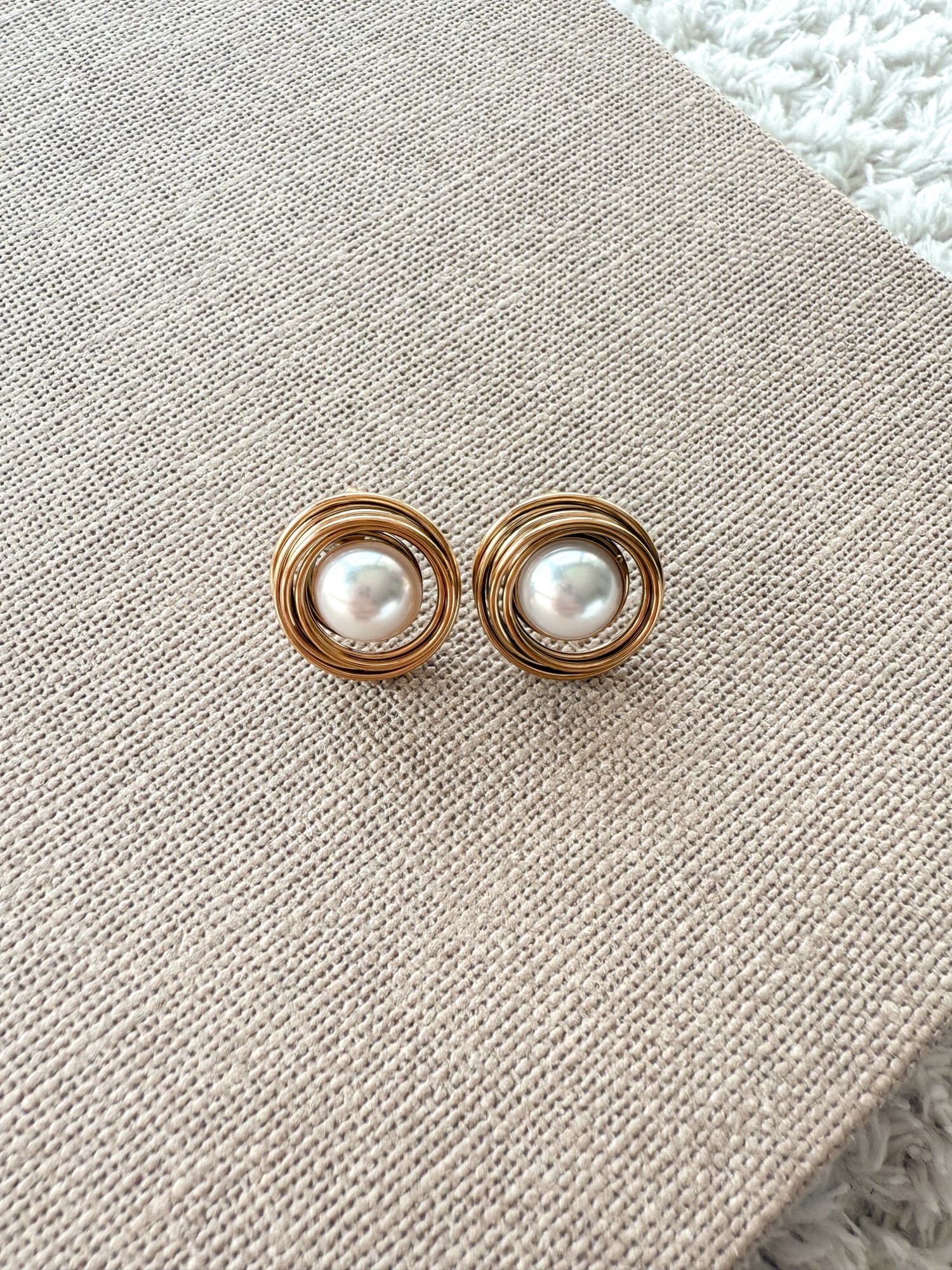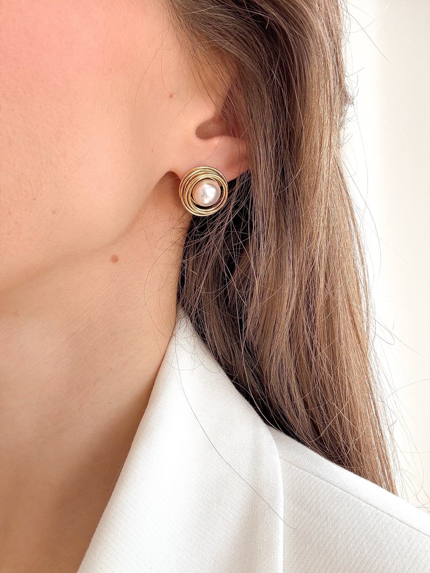 Kolczyki ze sztuczną perełką otoczona pozłacanymi okręgami.