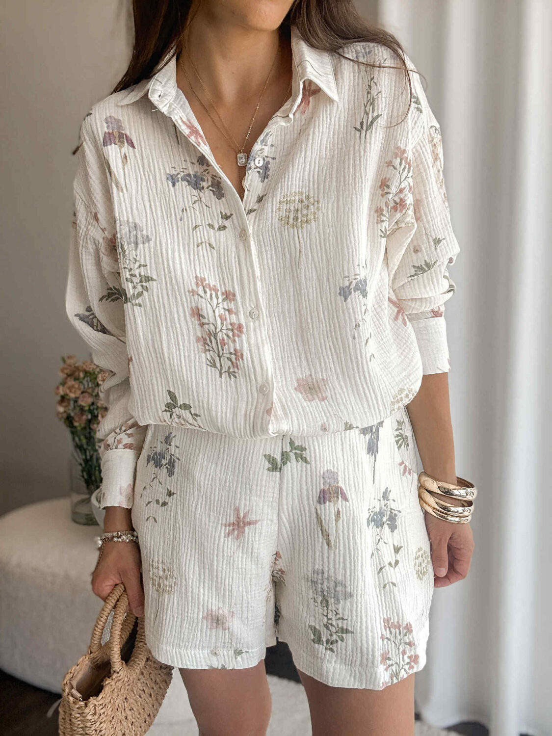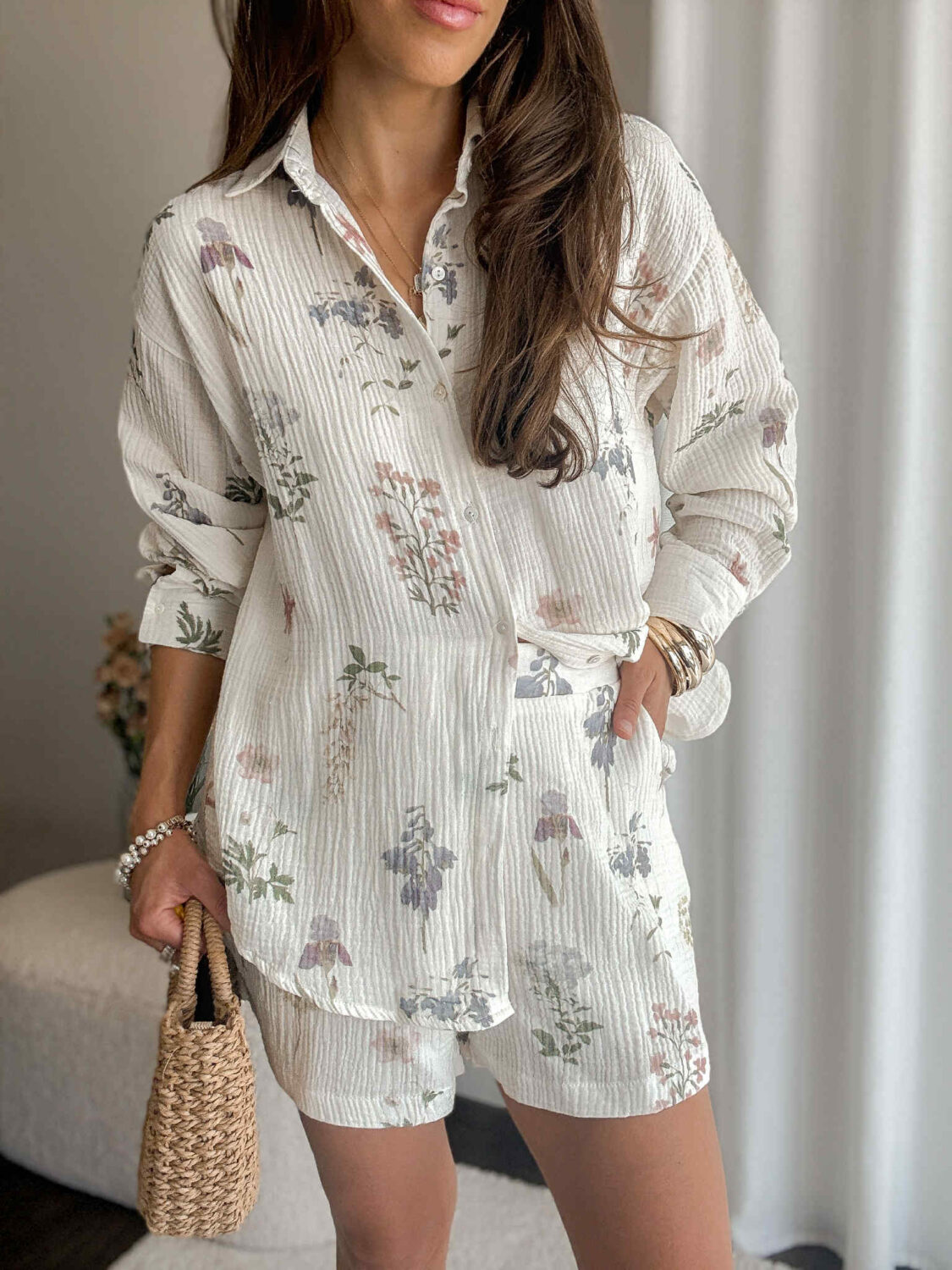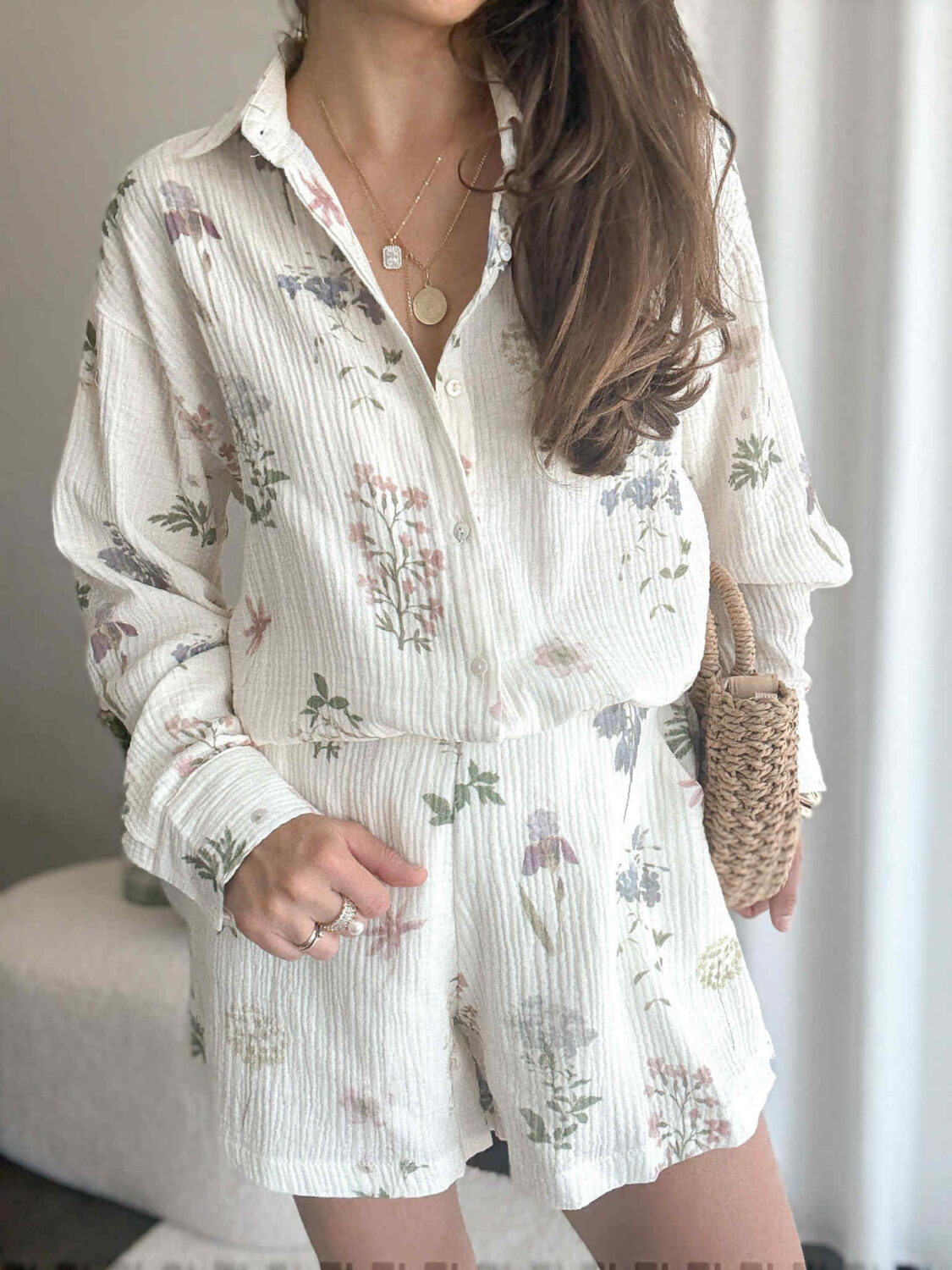 Koszula o oversizeowym fasonie, zapinana na perłowe guziki.