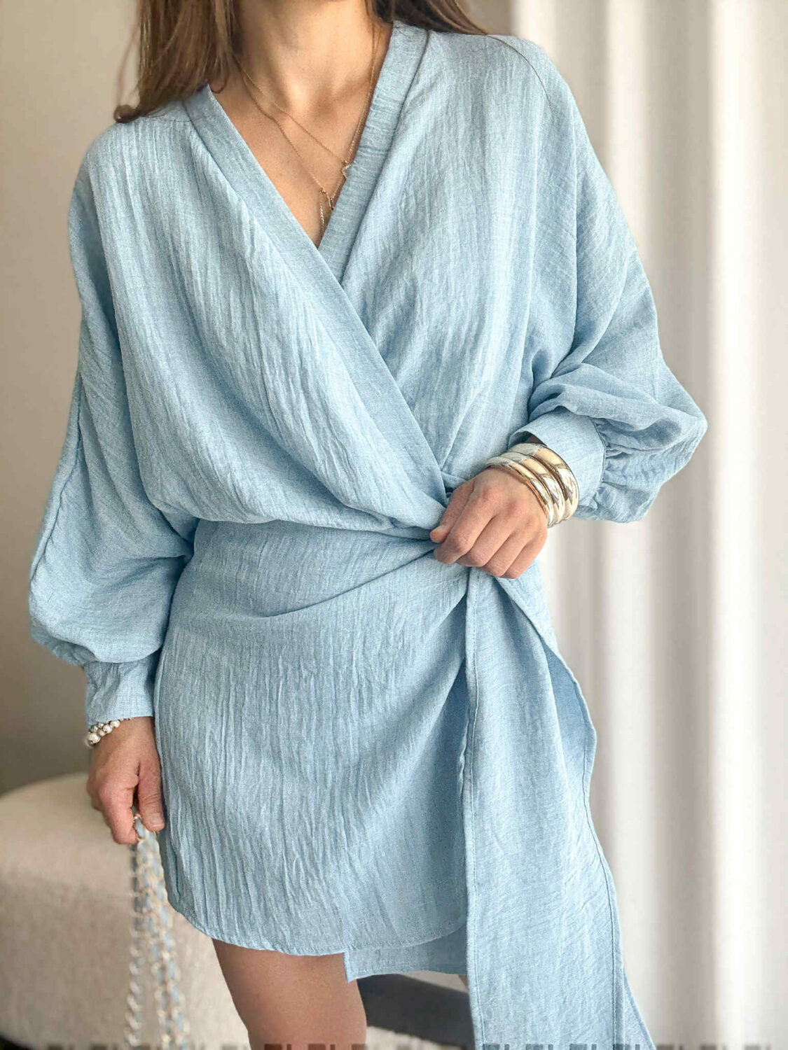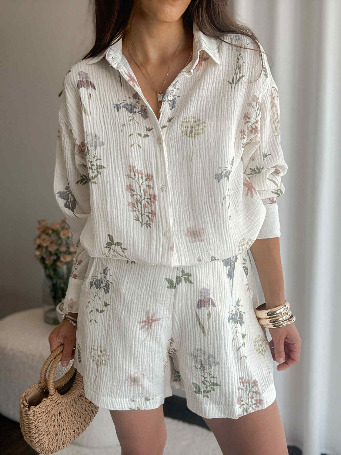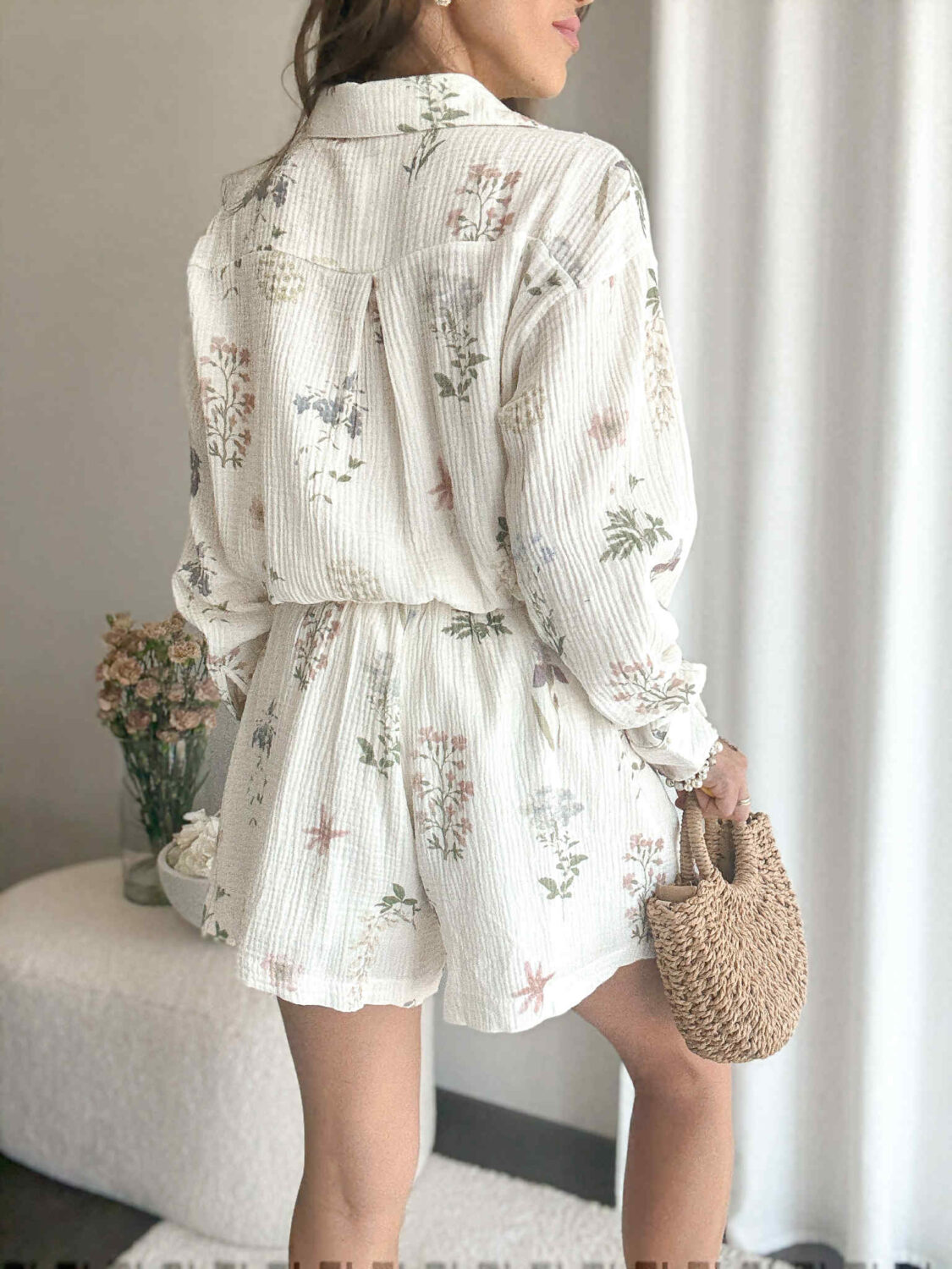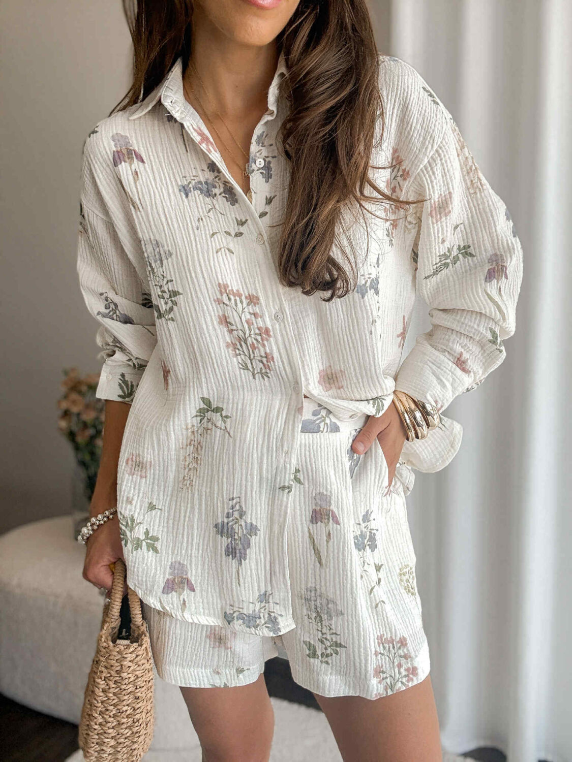 Koszula o oversizeowym fasonie, zapinana na perłowe guziki.