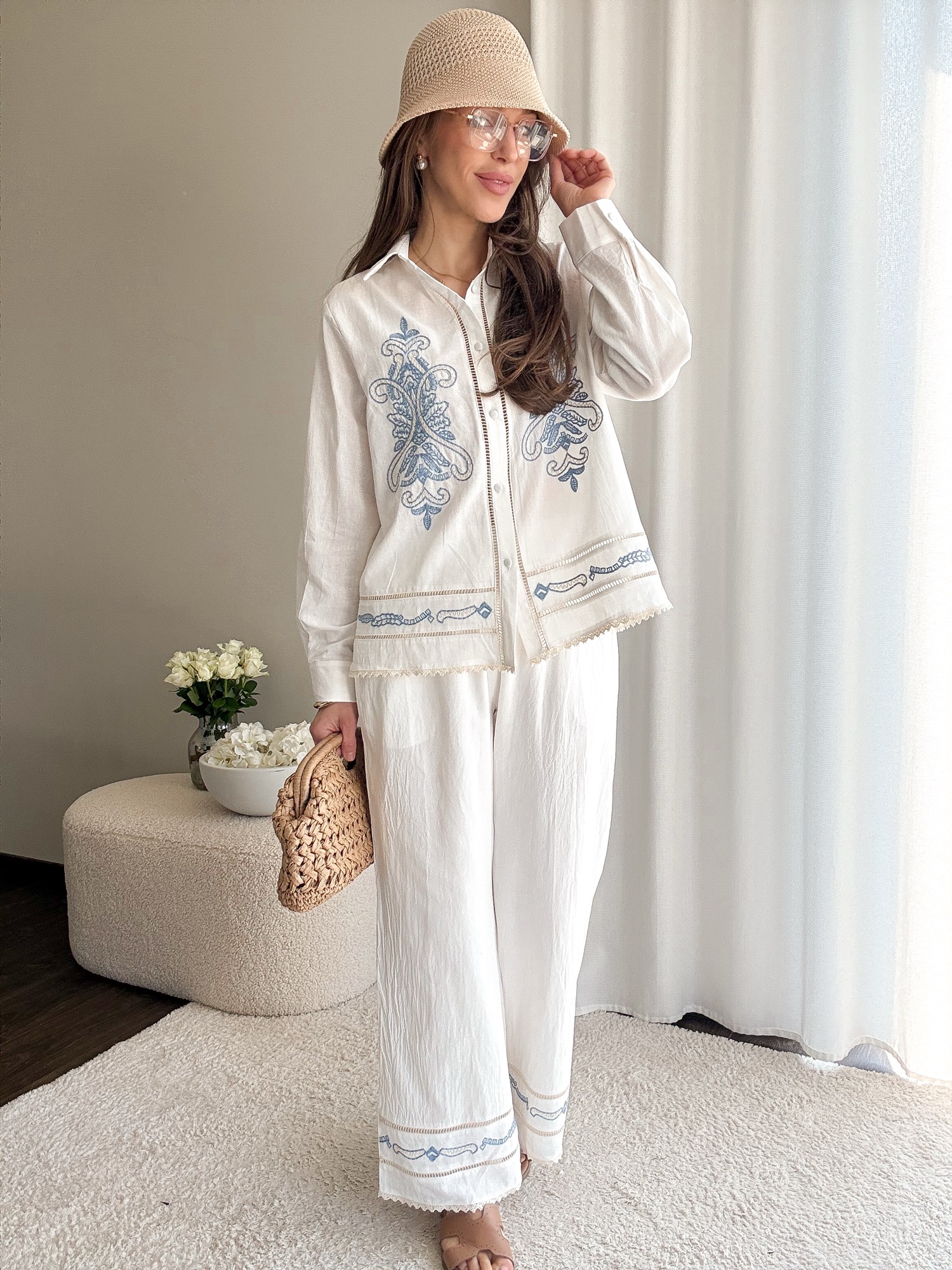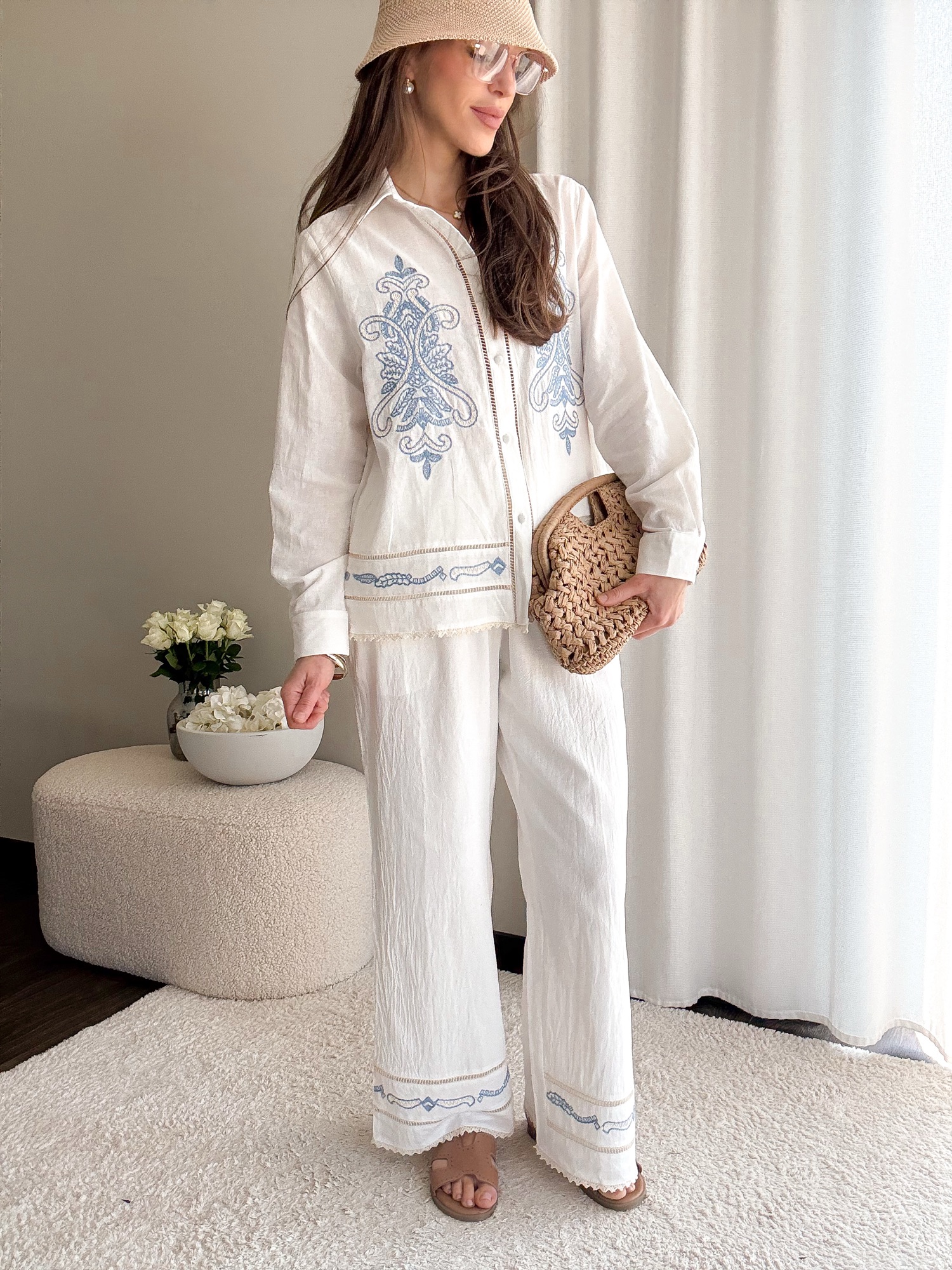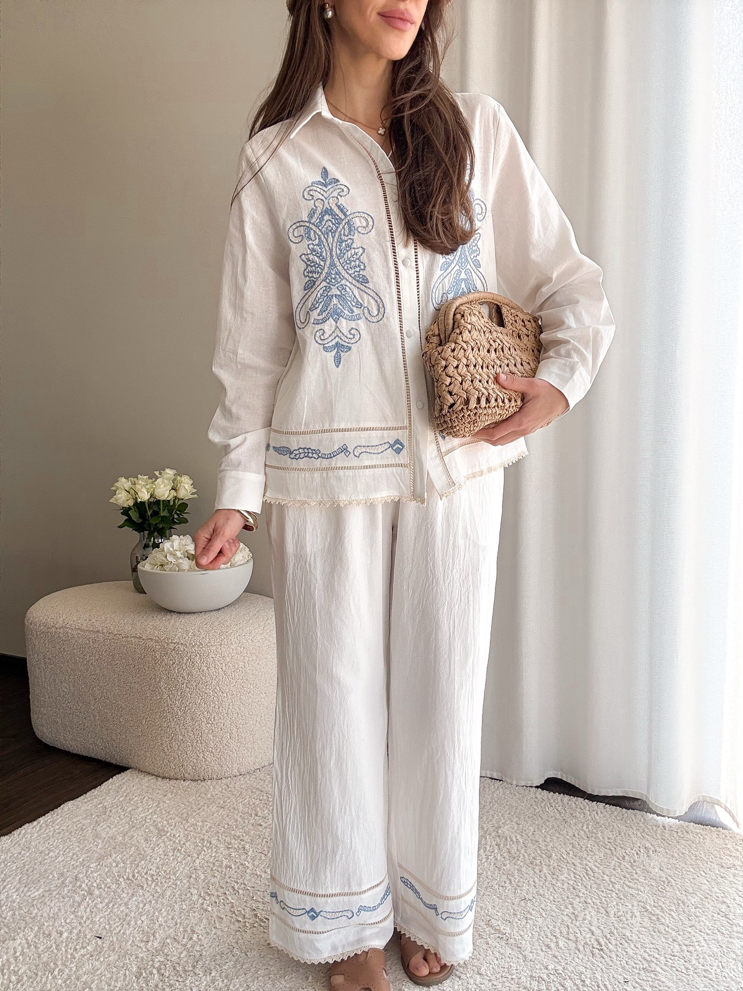 Bawełniany komplet spodnie + koszula z błękitnymi haftami.