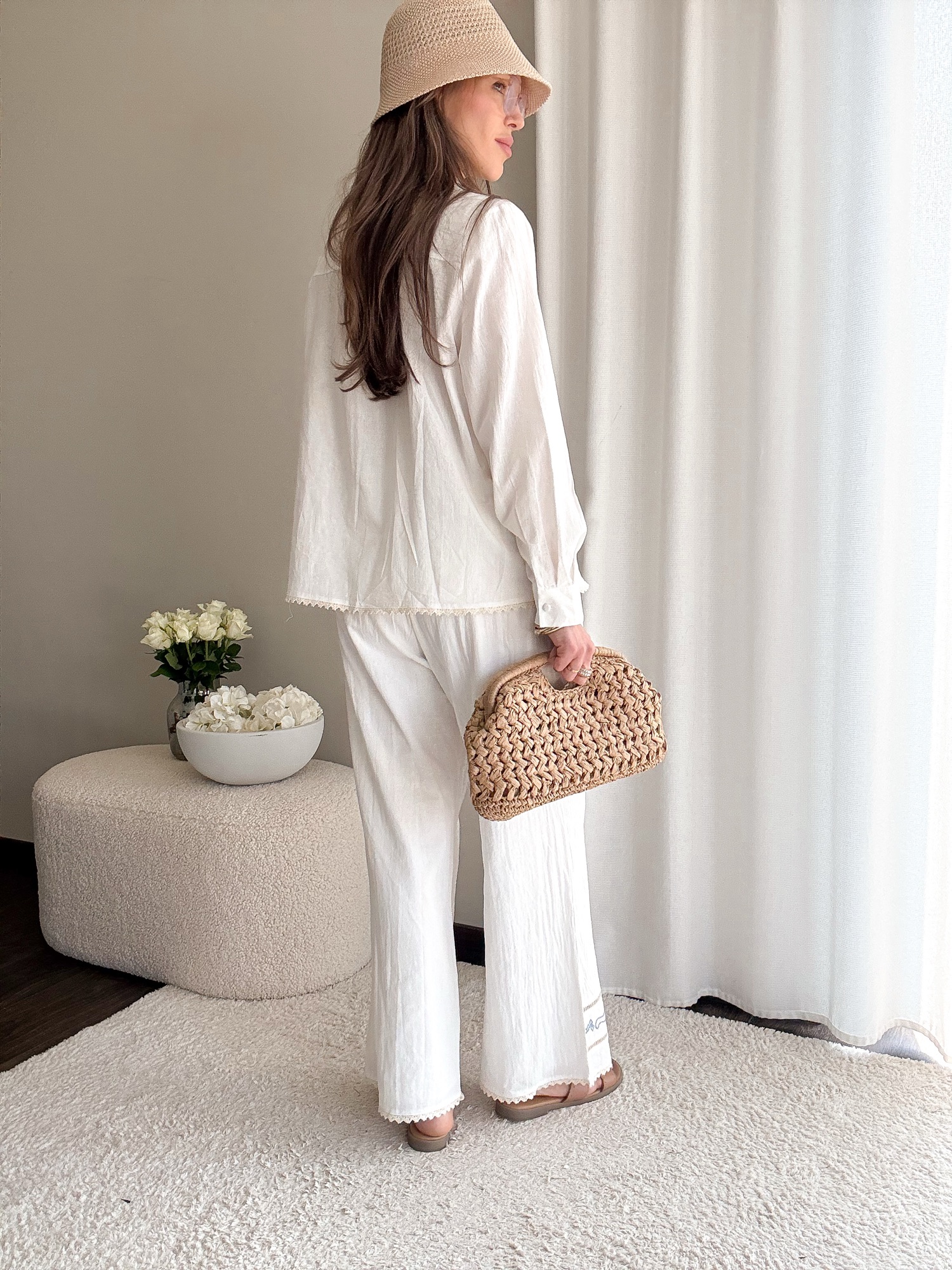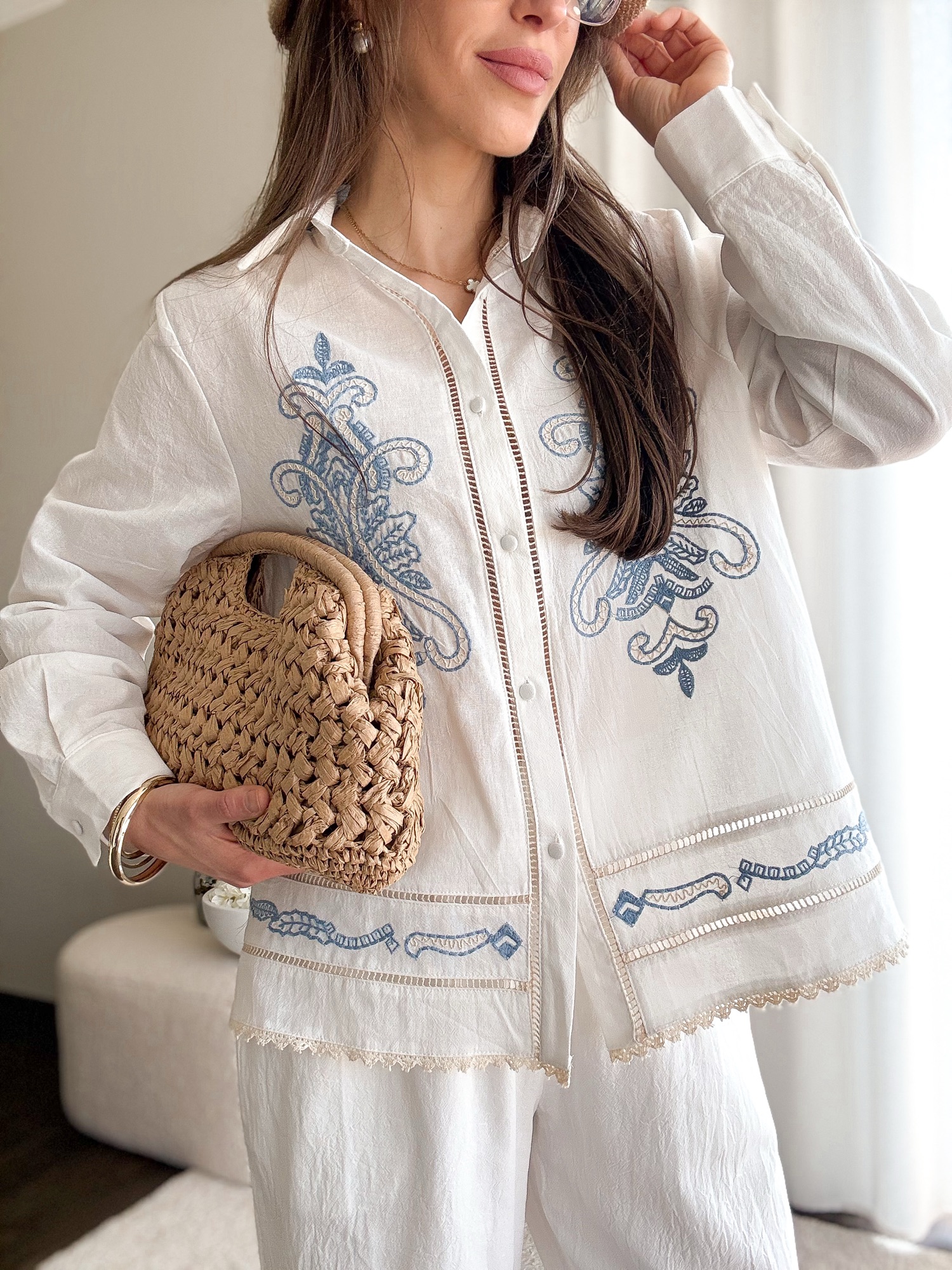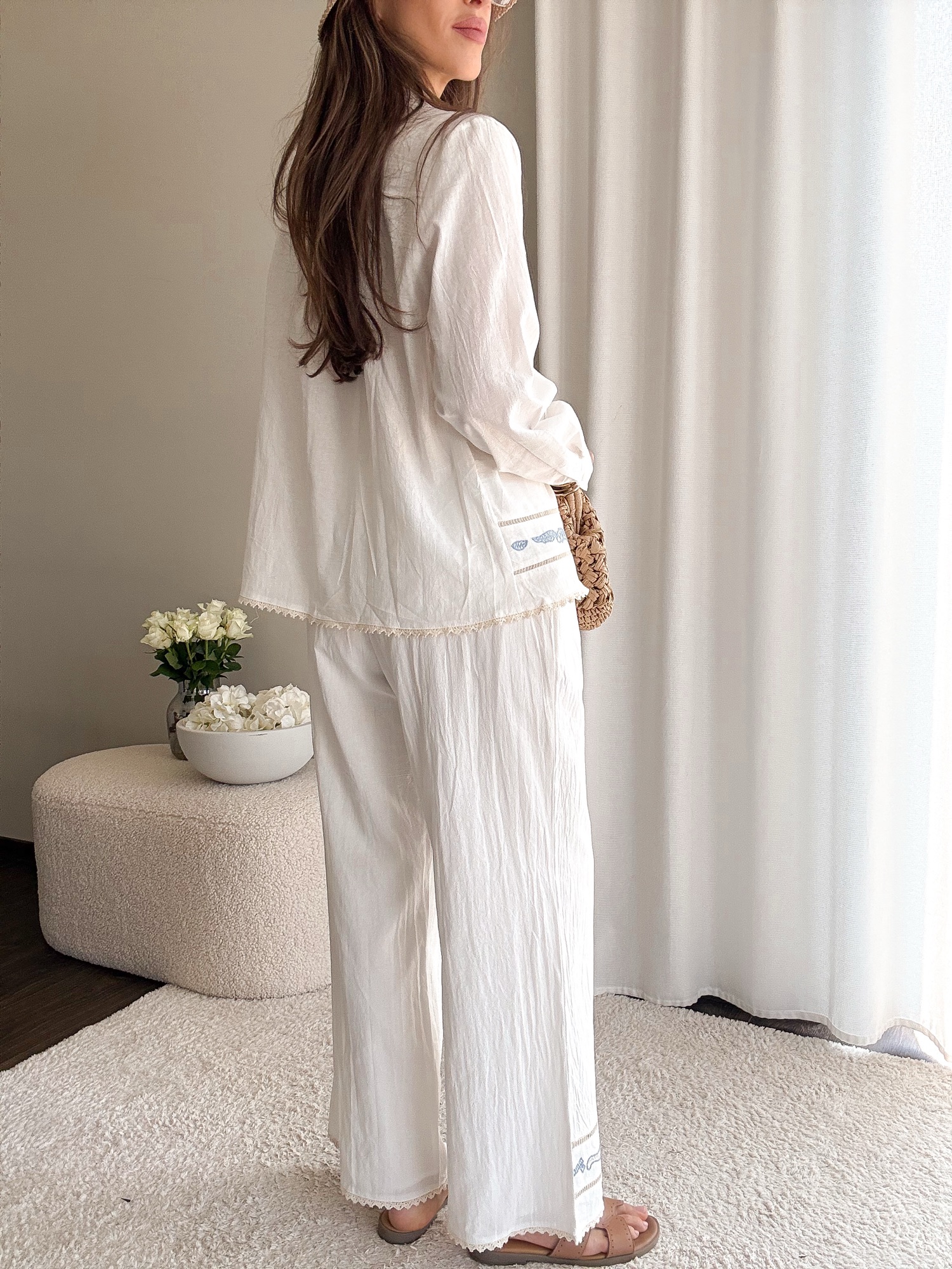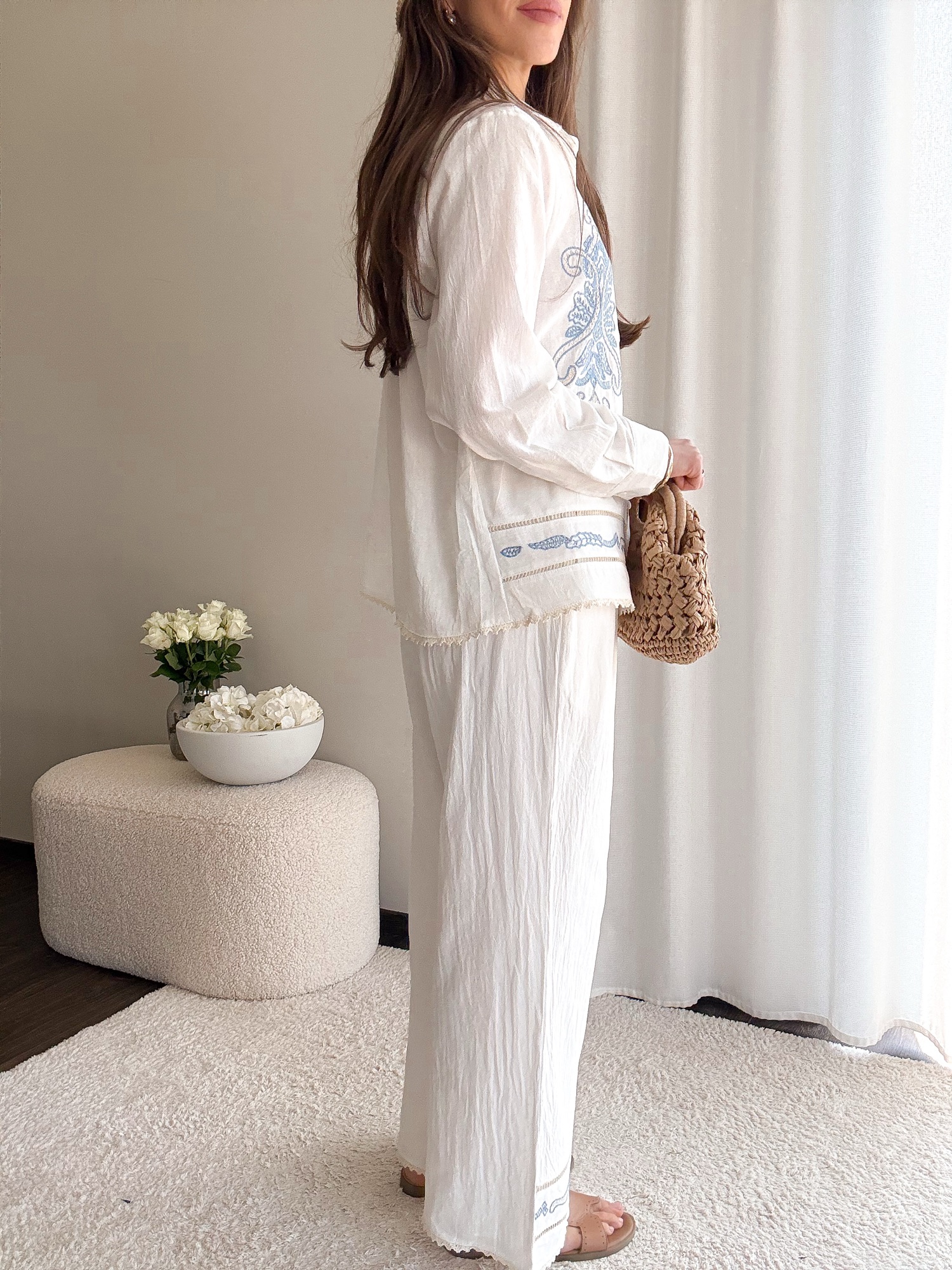 Bawełniany komplet spodnie + koszula z błękitnymi haftami.