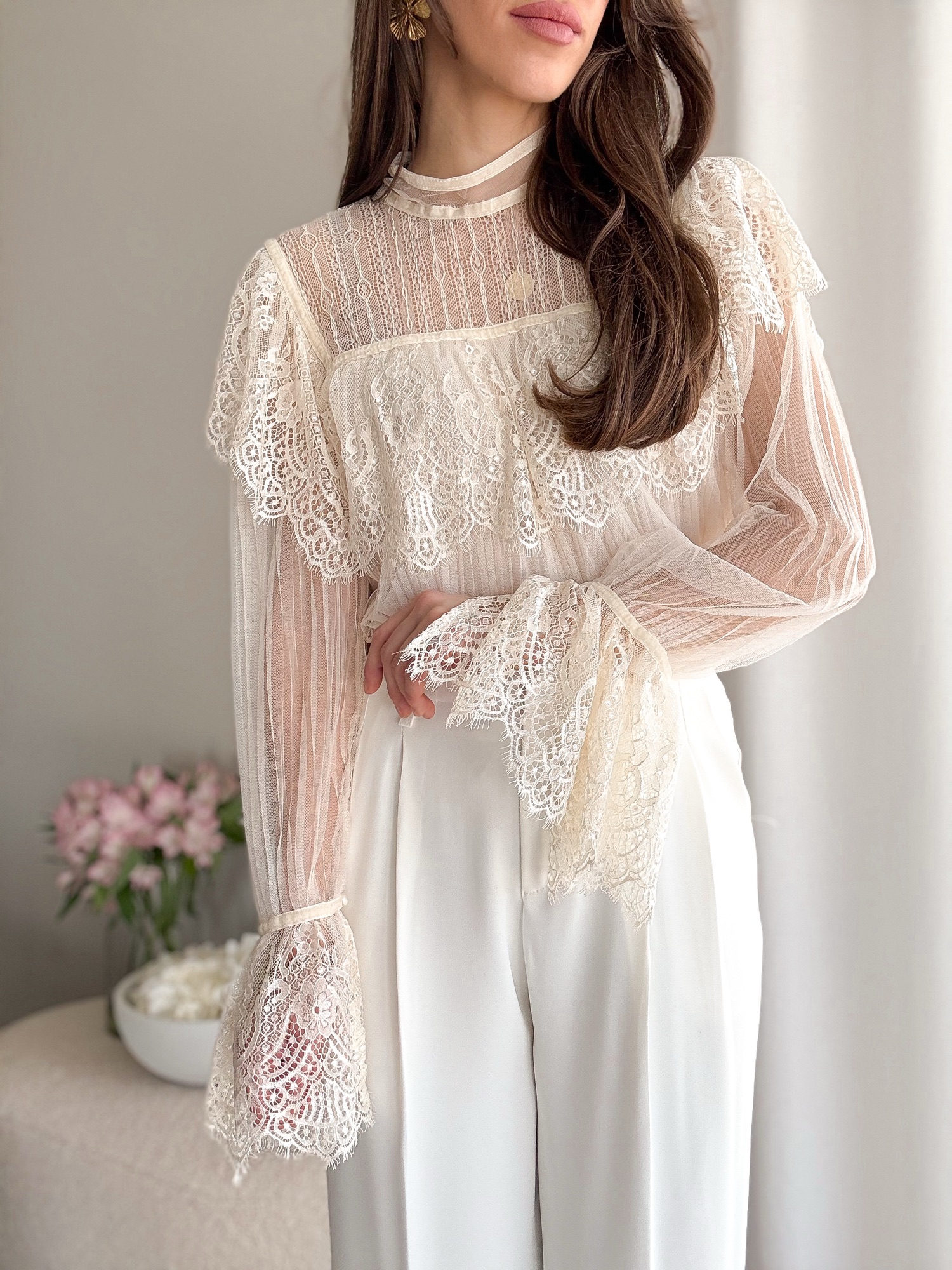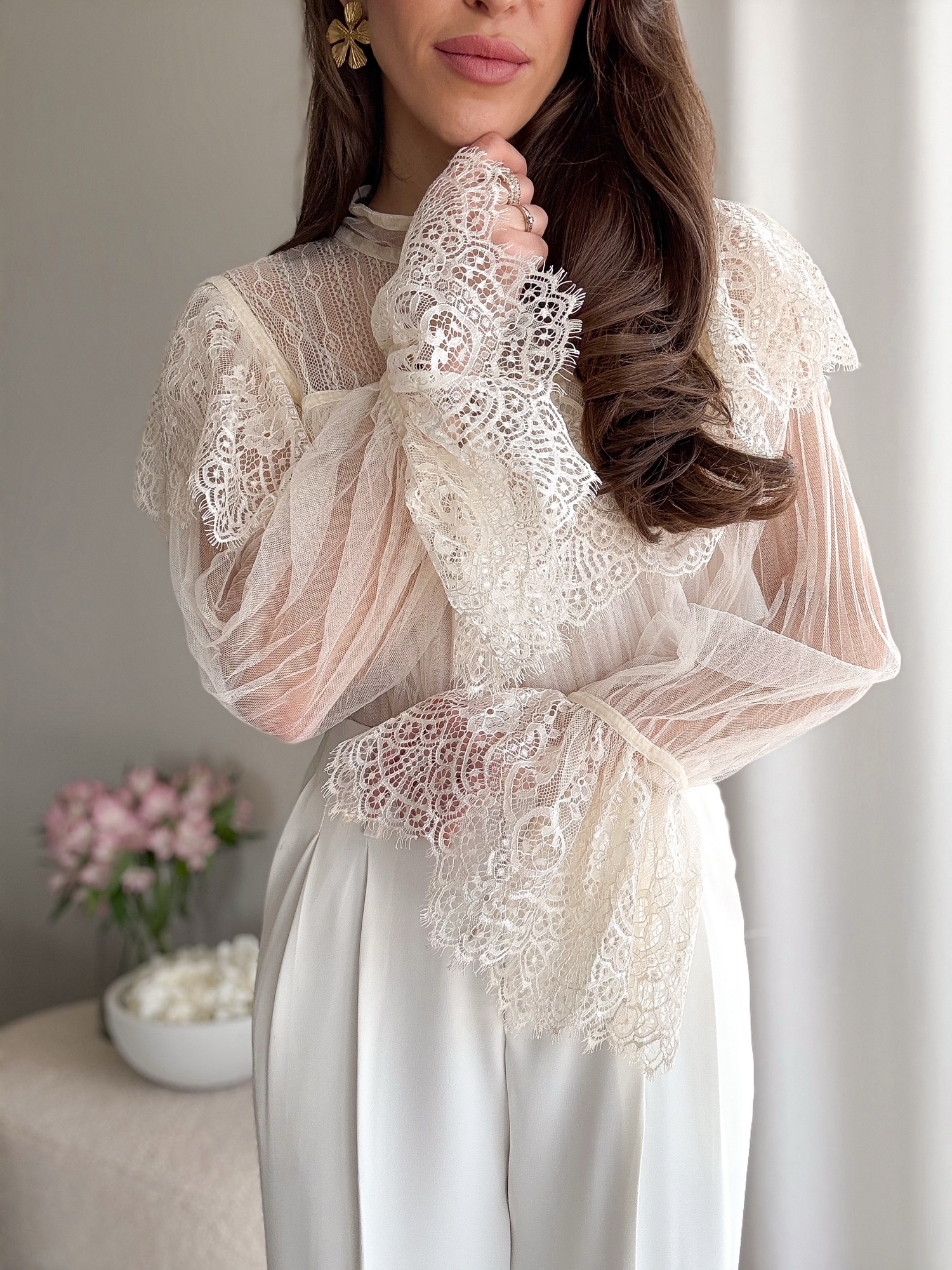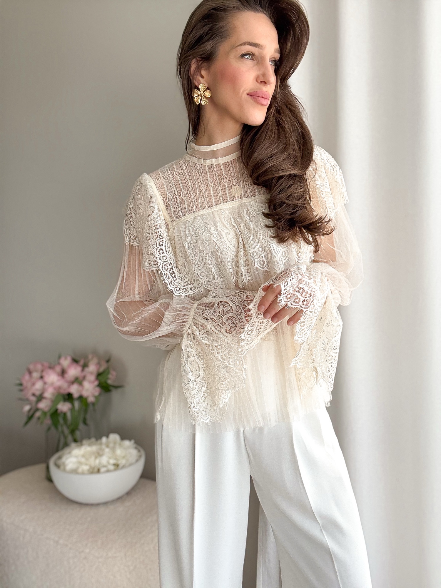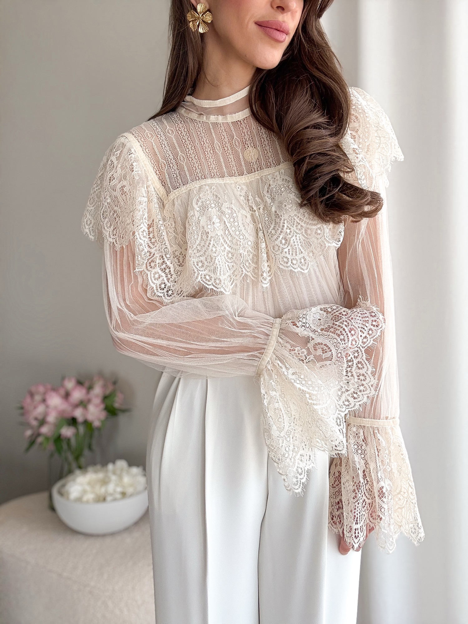 Koronkowa bluzka z rozszerzanymi rękawami i stójką.