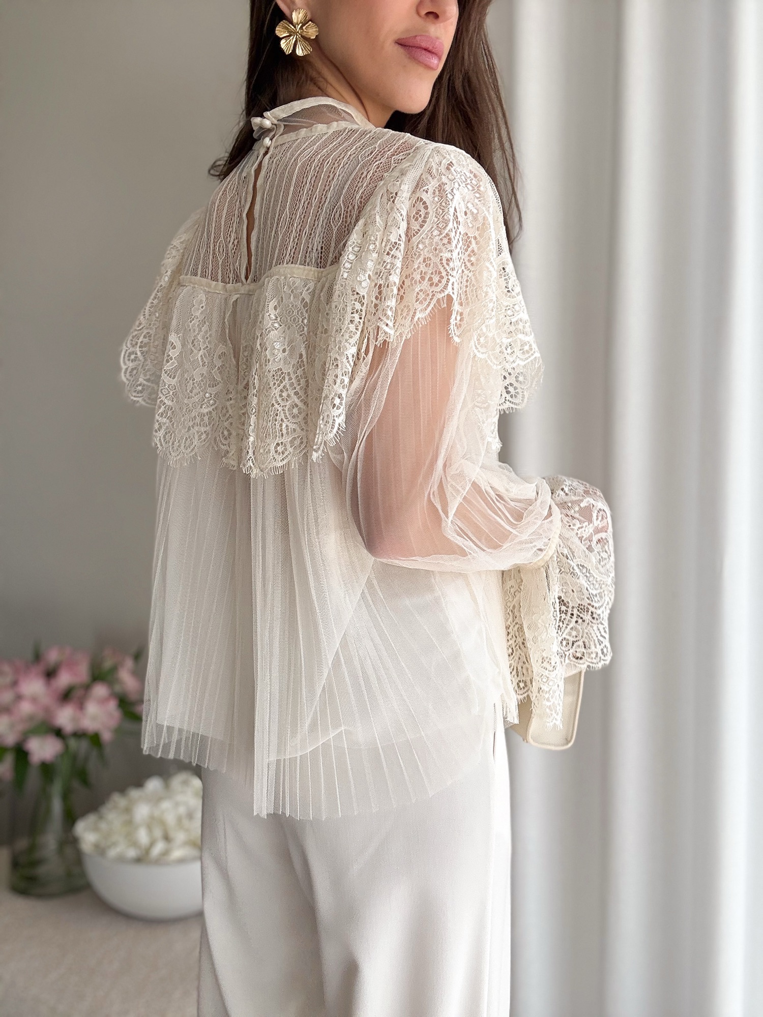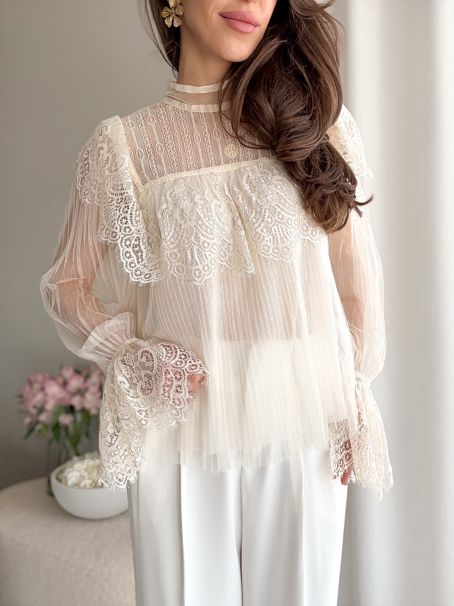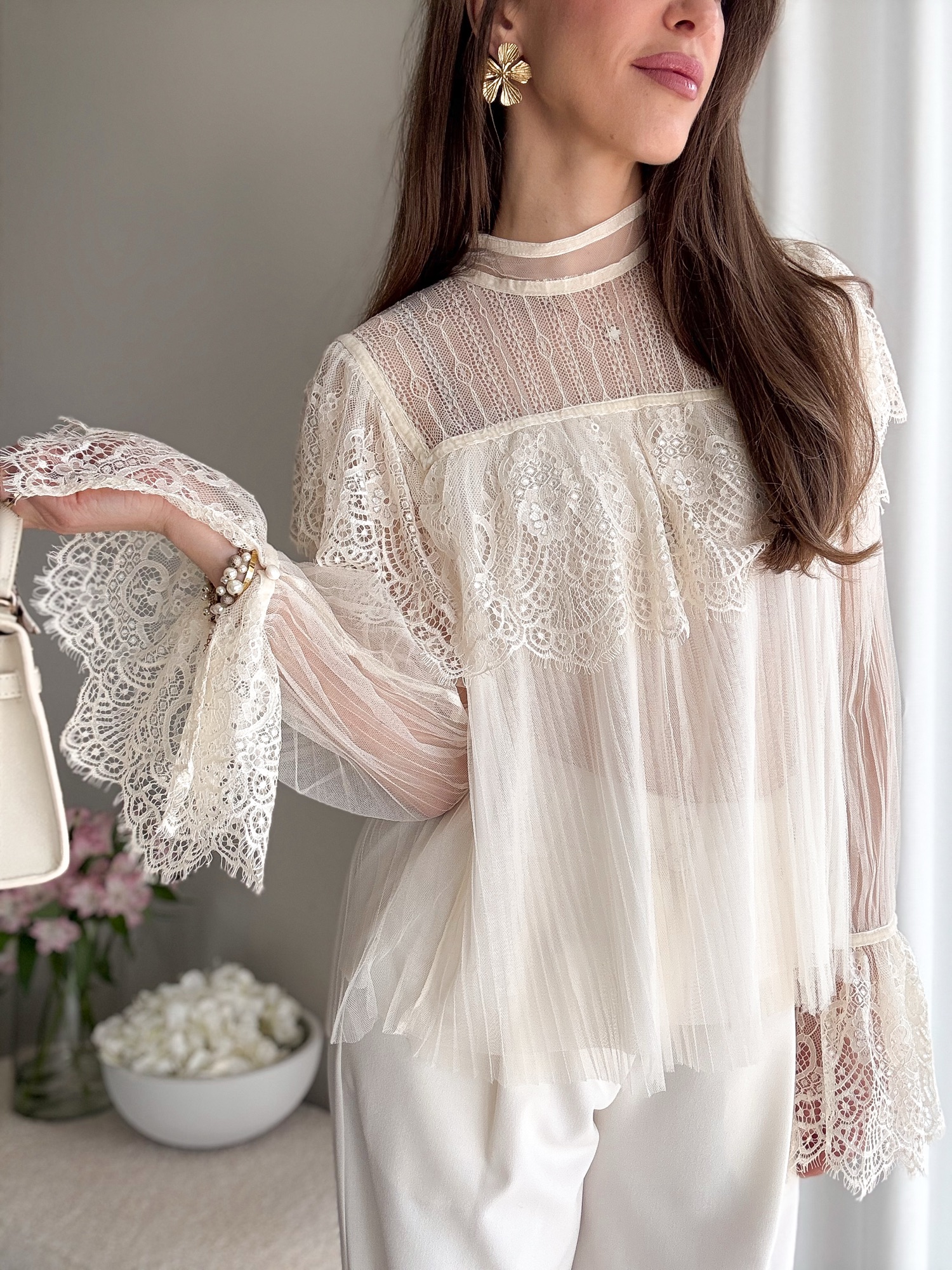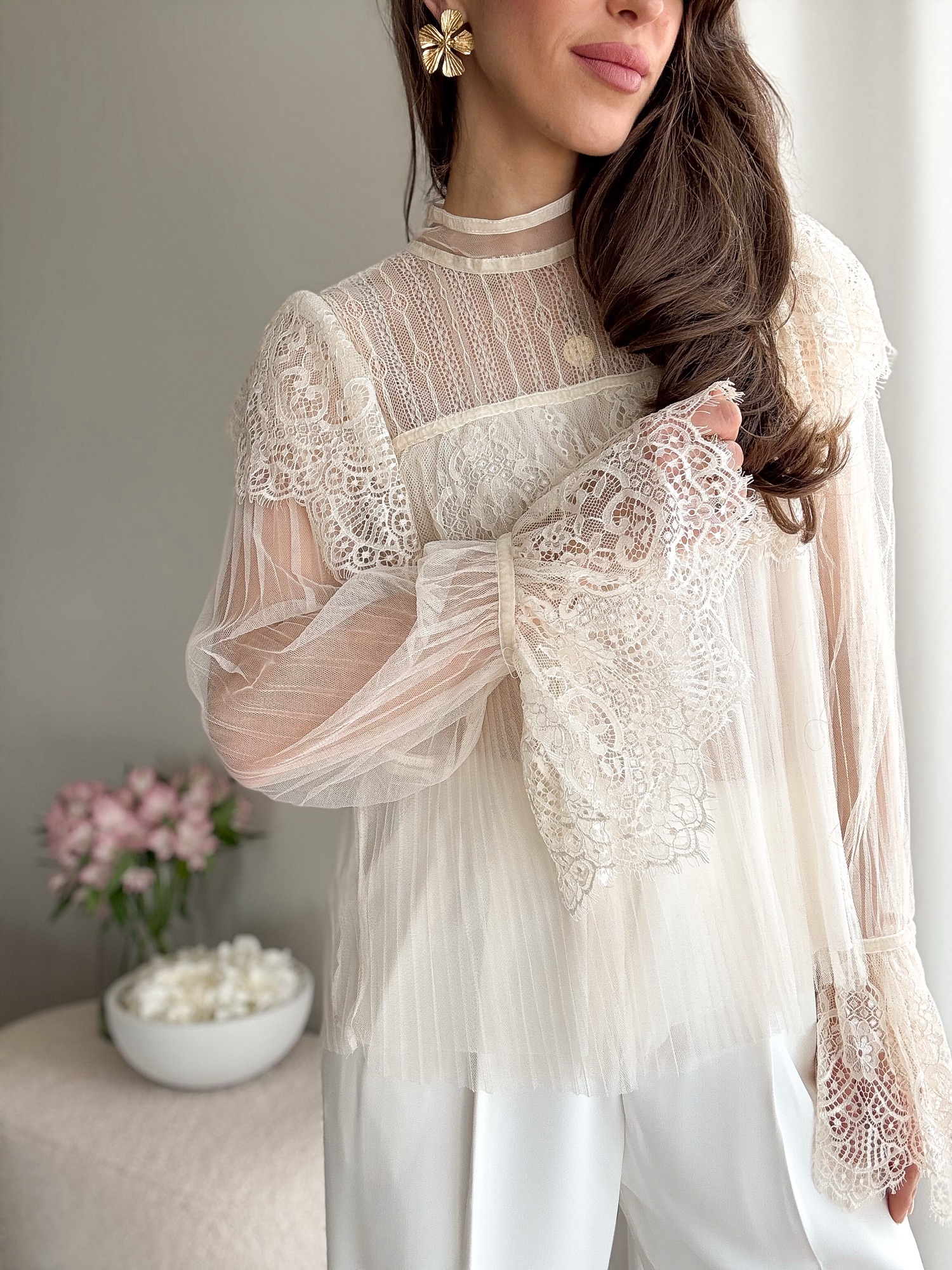 Koronkowa bluzka z rozszerzanymi rękawami i stójką.