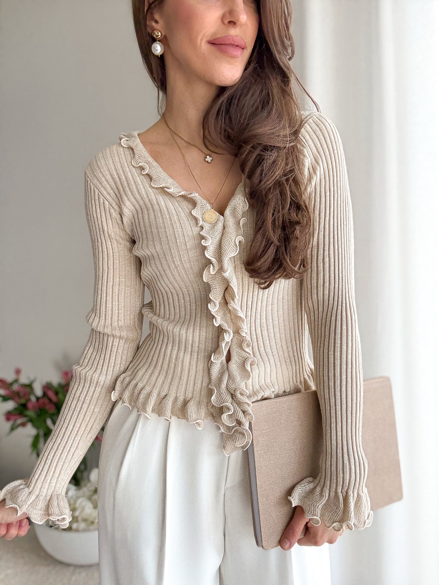 Kołnierzyk przy szyi, zapinana po całej długości na guziki.