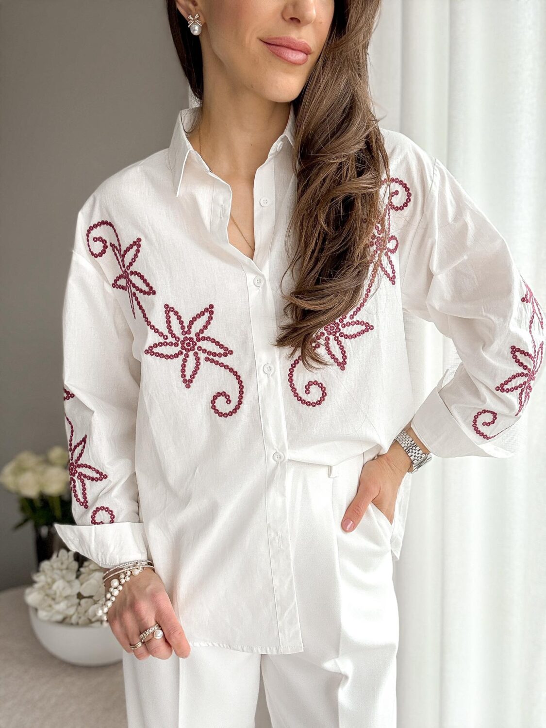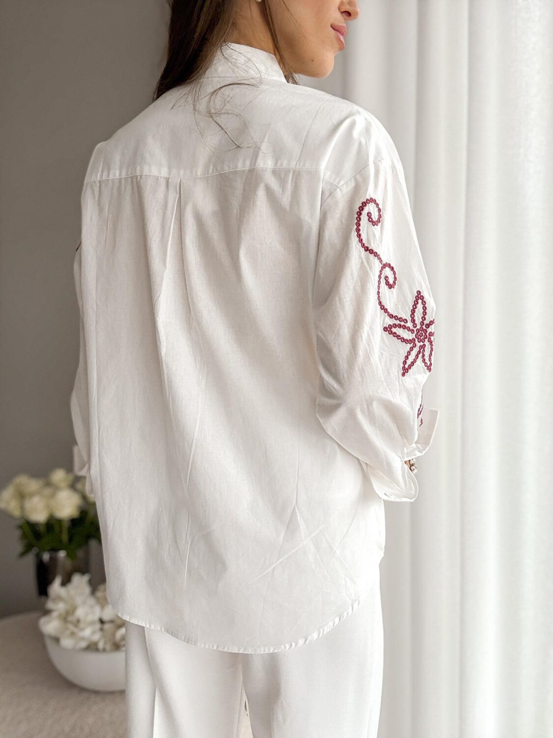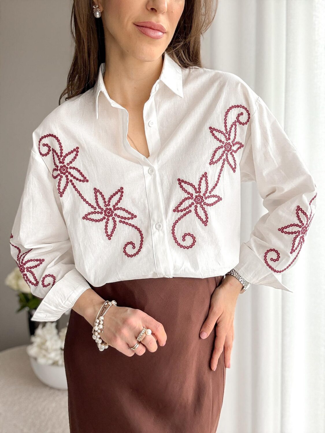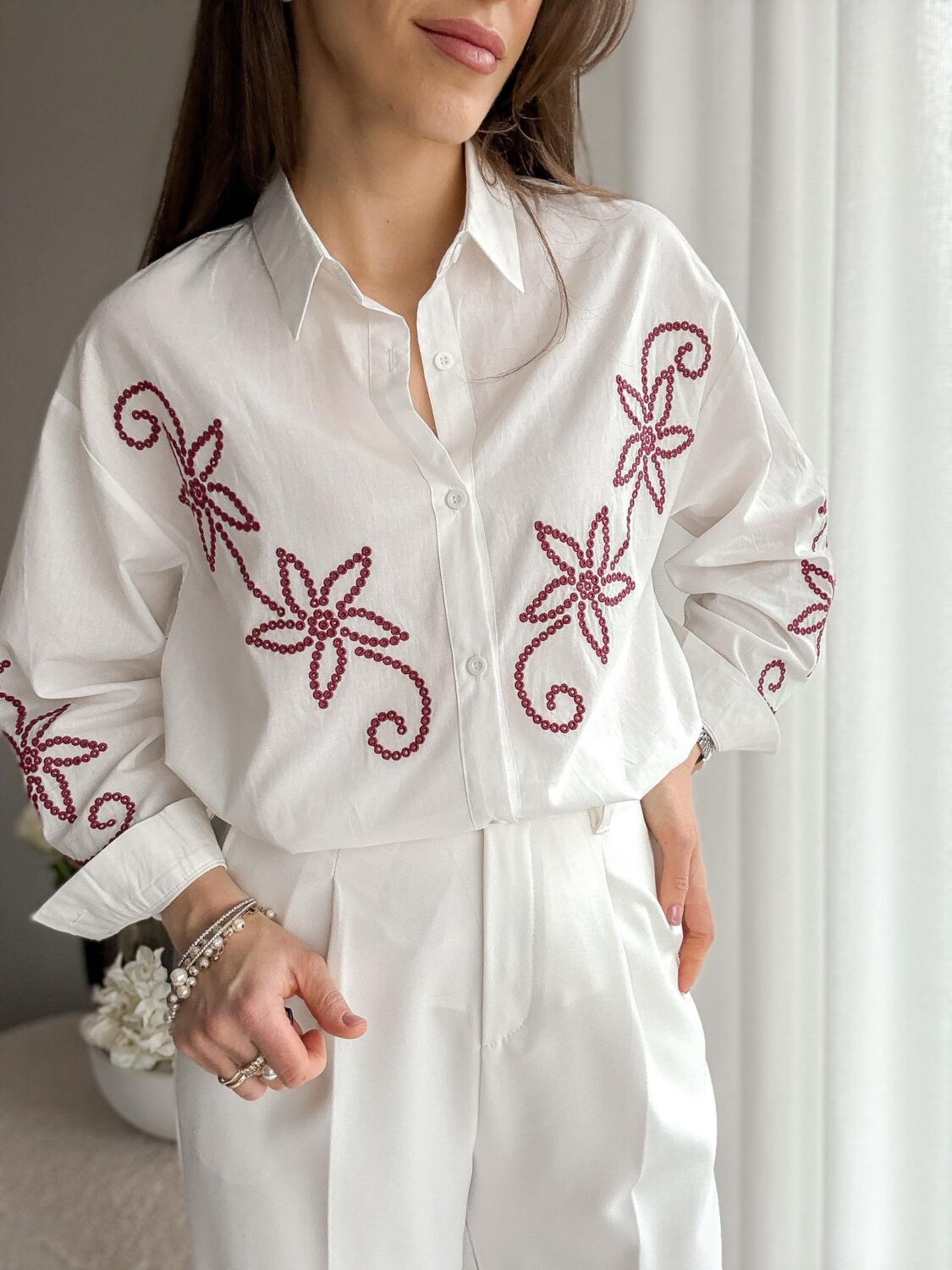 Klasyczna biała koszula z haftowanymi kwiatami na przodzie koszuli i rękawach.