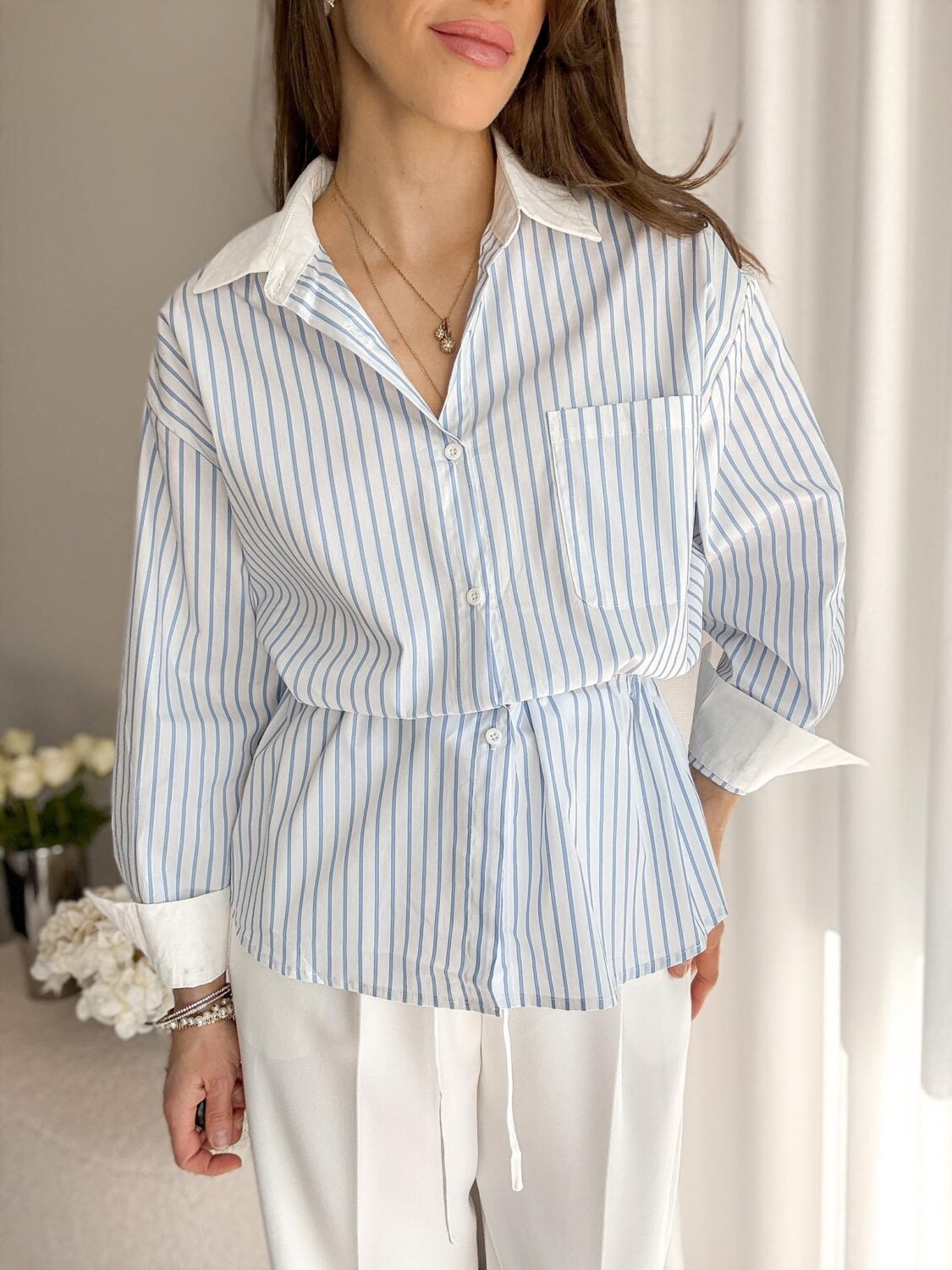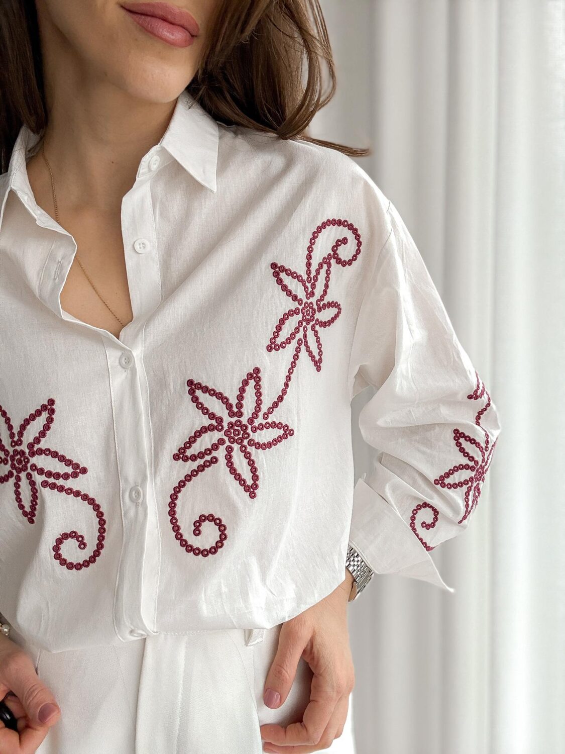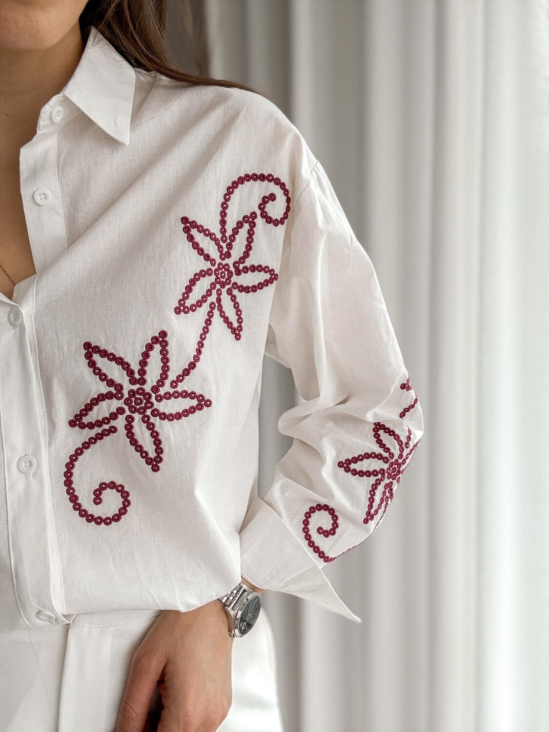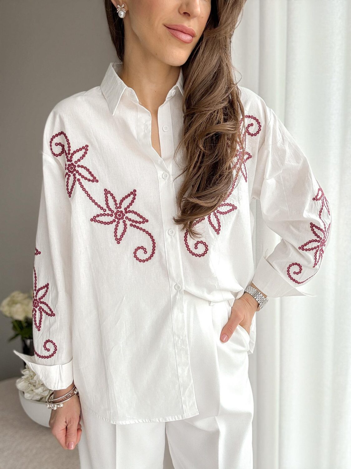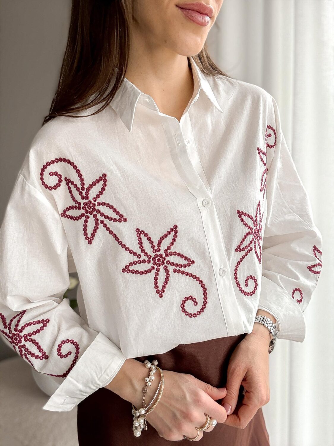 Klasyczna biała koszula z haftowanymi kwiatami na przodzie koszuli i rękawach.