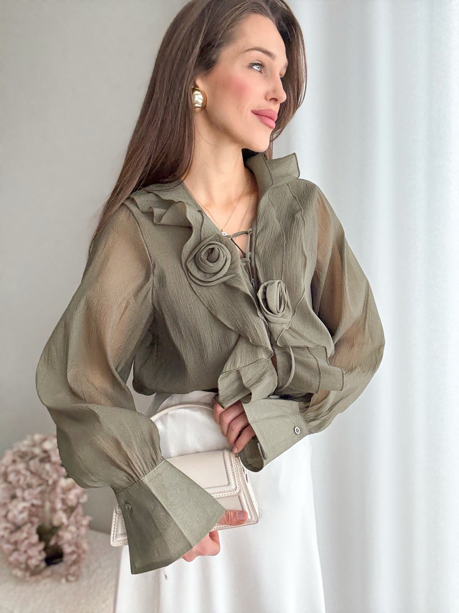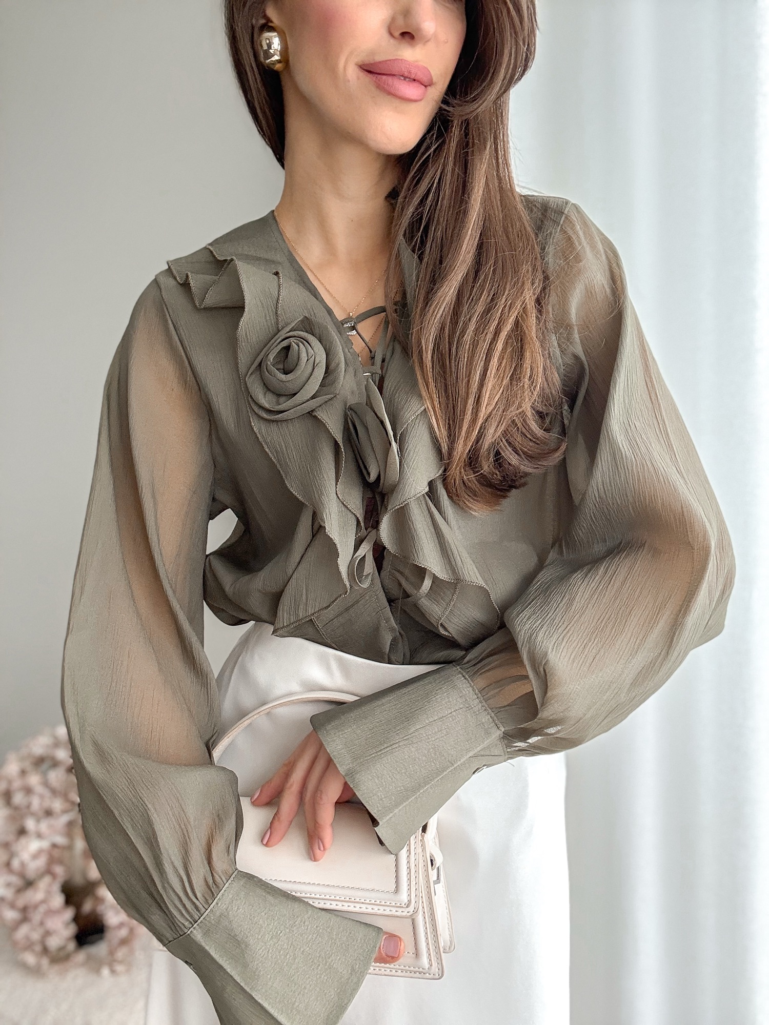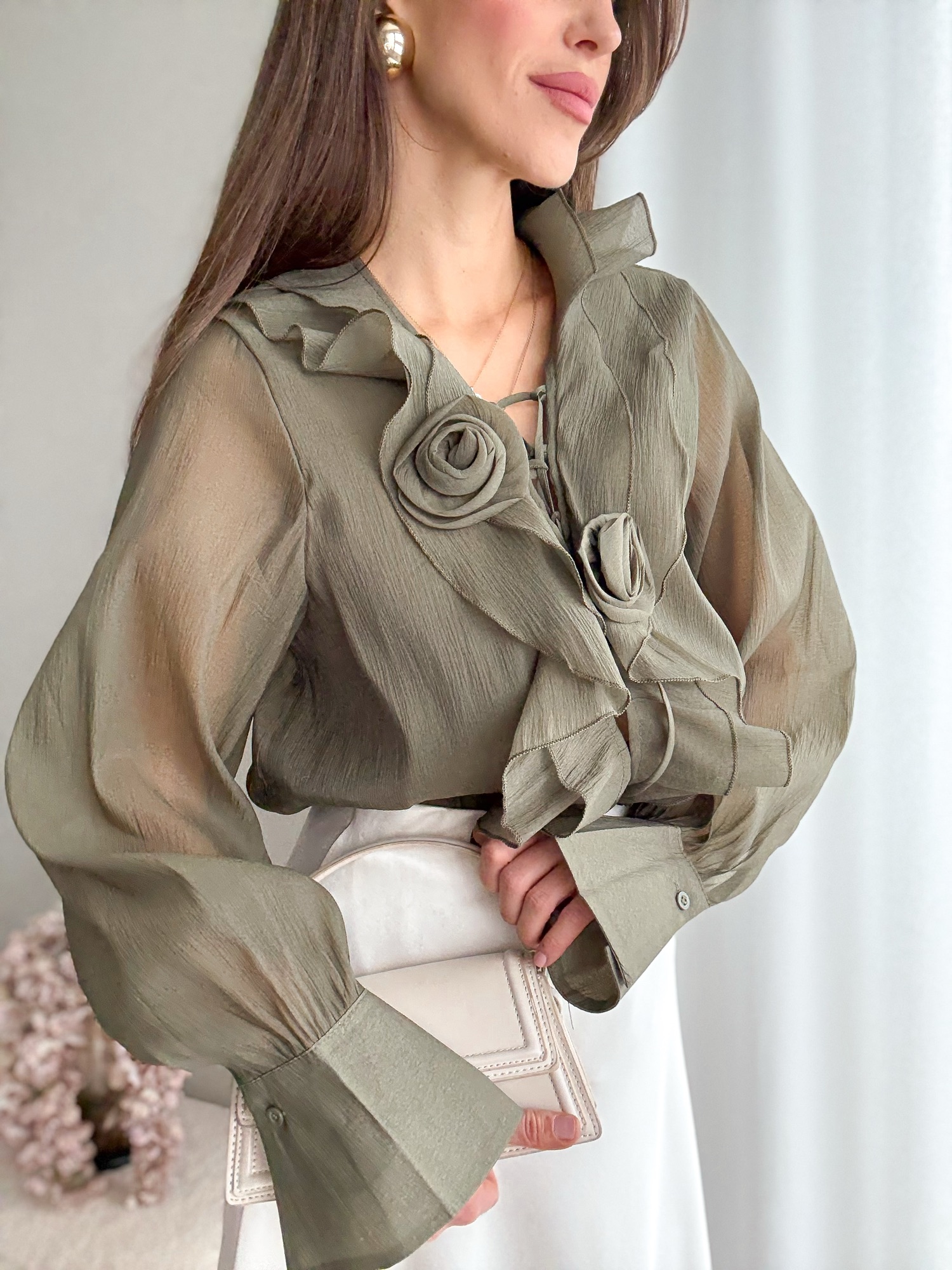Koszula bogato zdobiona falbanami i dwoma kwiatami zapinanymi na agrafkę.