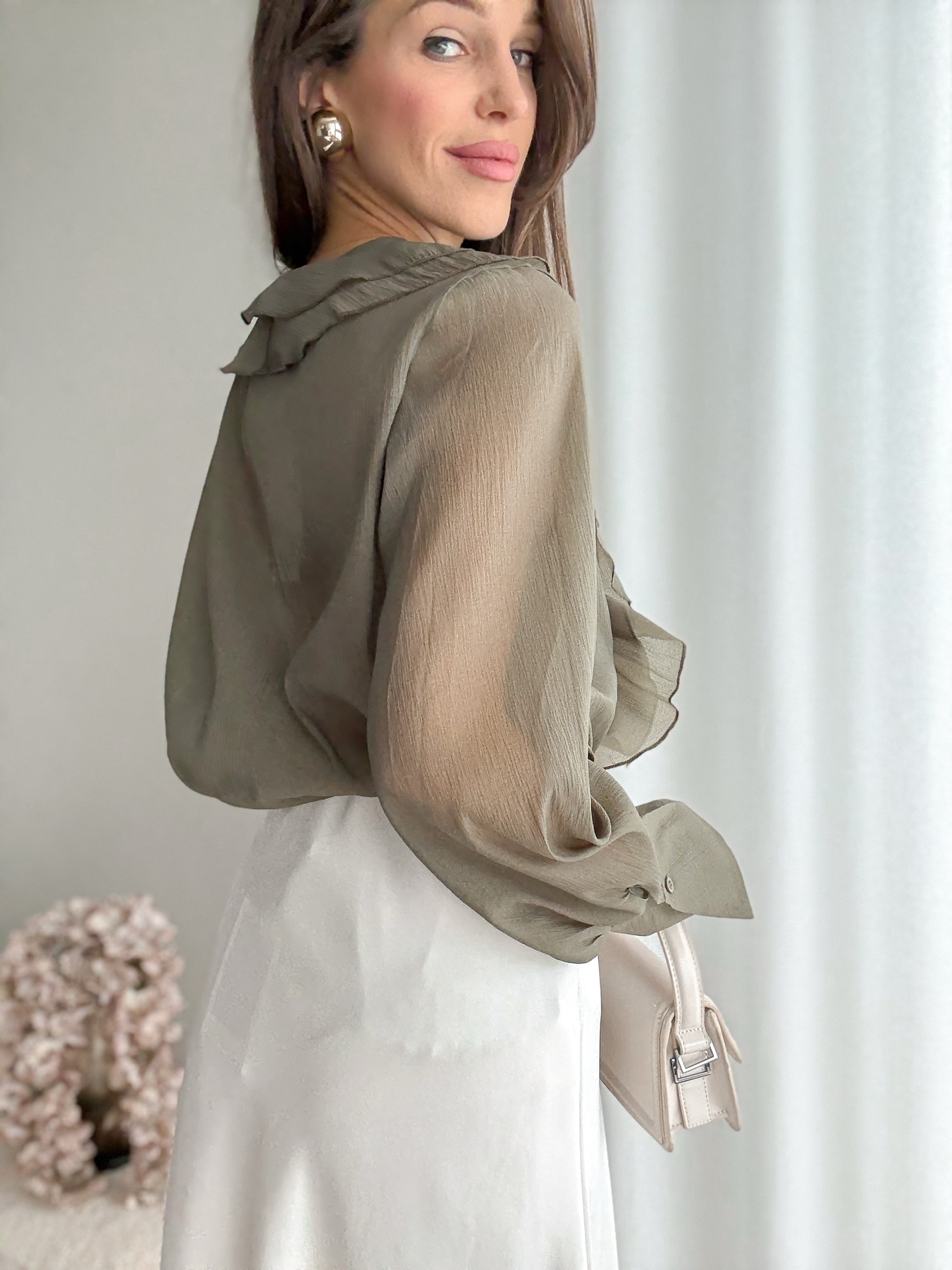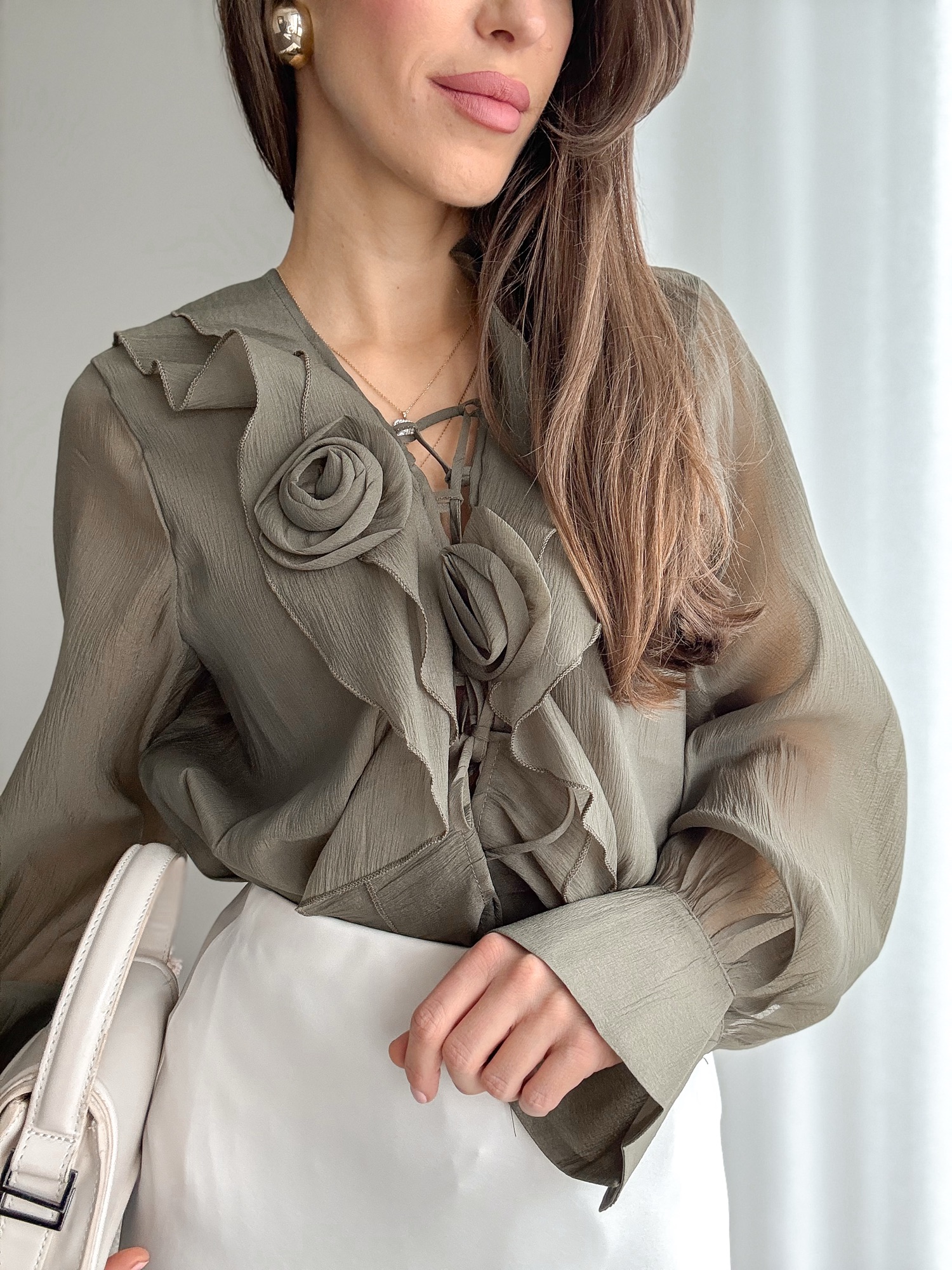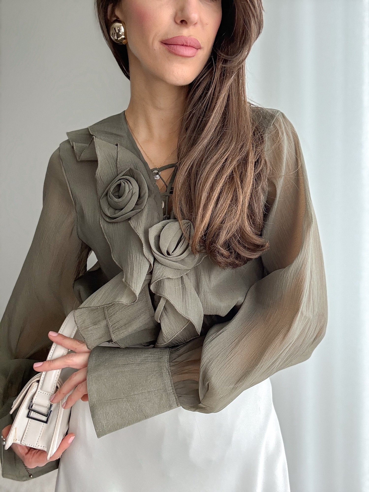 Koszula bogato zdobiona falbanami i dwoma kwiatami zapinanymi na agrafkę.