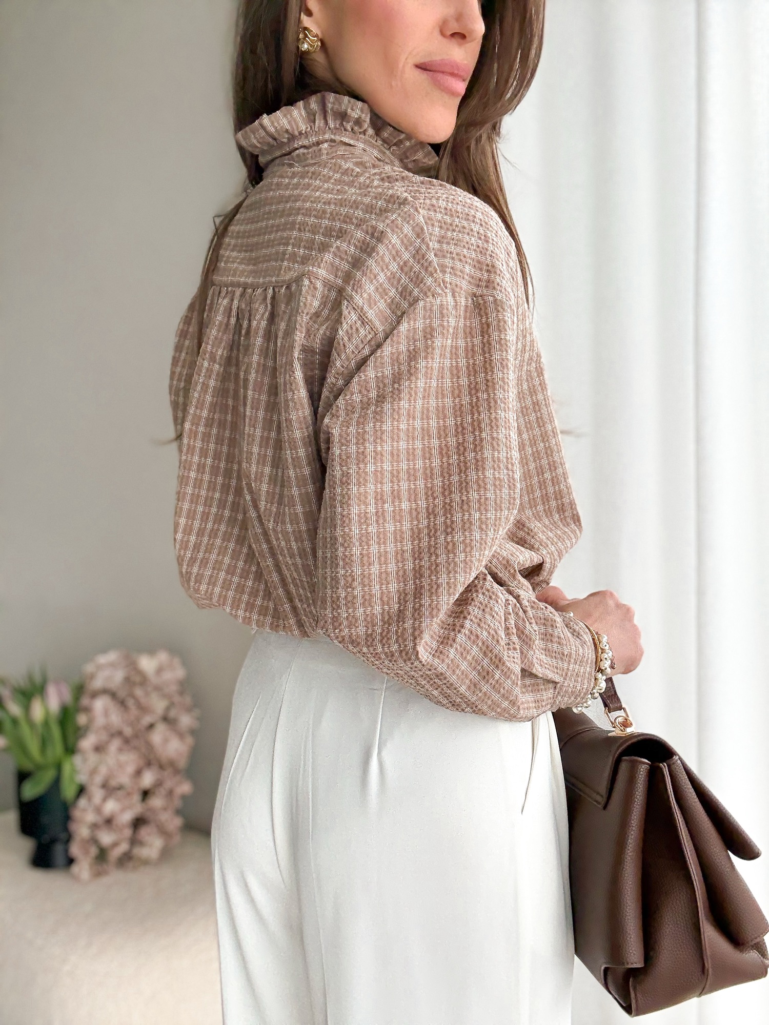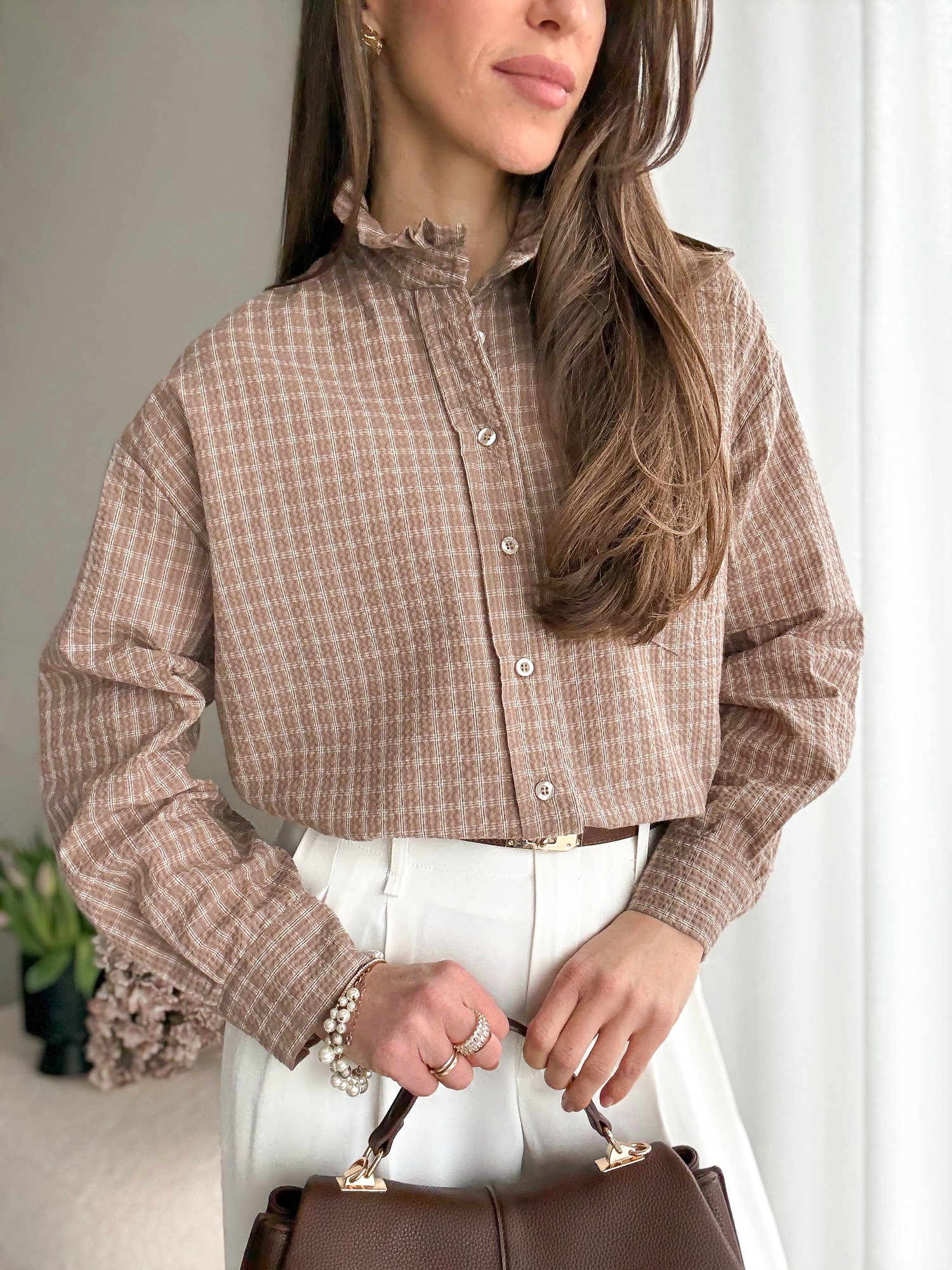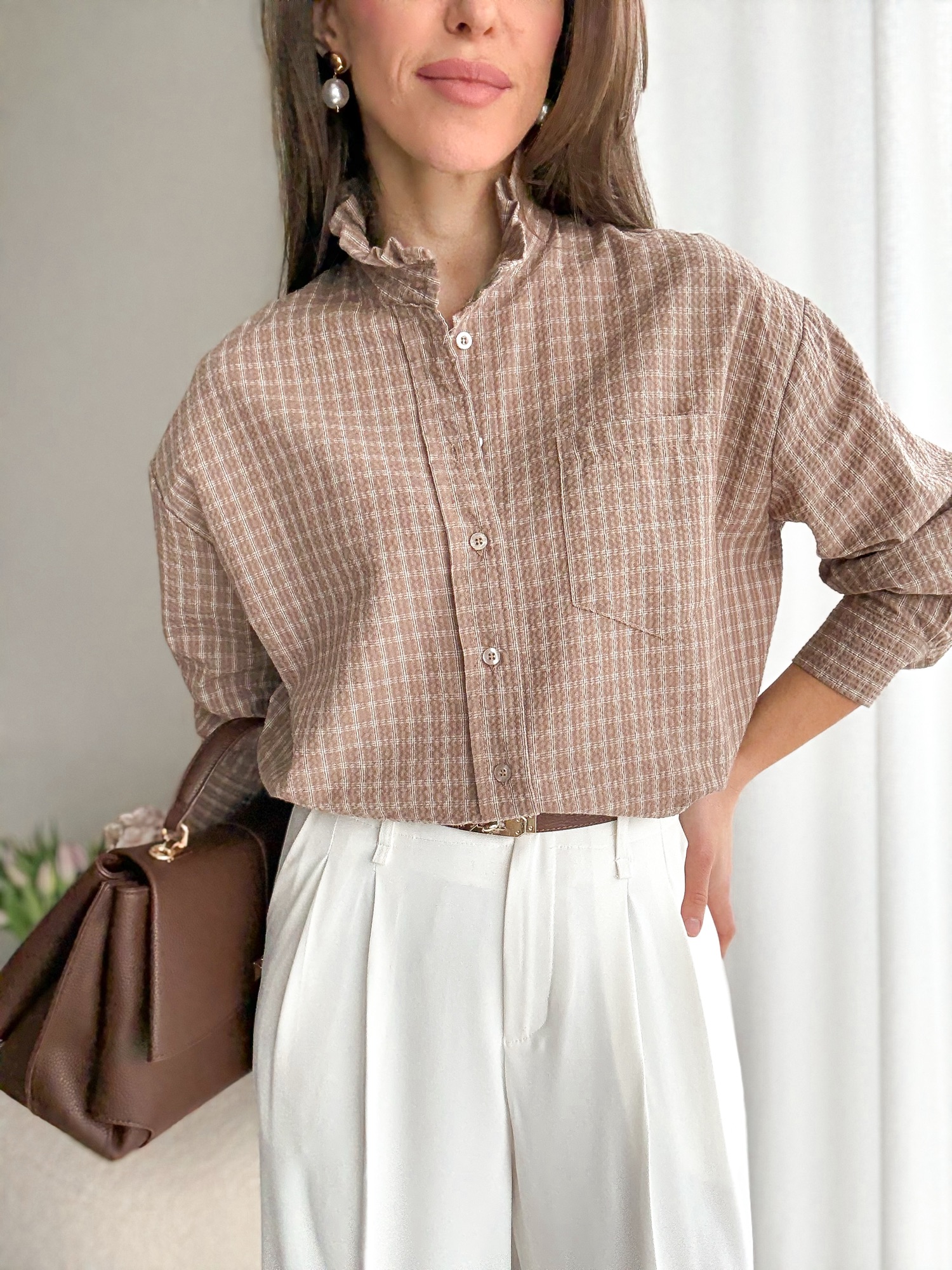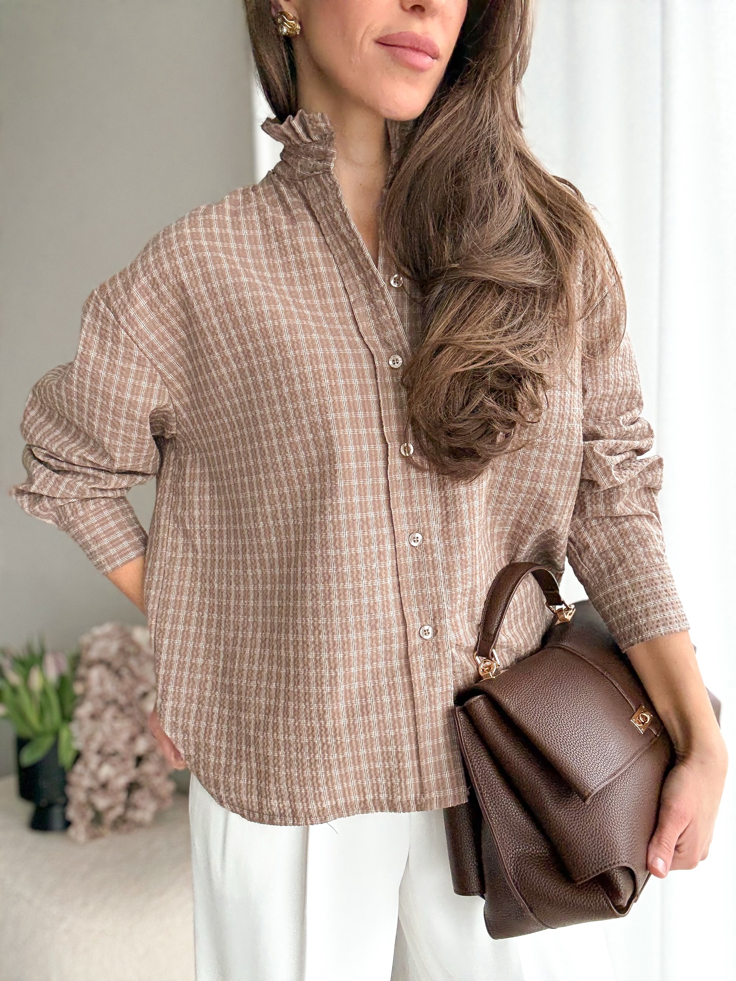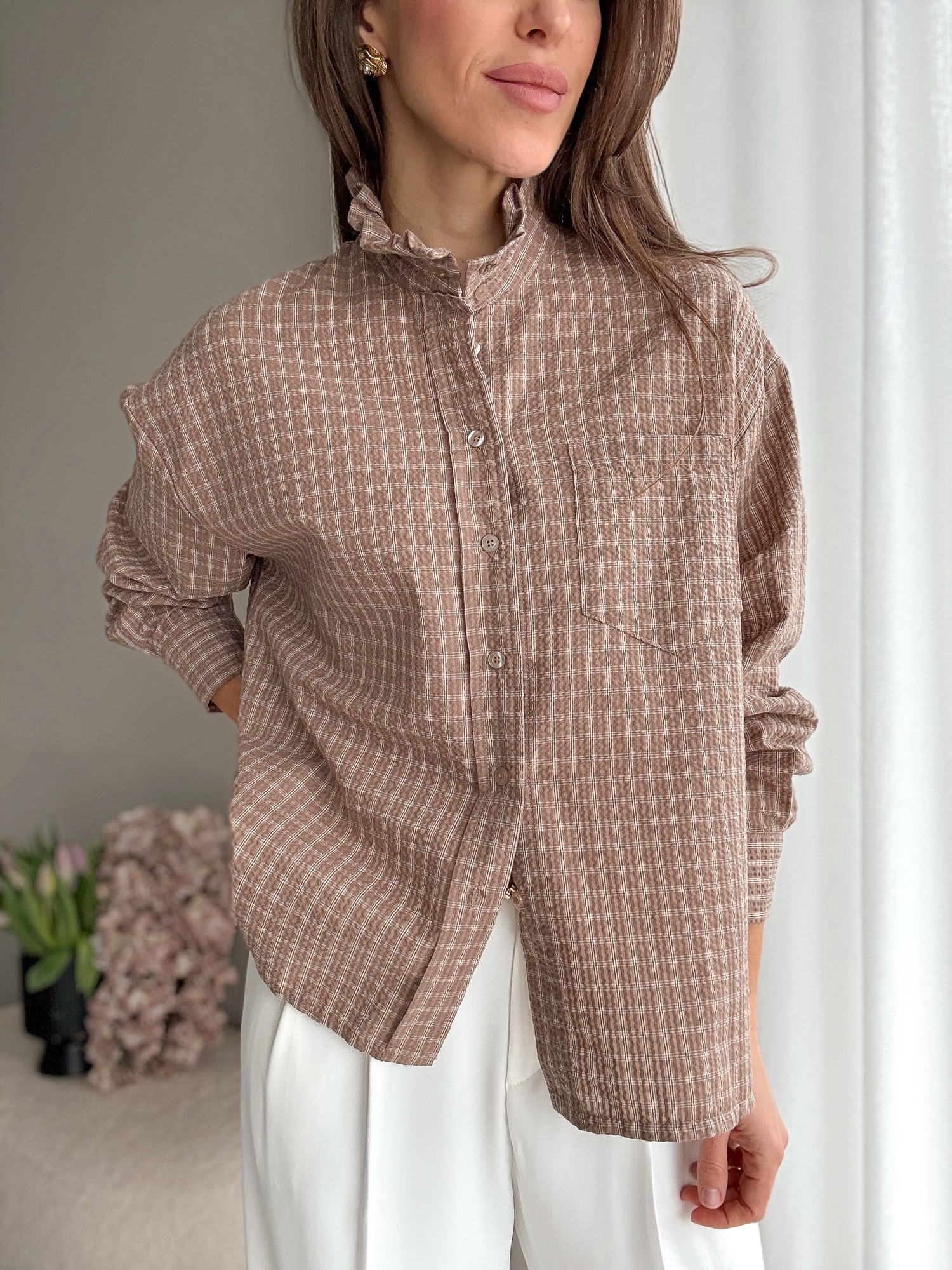 Koszula w drobną krateczkę o prostym kroju z ozdobną, falbaniastą stójką.