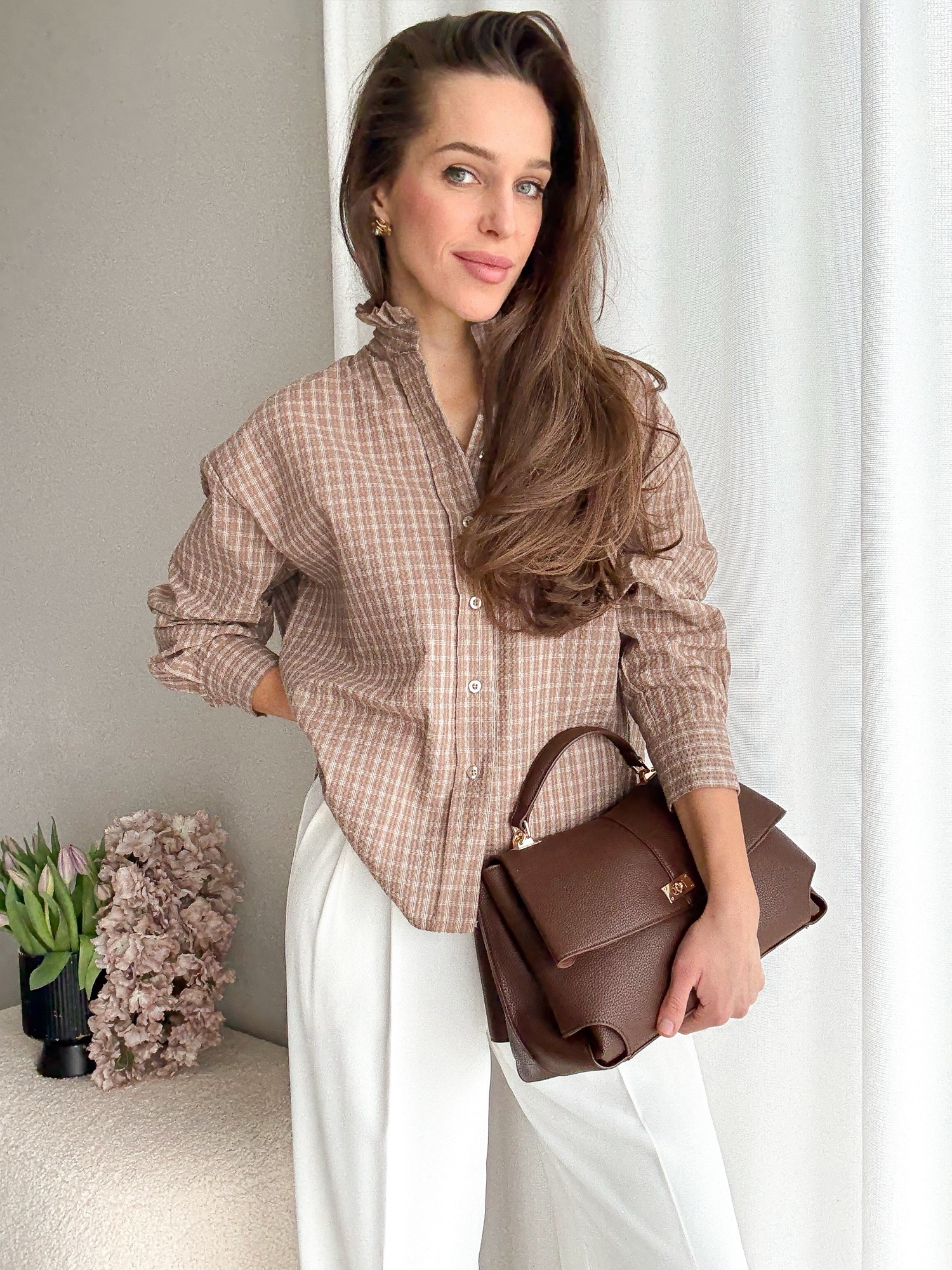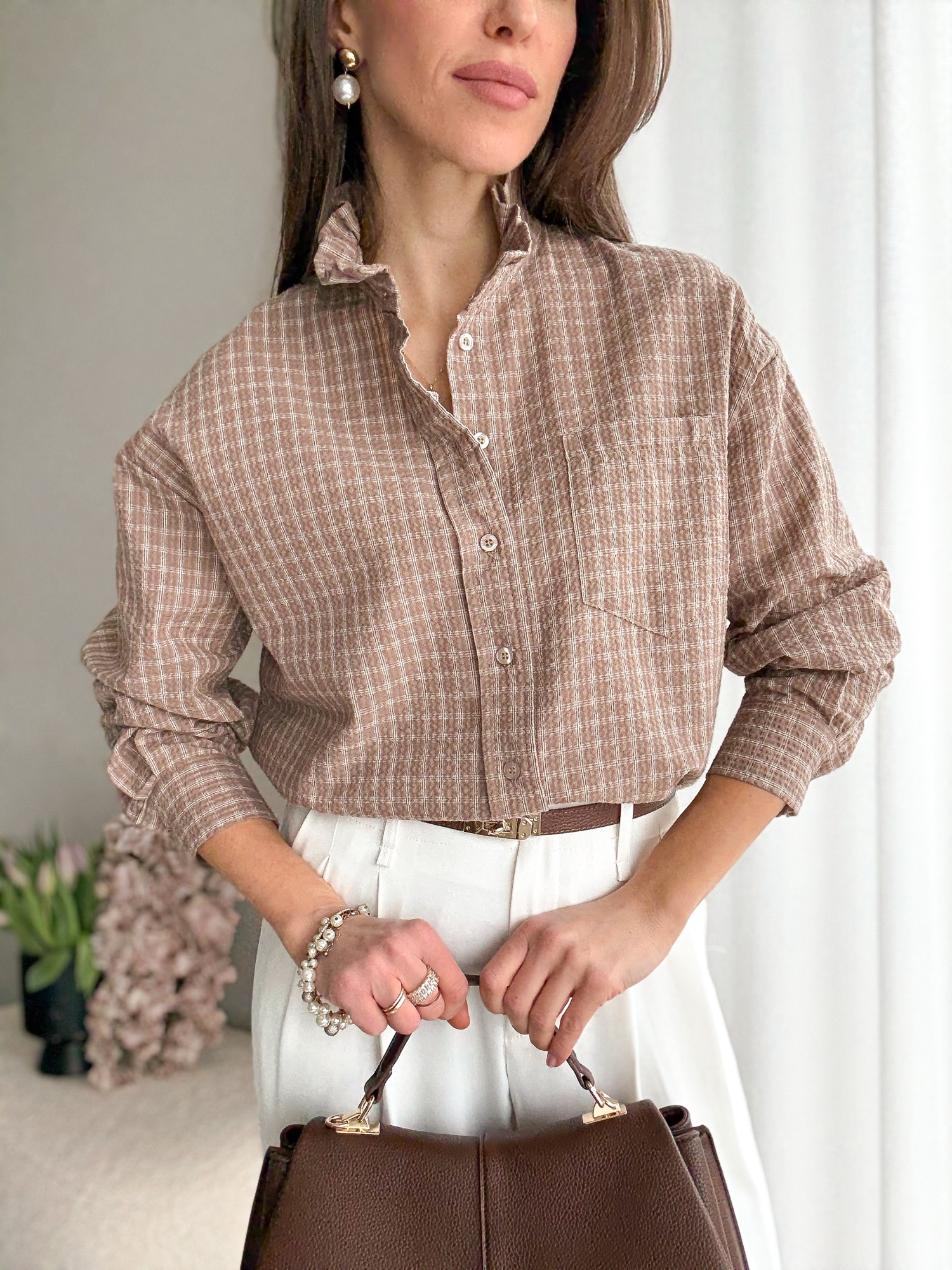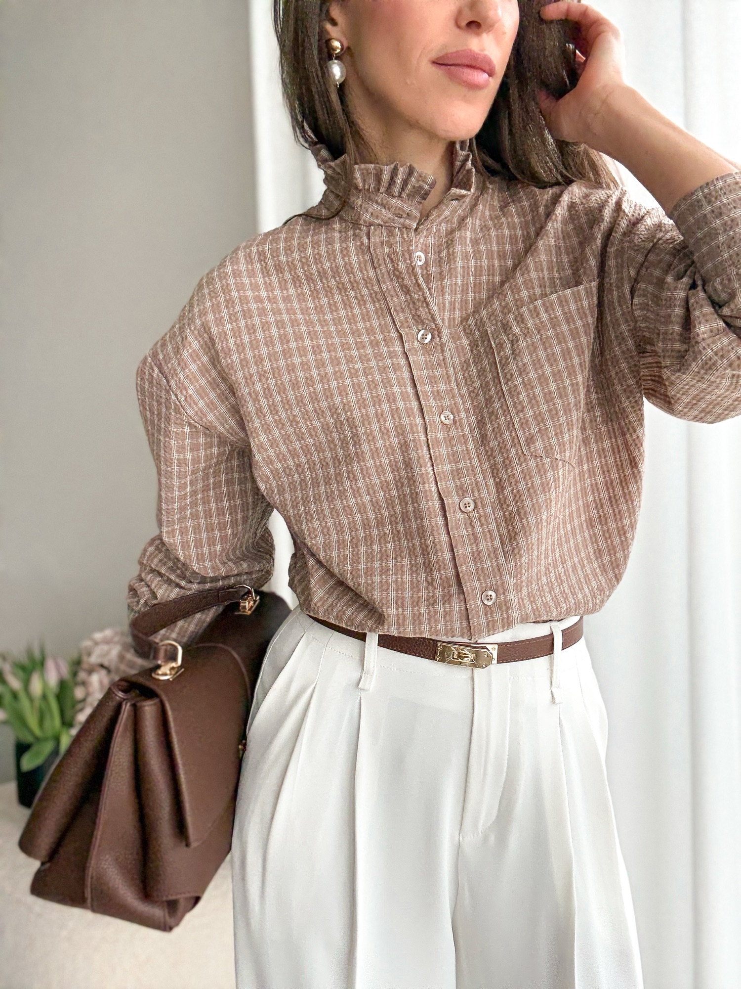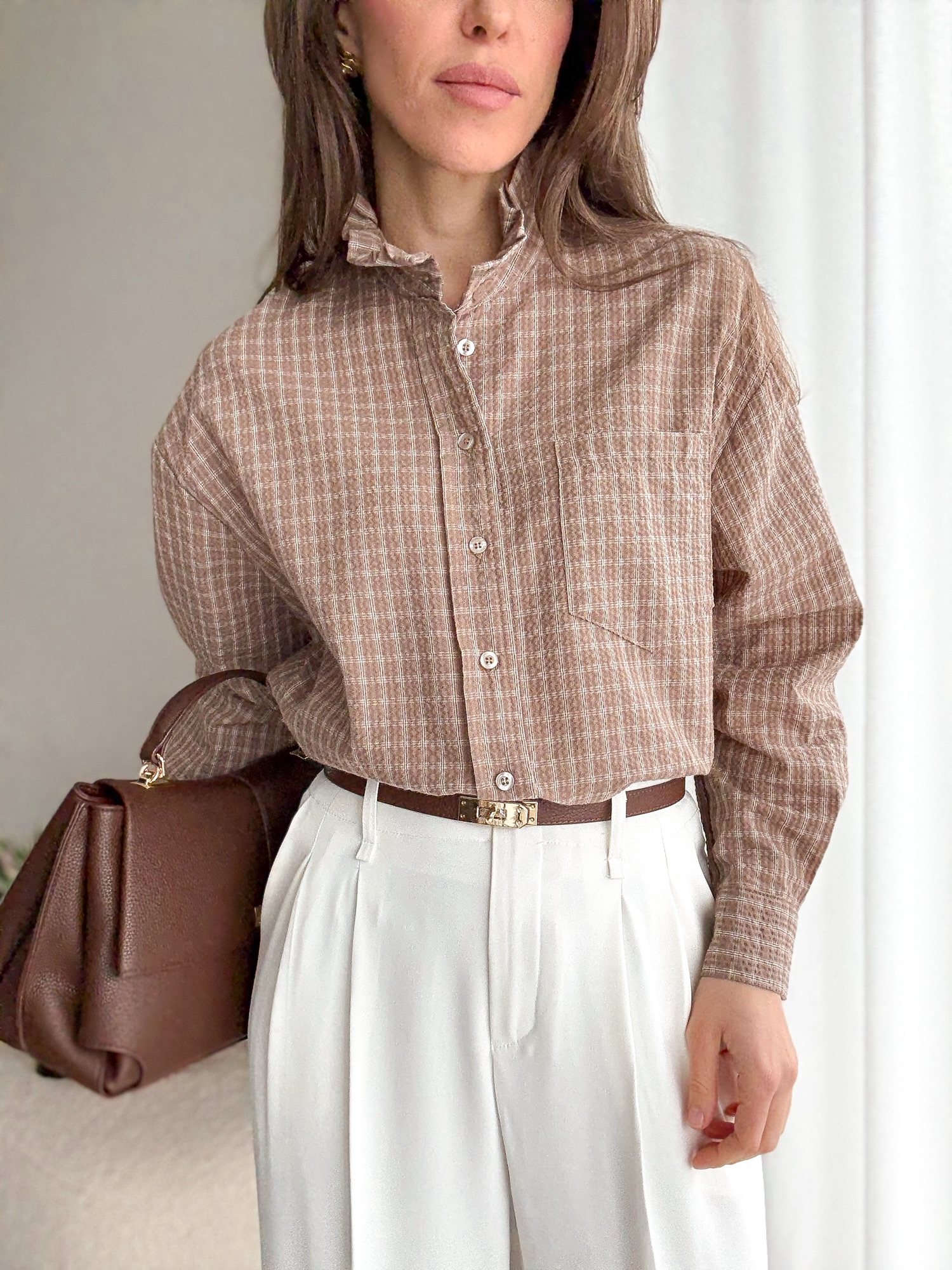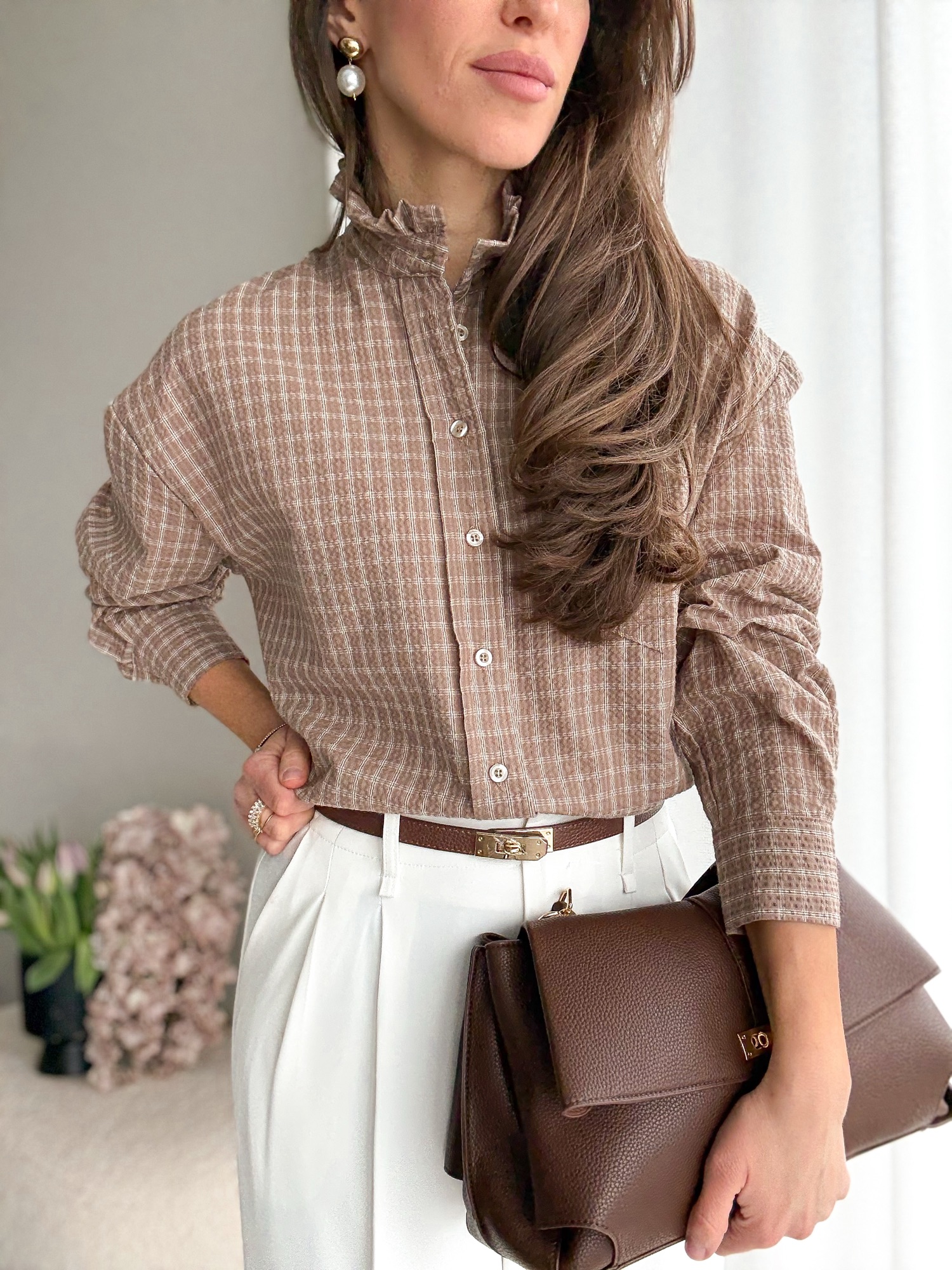 Koszula w drobną krateczkę o prostym kroju z ozdobną, falbaniastą stójką.