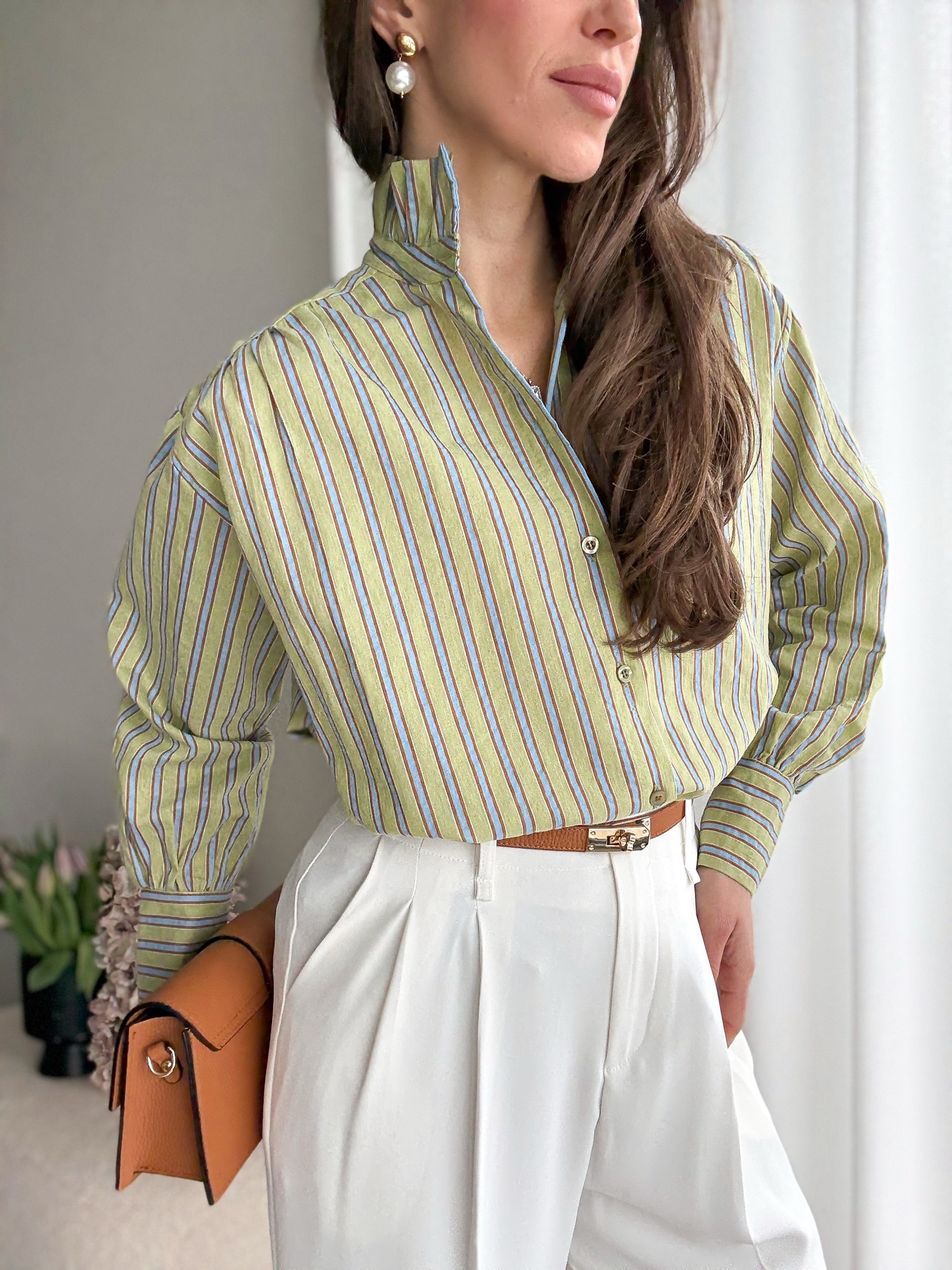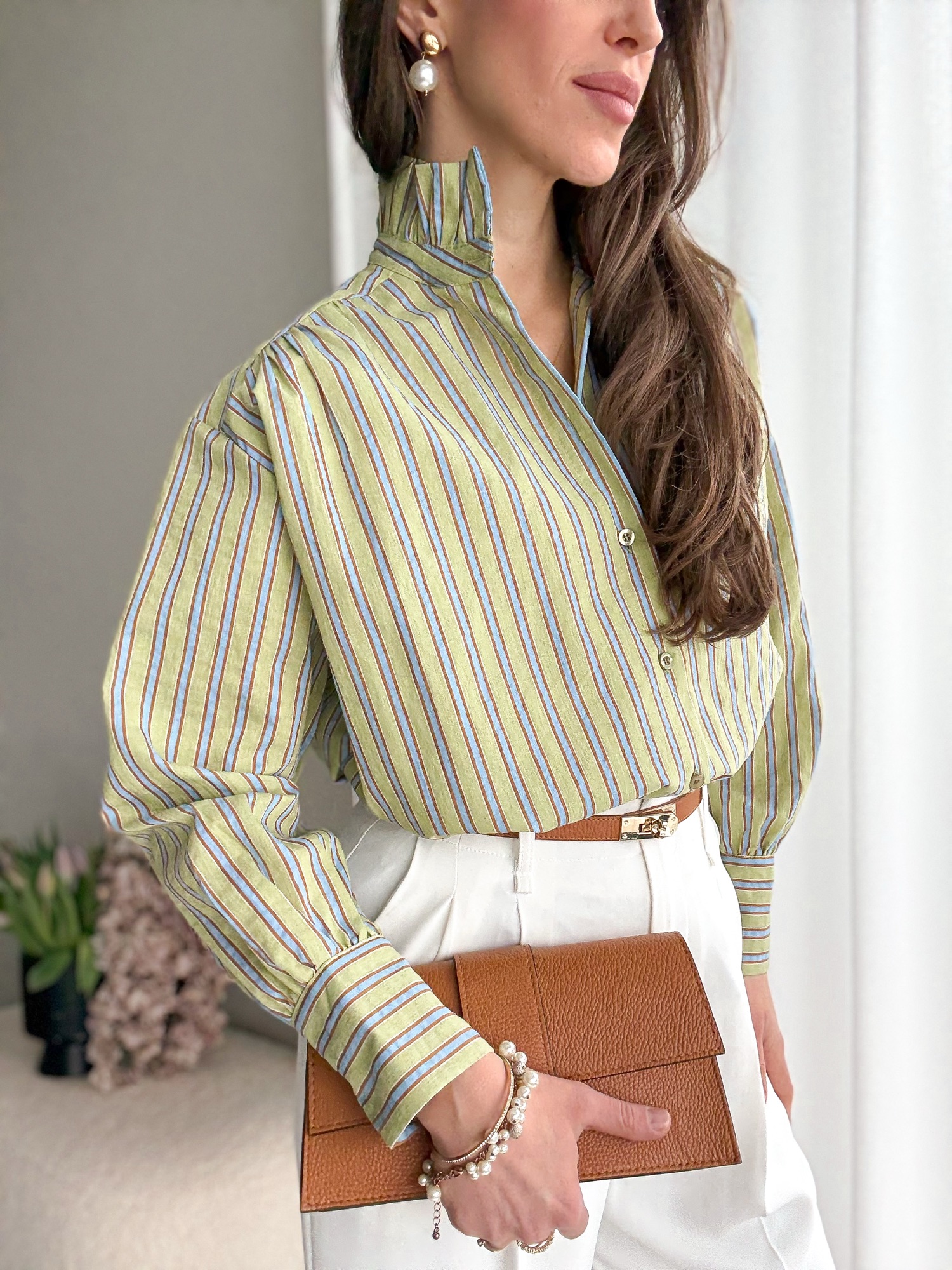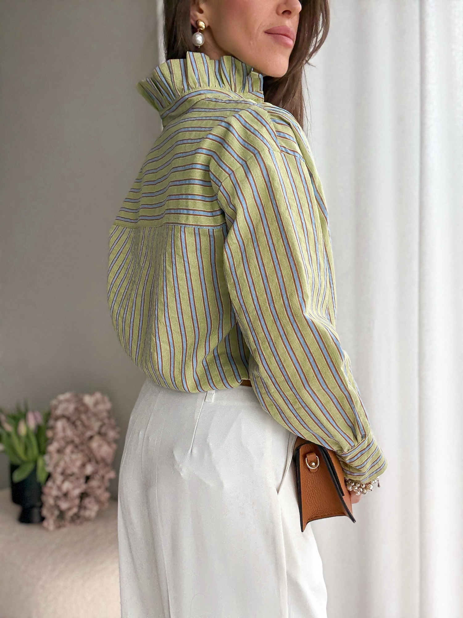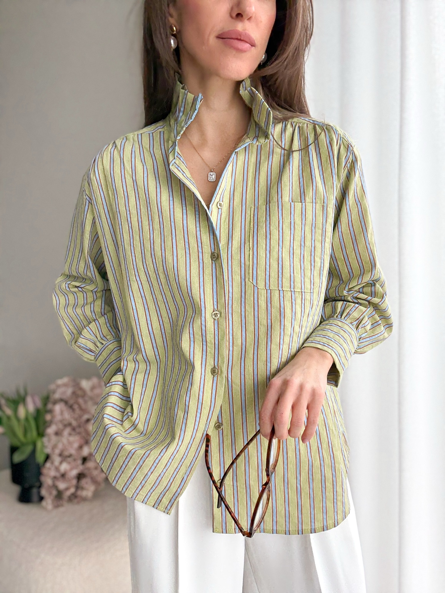Koszula w paski o prostym kroju z ozdobną, falbaniastą stójką.