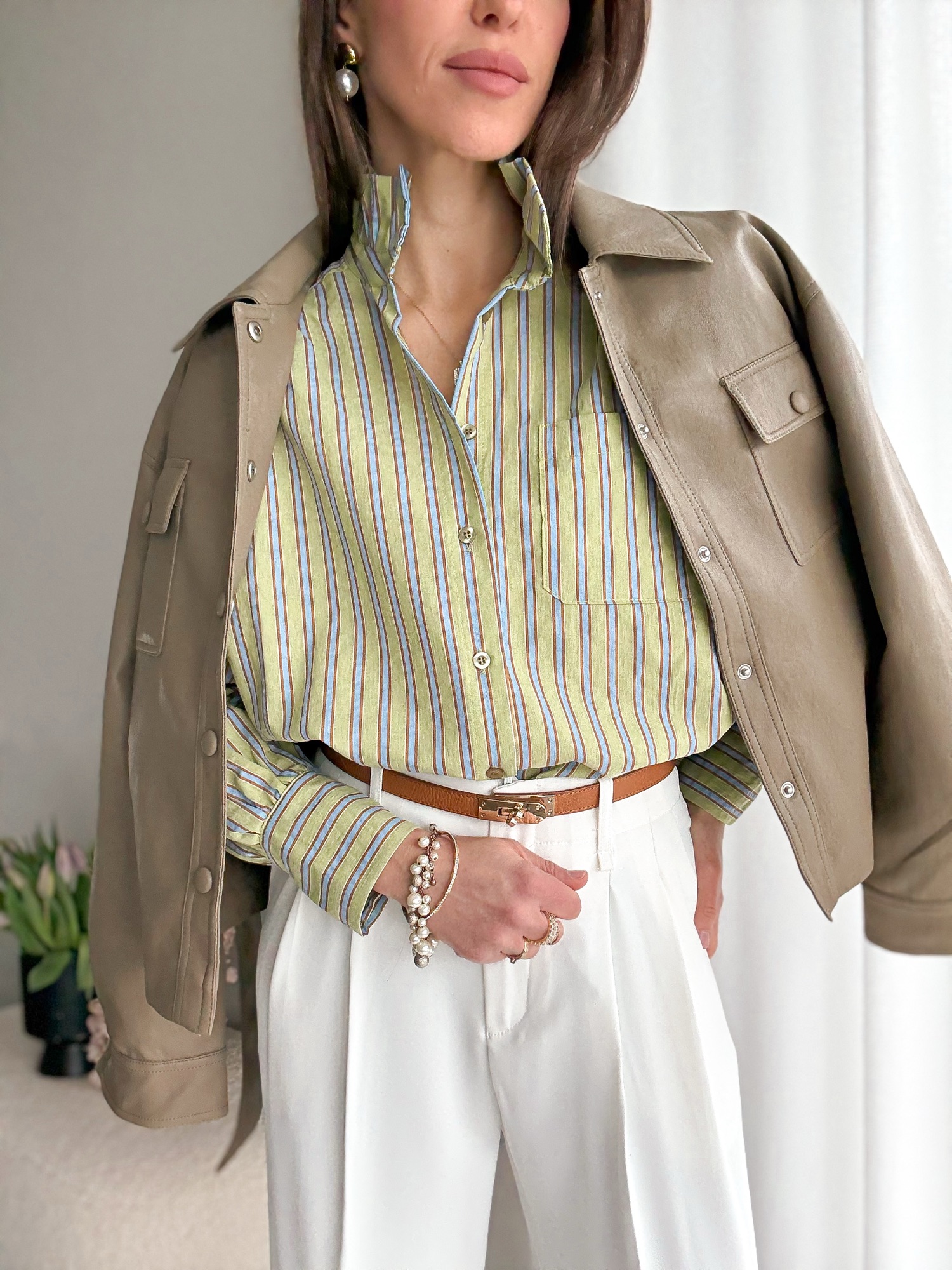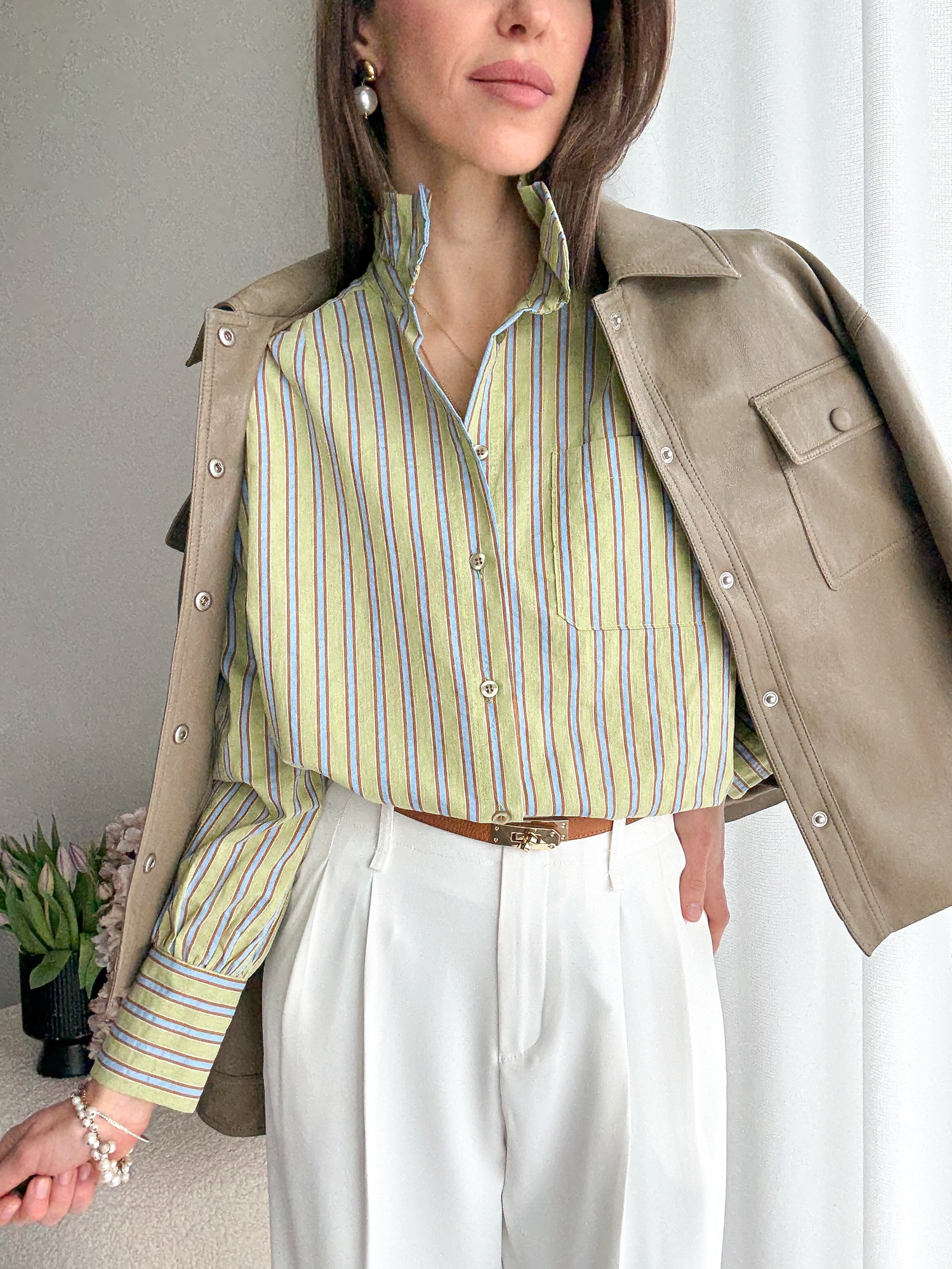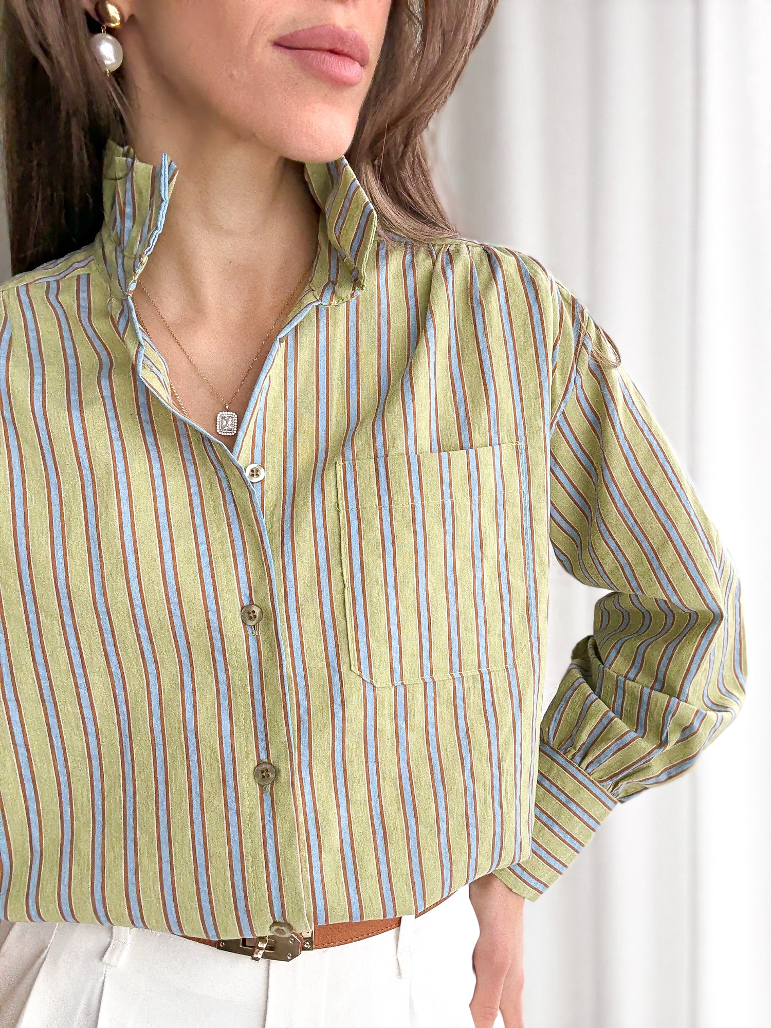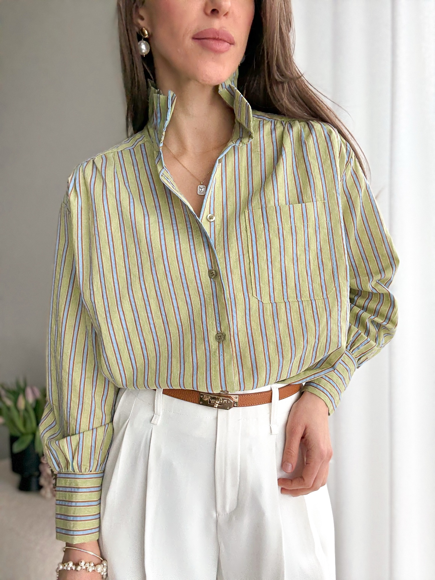 Koszula w paski o prostym kroju z ozdobną, falbaniastą stójką.