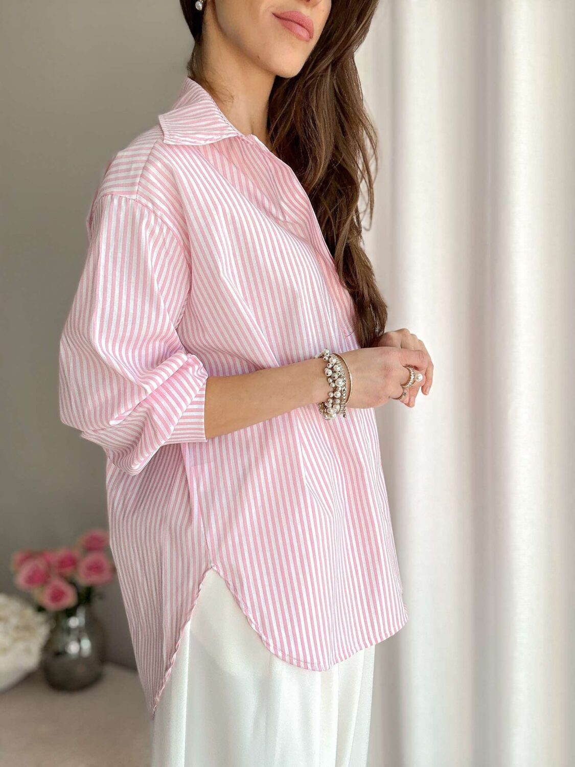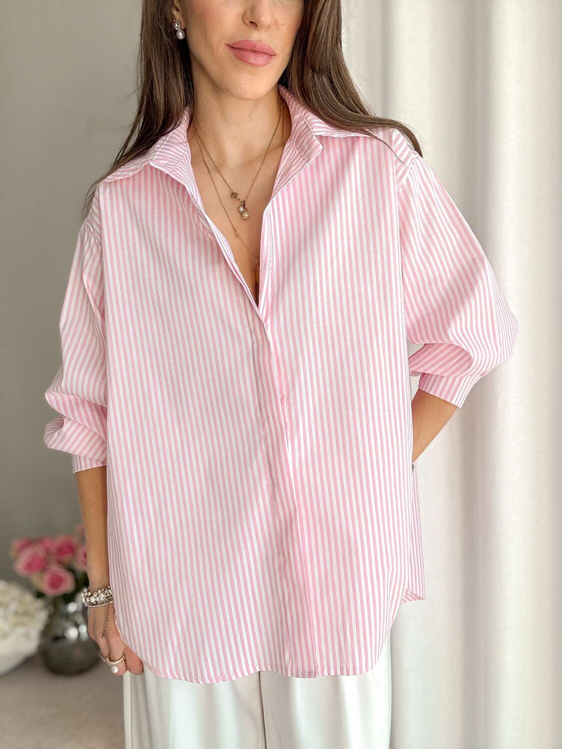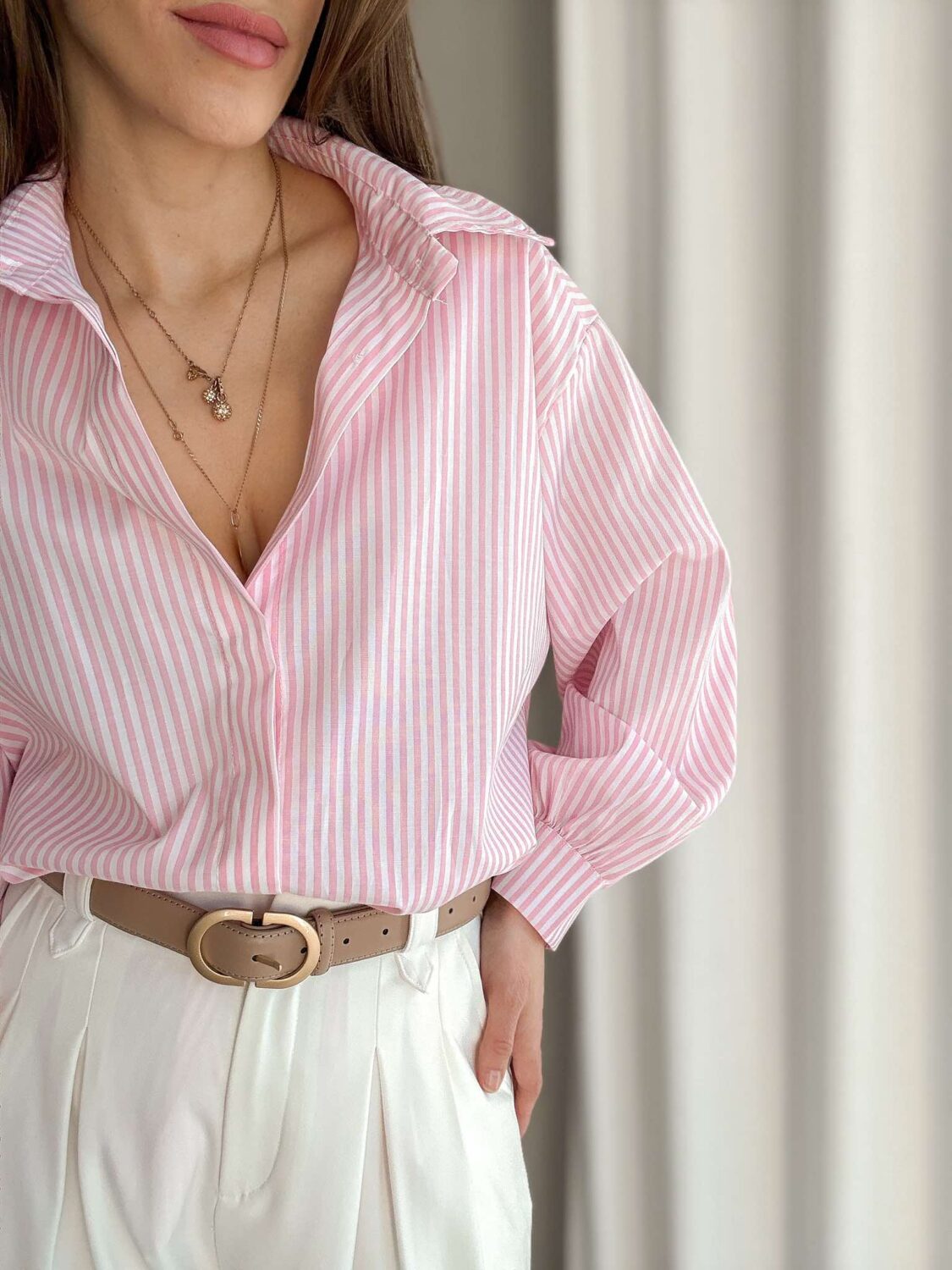 Koszula o fasonie oversize zapinana na guziczki schowane pod plisą.