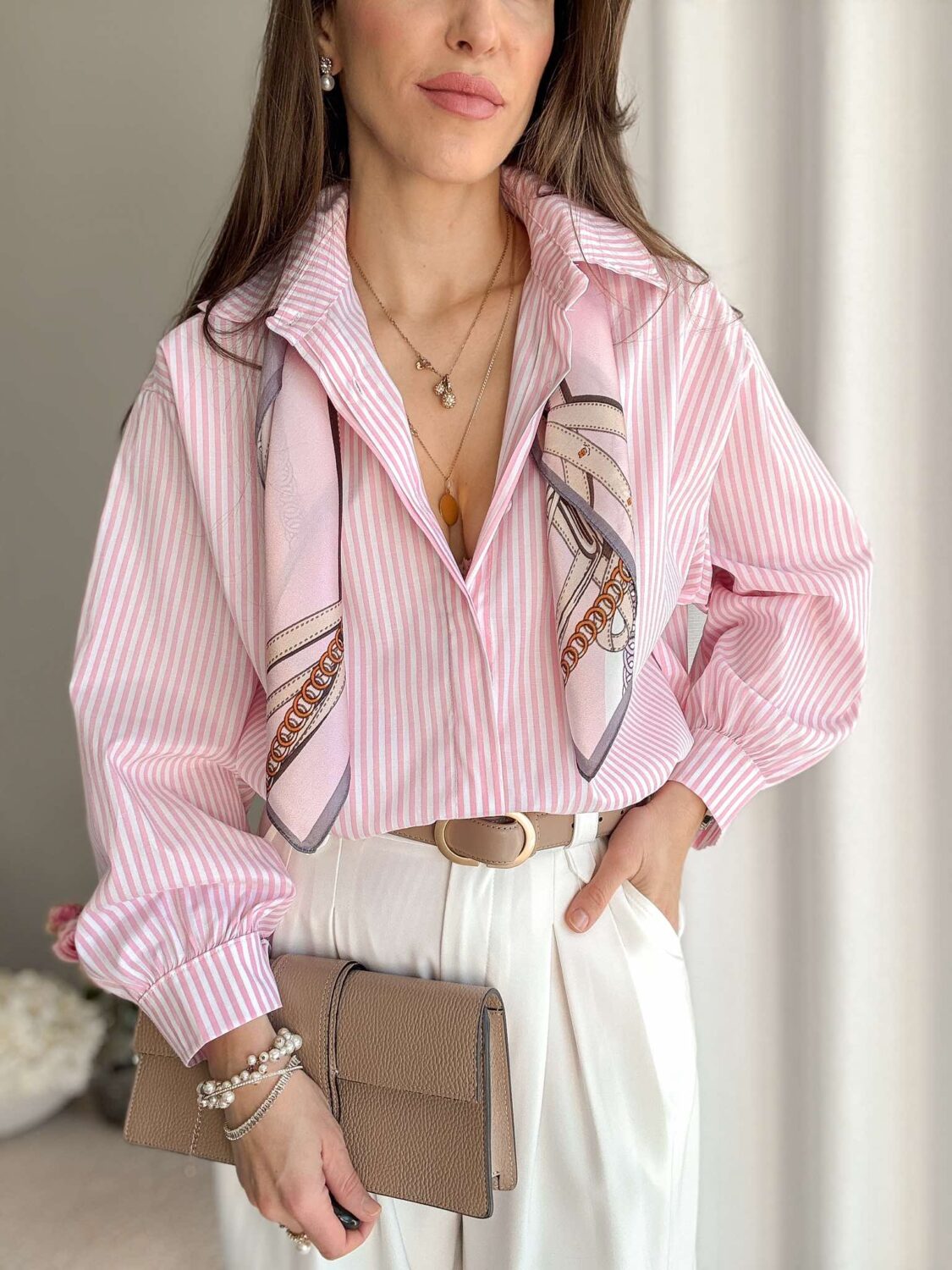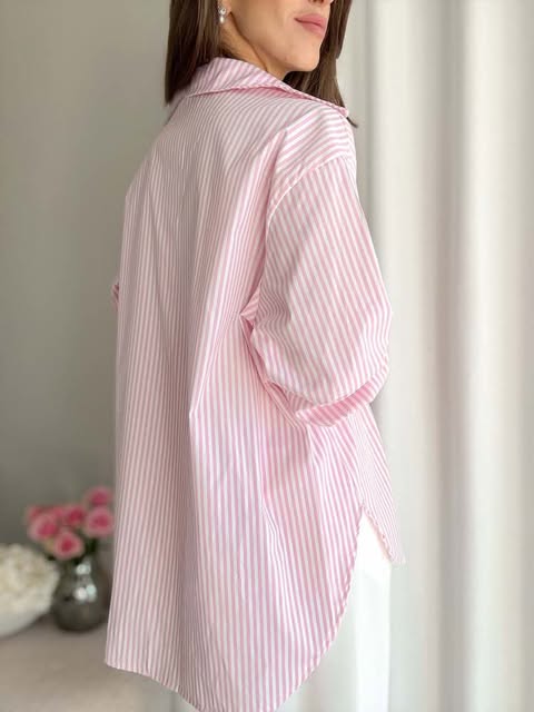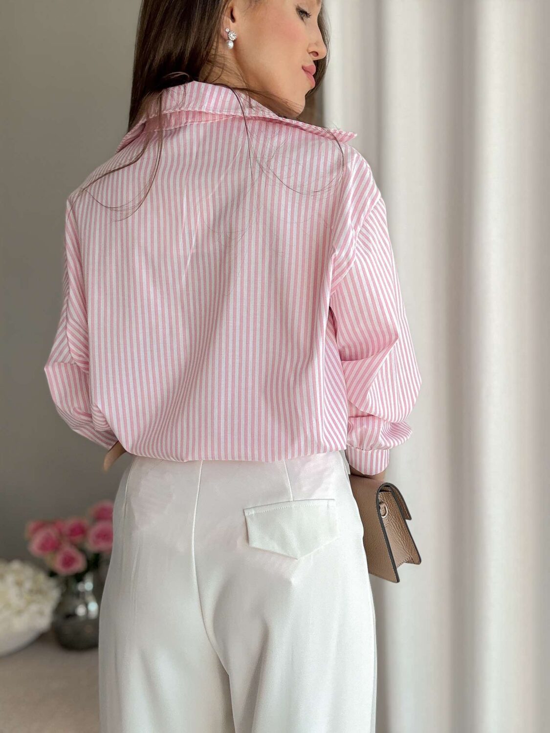 Koszula o fasonie oversize zapinana na guziczki schowane pod plisą.