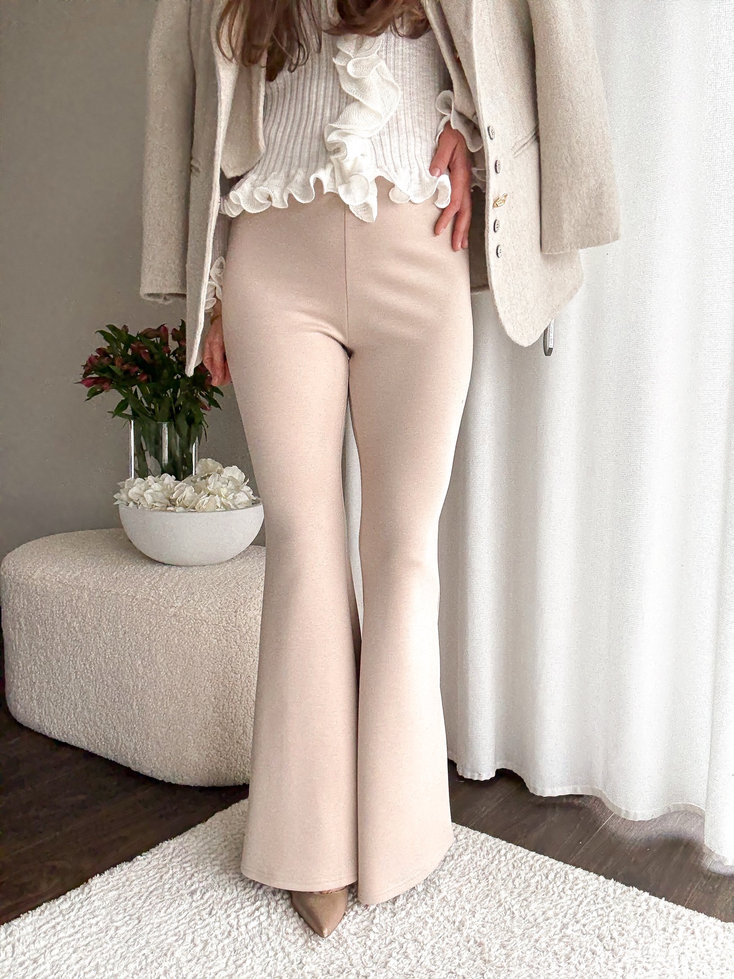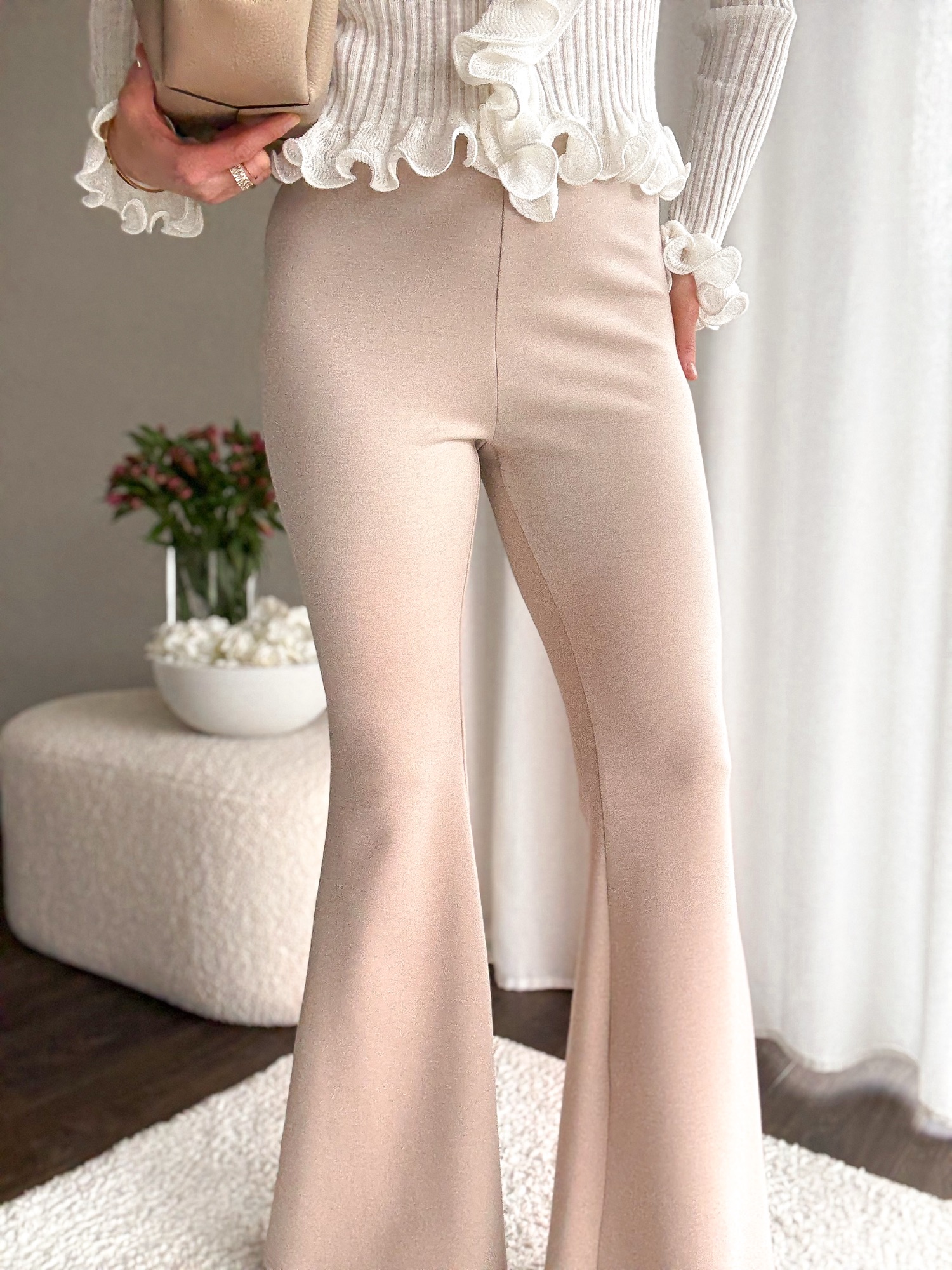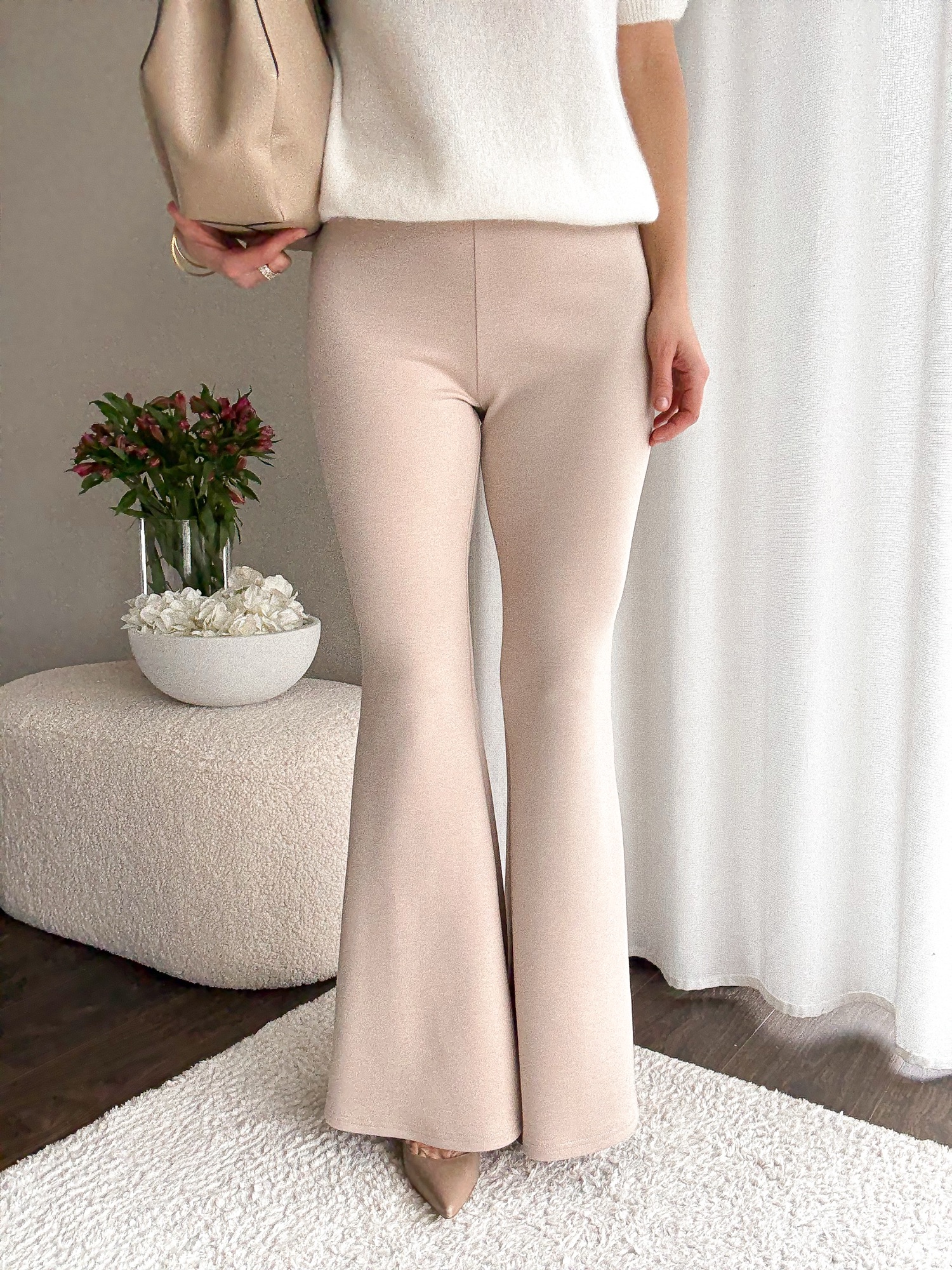 Legginsy dopasowane w talii i biodrach i mocno rozszerzaną nogawką.