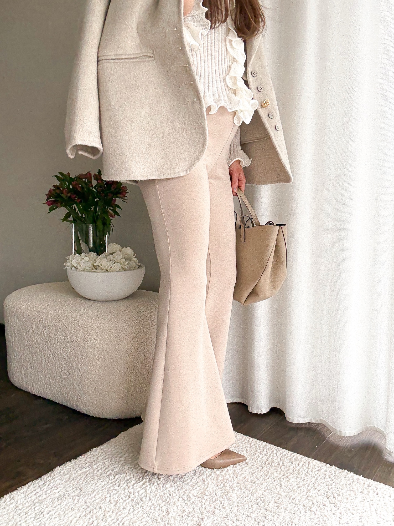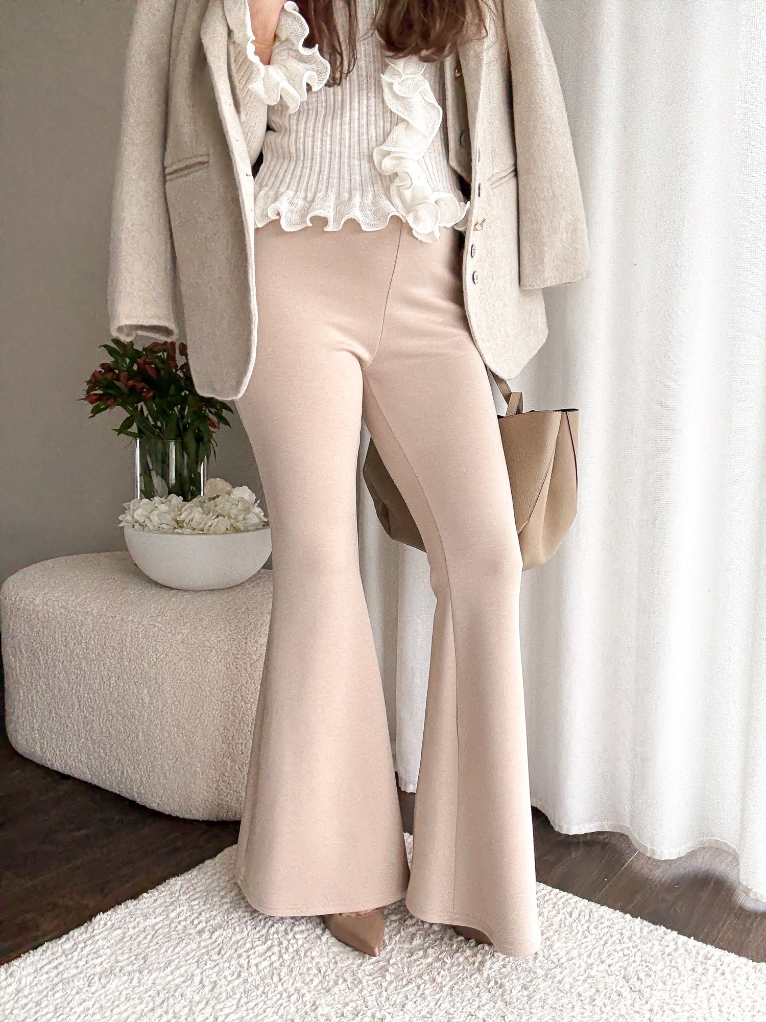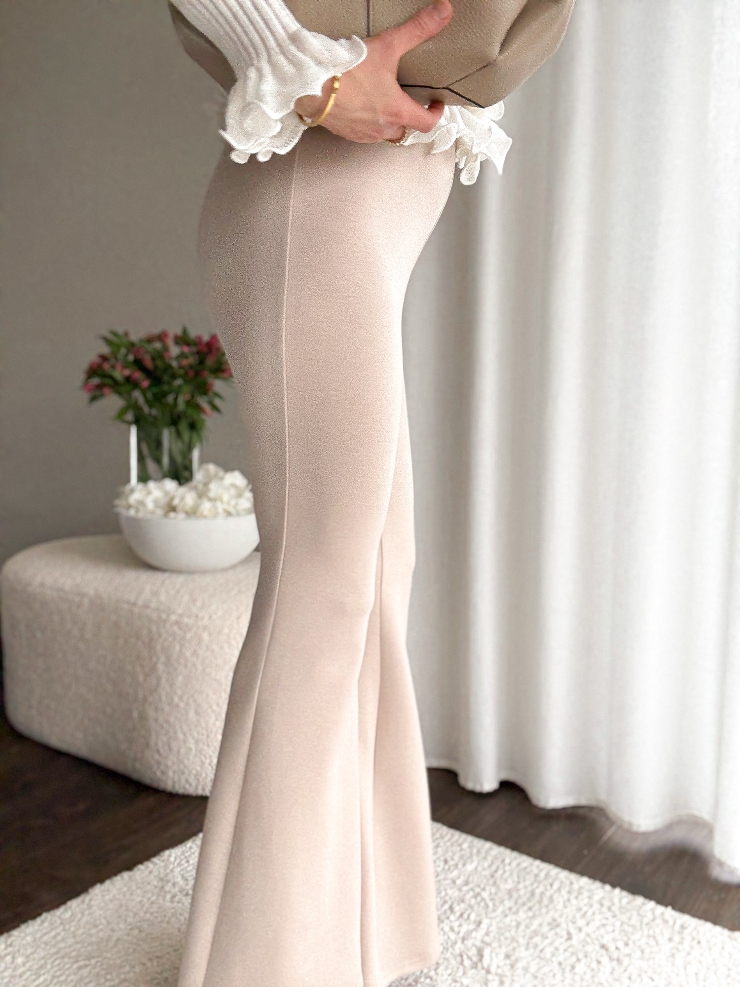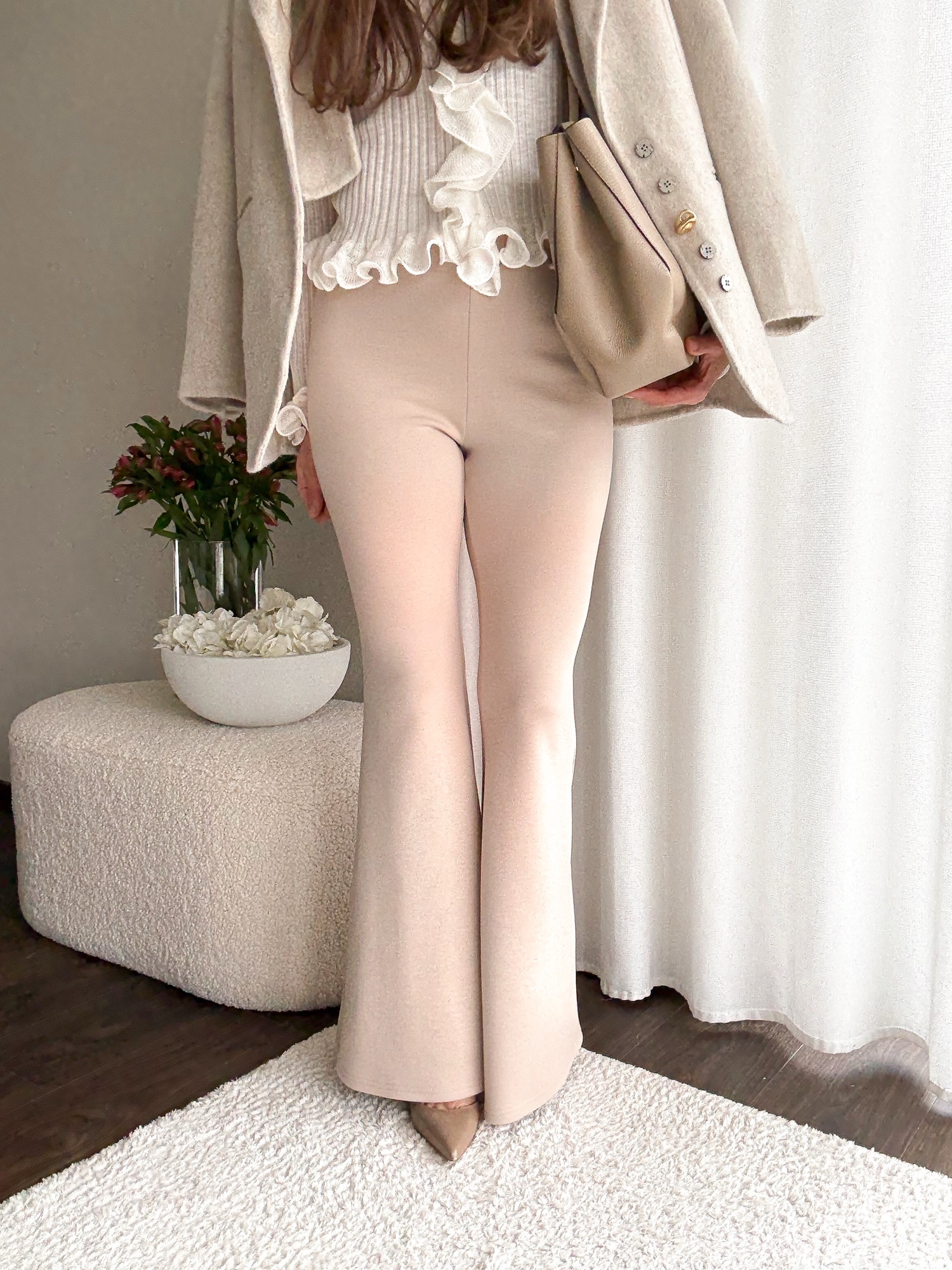 Legginsy dopasowane w talii i biodrach i mocno rozszerzaną nogawką.