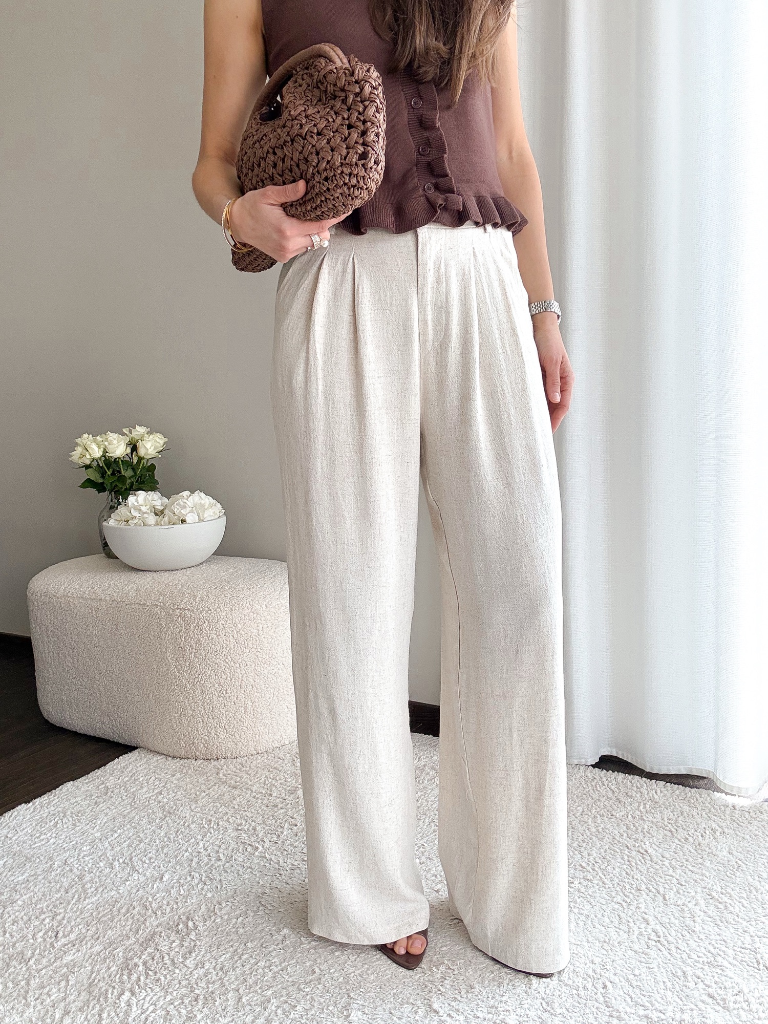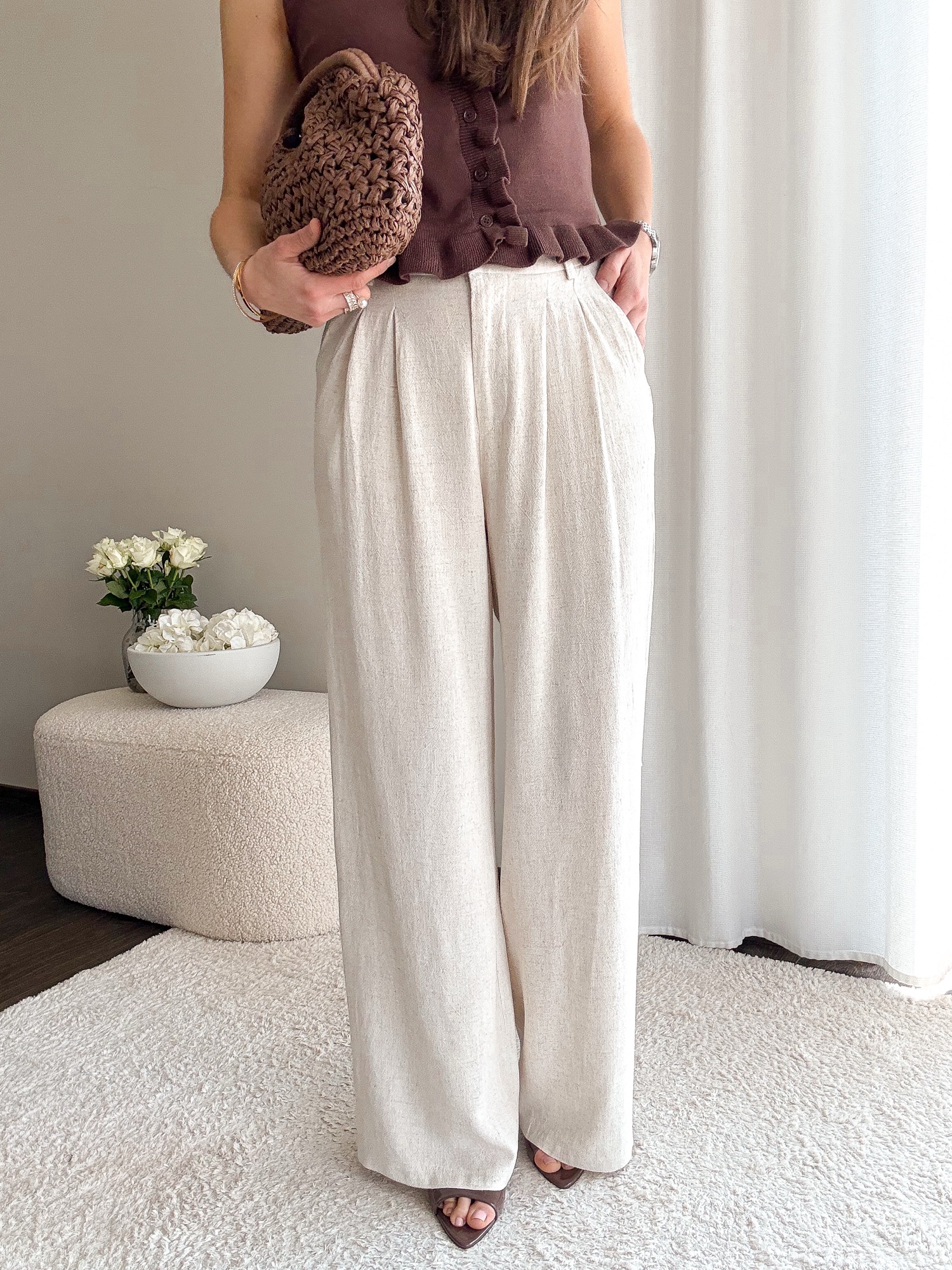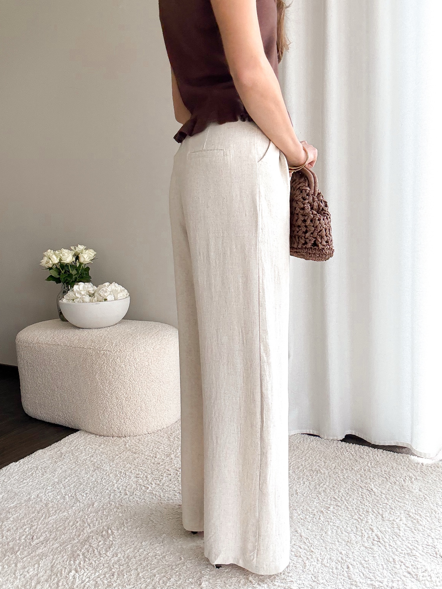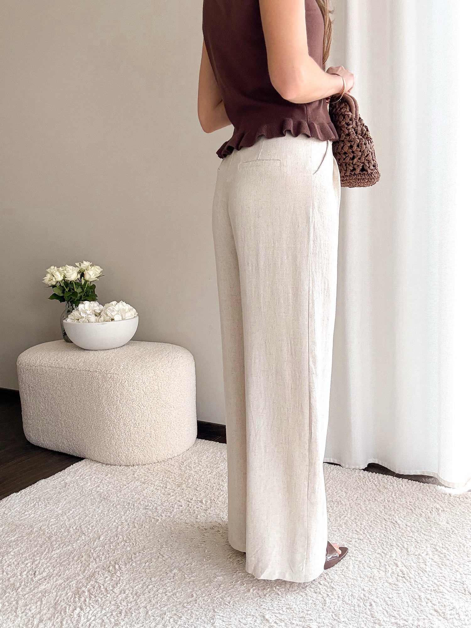 Długie lniane spodnie z prostą nogawką.