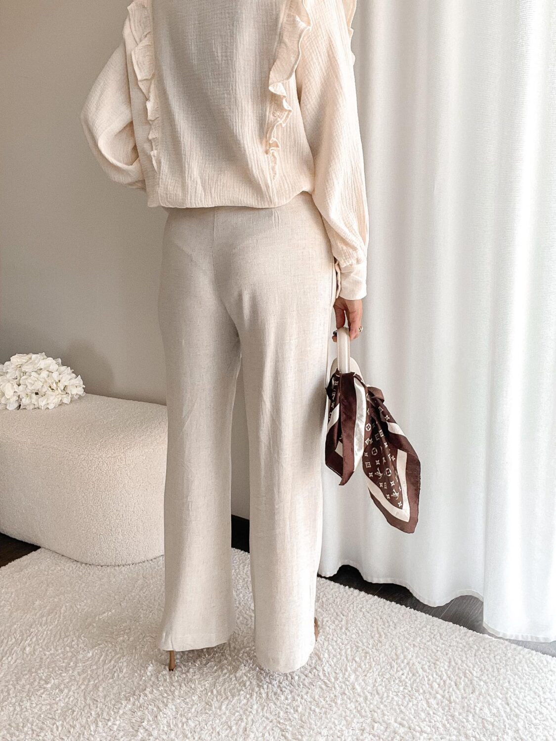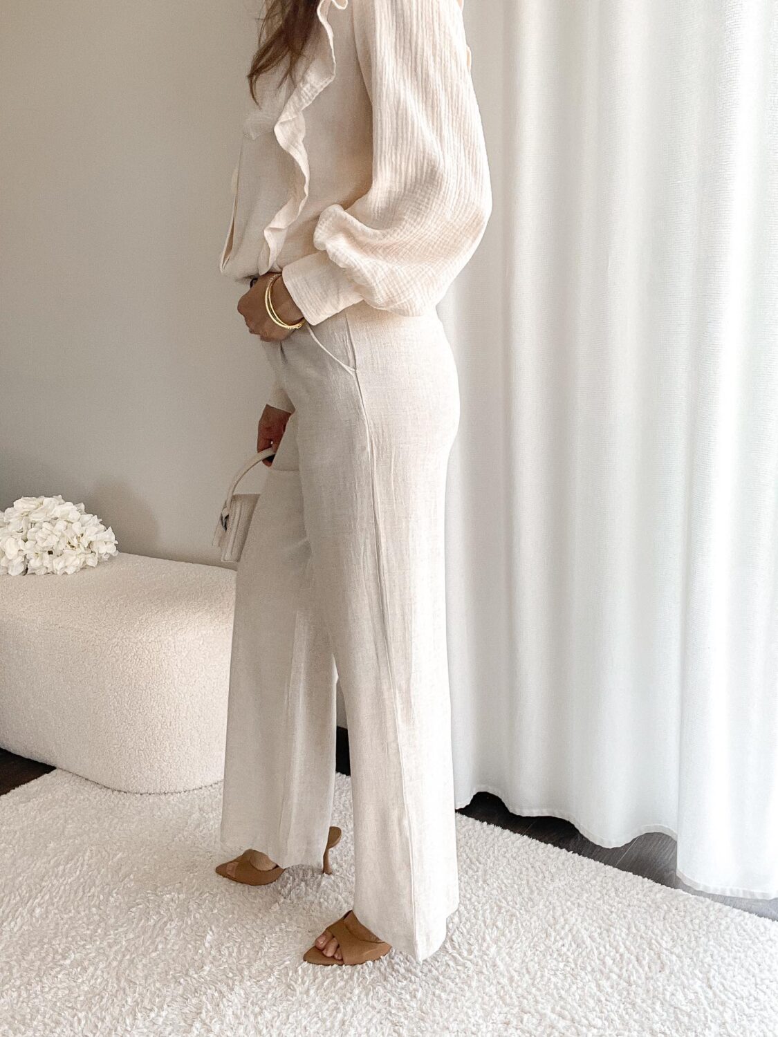 Długie lniane spodnie ze prostą nogawką. Materiał oddychający, idealne na lato.