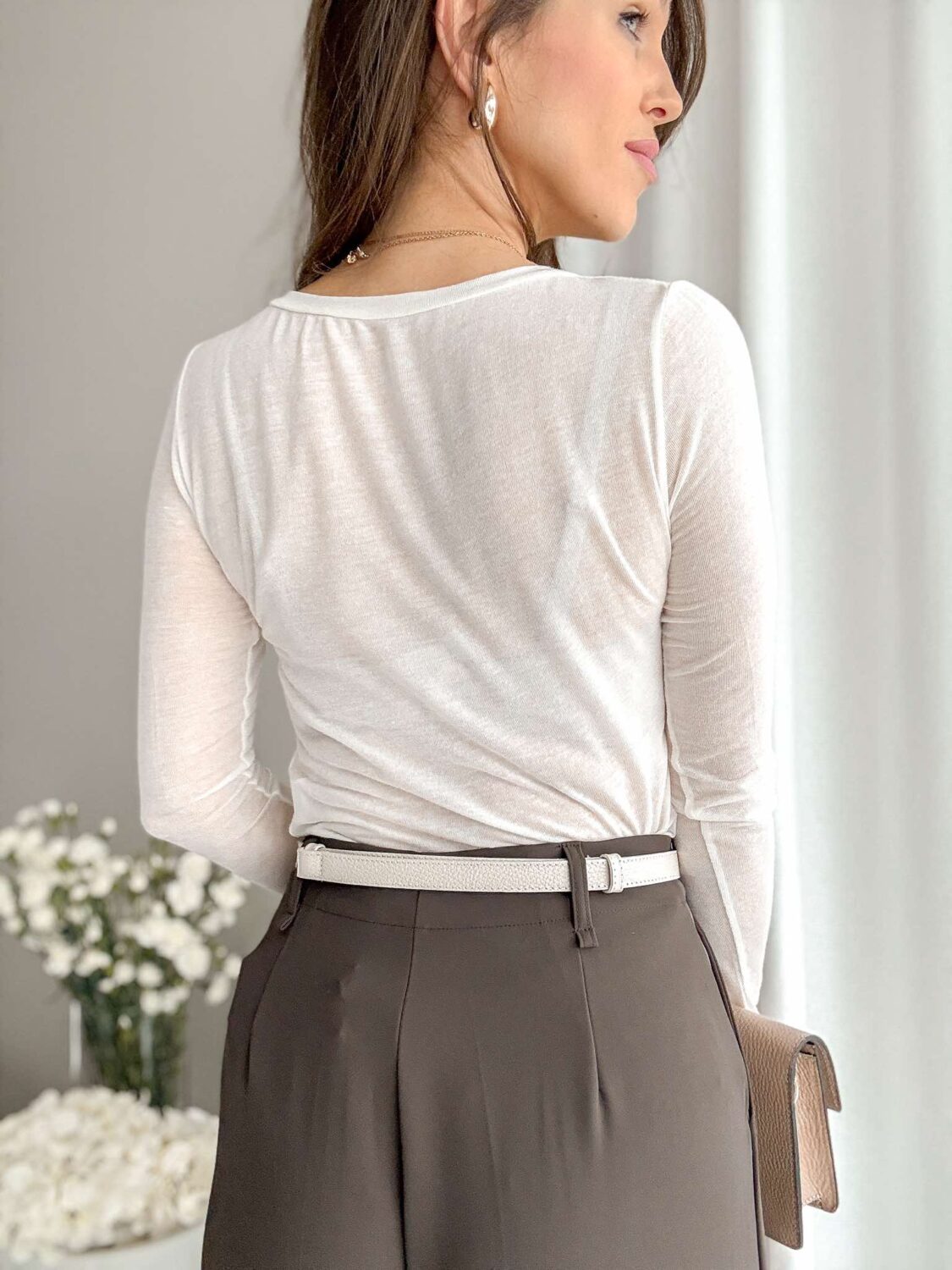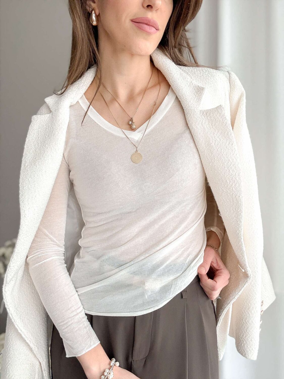 Cieniutka bluzka z długim rękawem i dekoltem w szpic wykonana z miękkiej i lekkiej tkaniny z modalu i kaszmiru idealna do warstwowego budowania stylizacji.