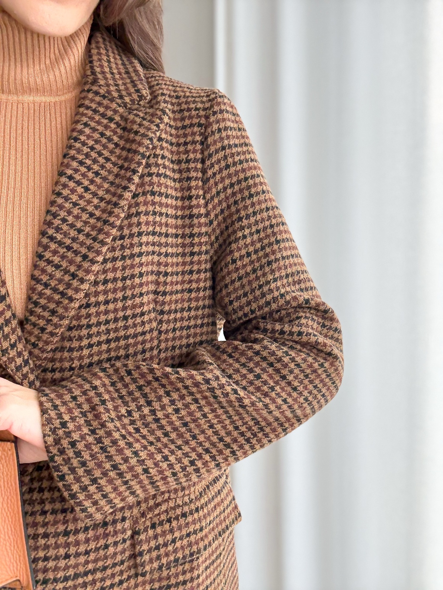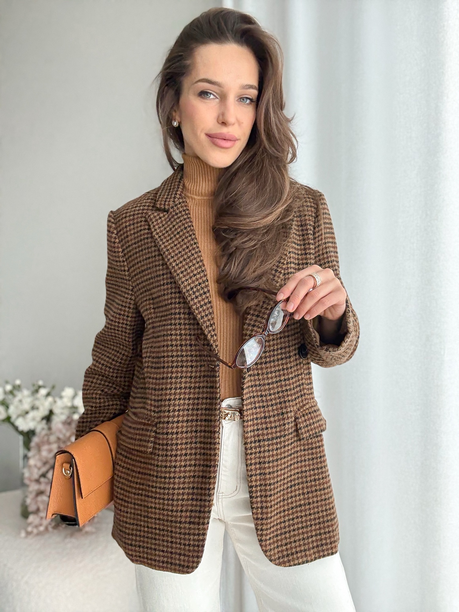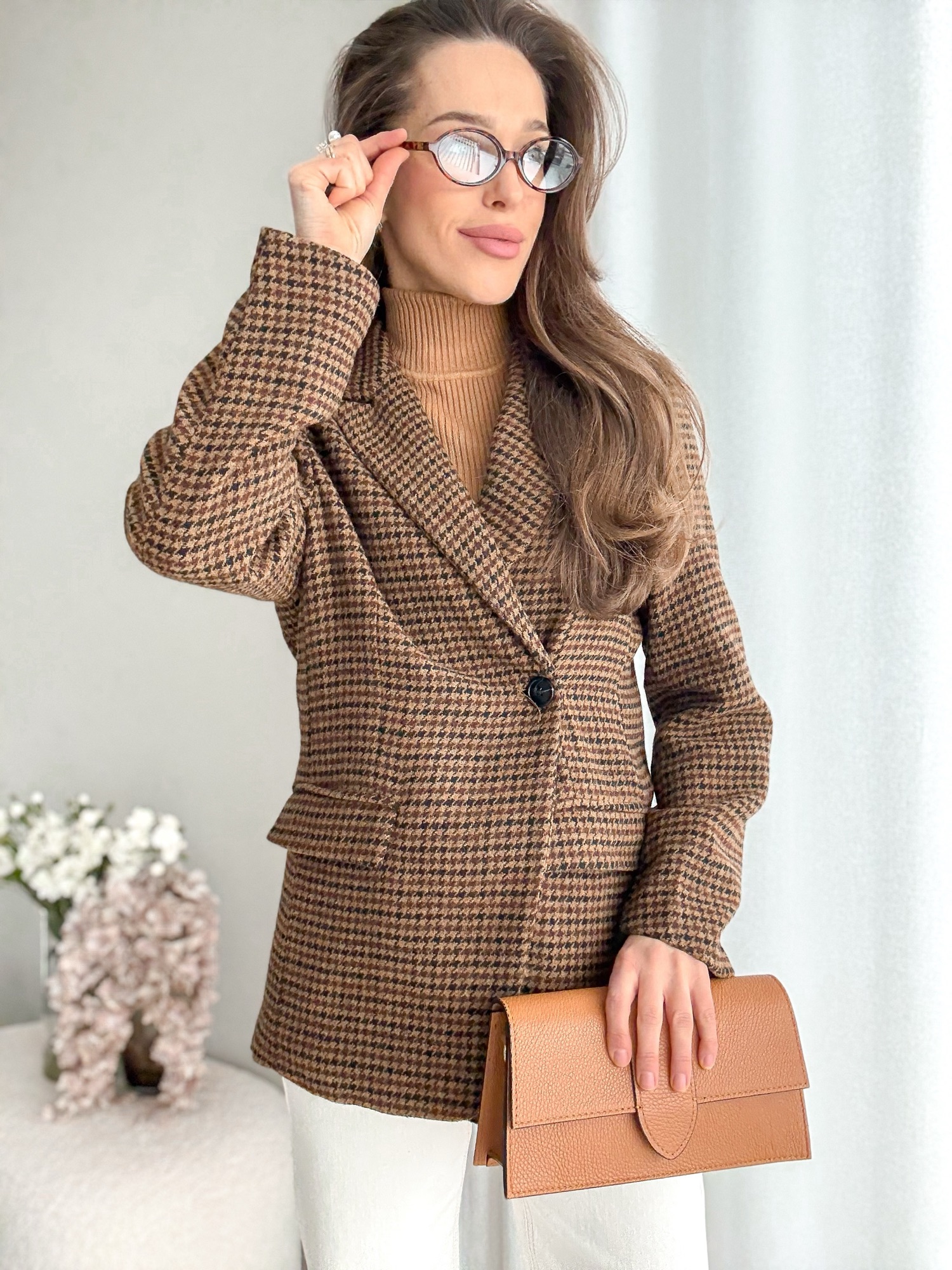 Marynarka w kratkę z grubej tkaniny z dodatkiem wełny.