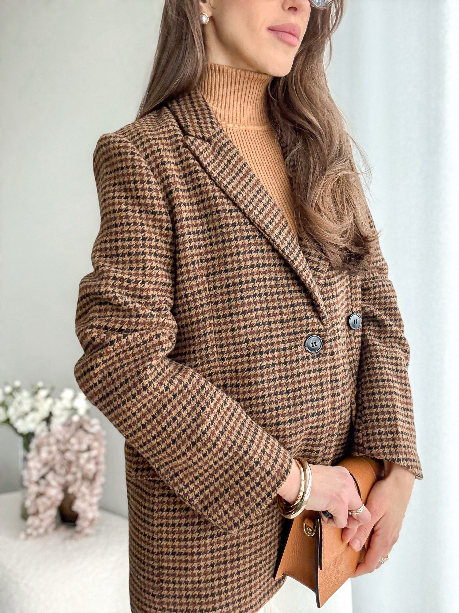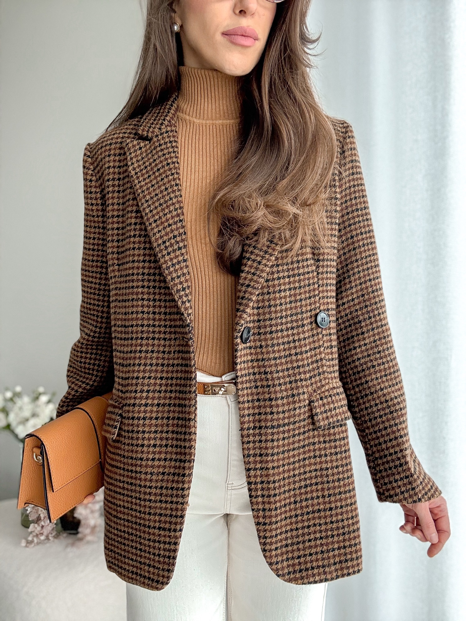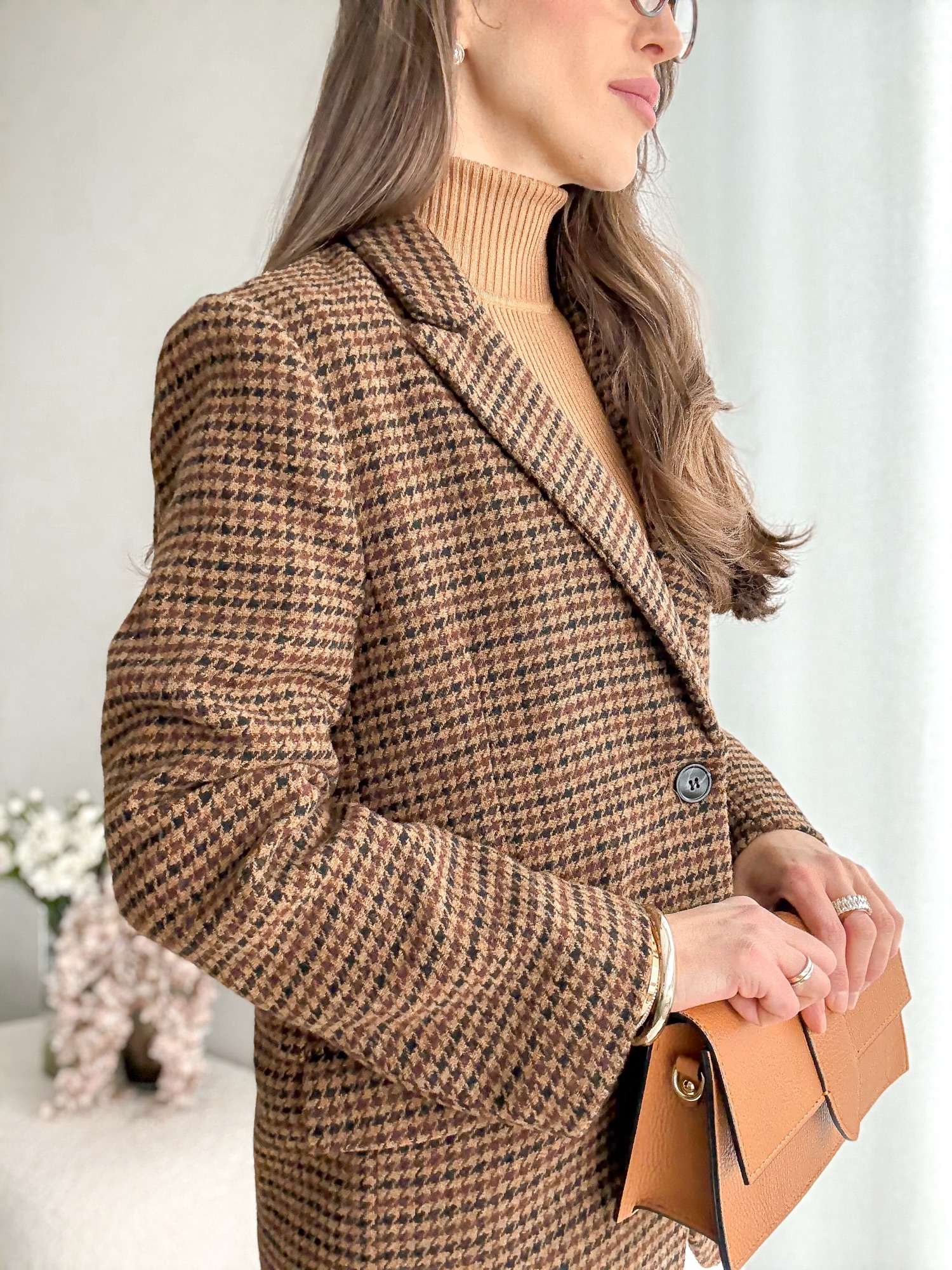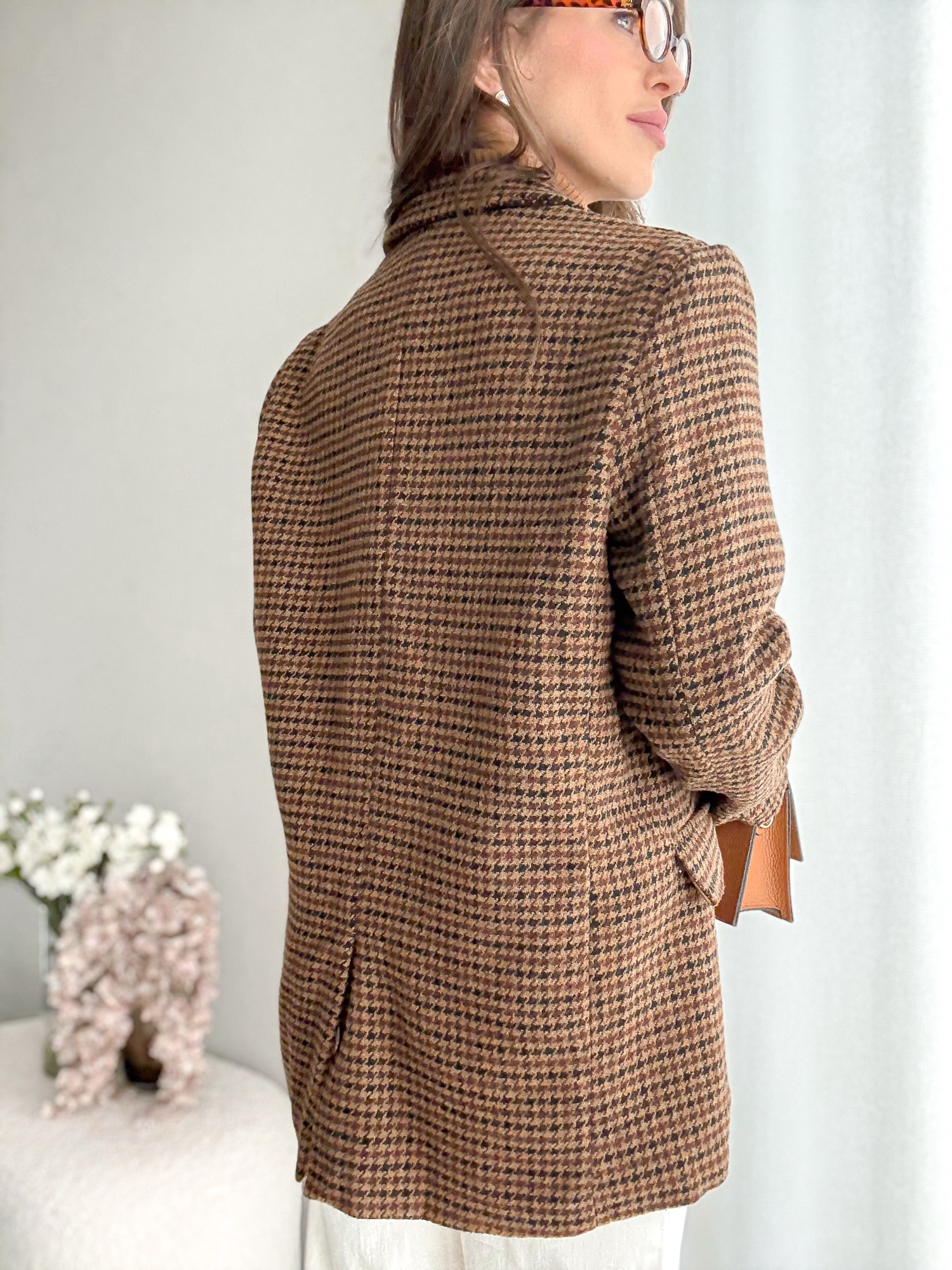 Marynarka w kratkę z grubej tkaniny z dodatkiem wełny.