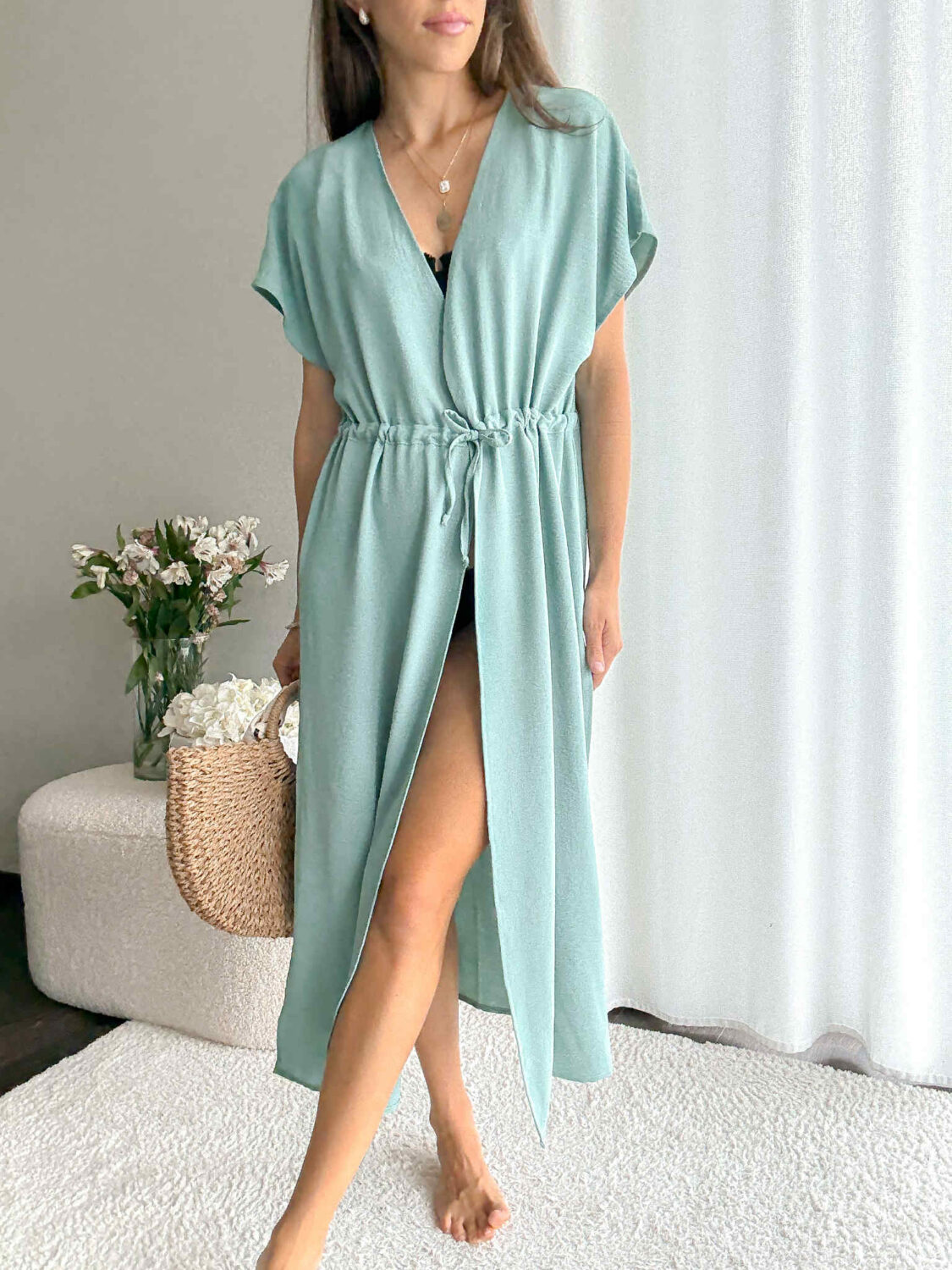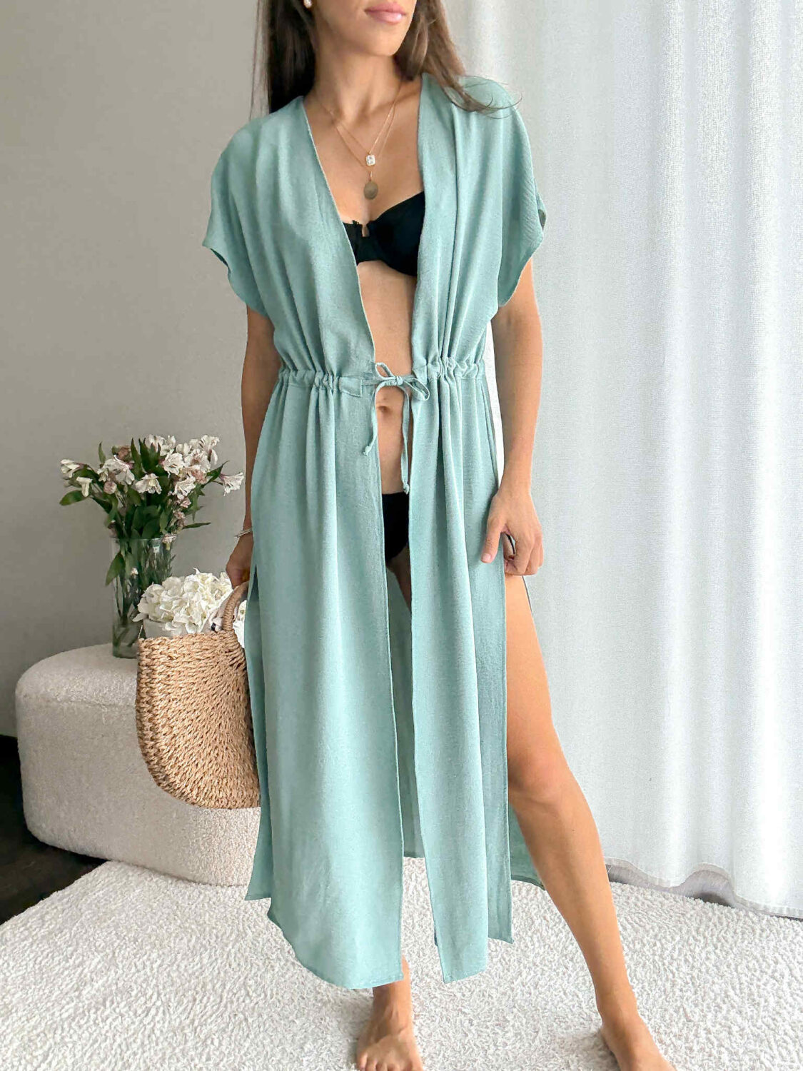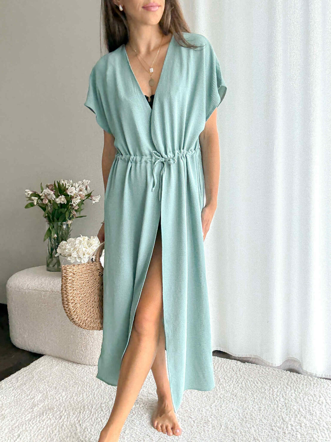 Narzutka plażowa MIA w przepięknym kolorze turkusu z głębokimi rozcięciami po bokach.