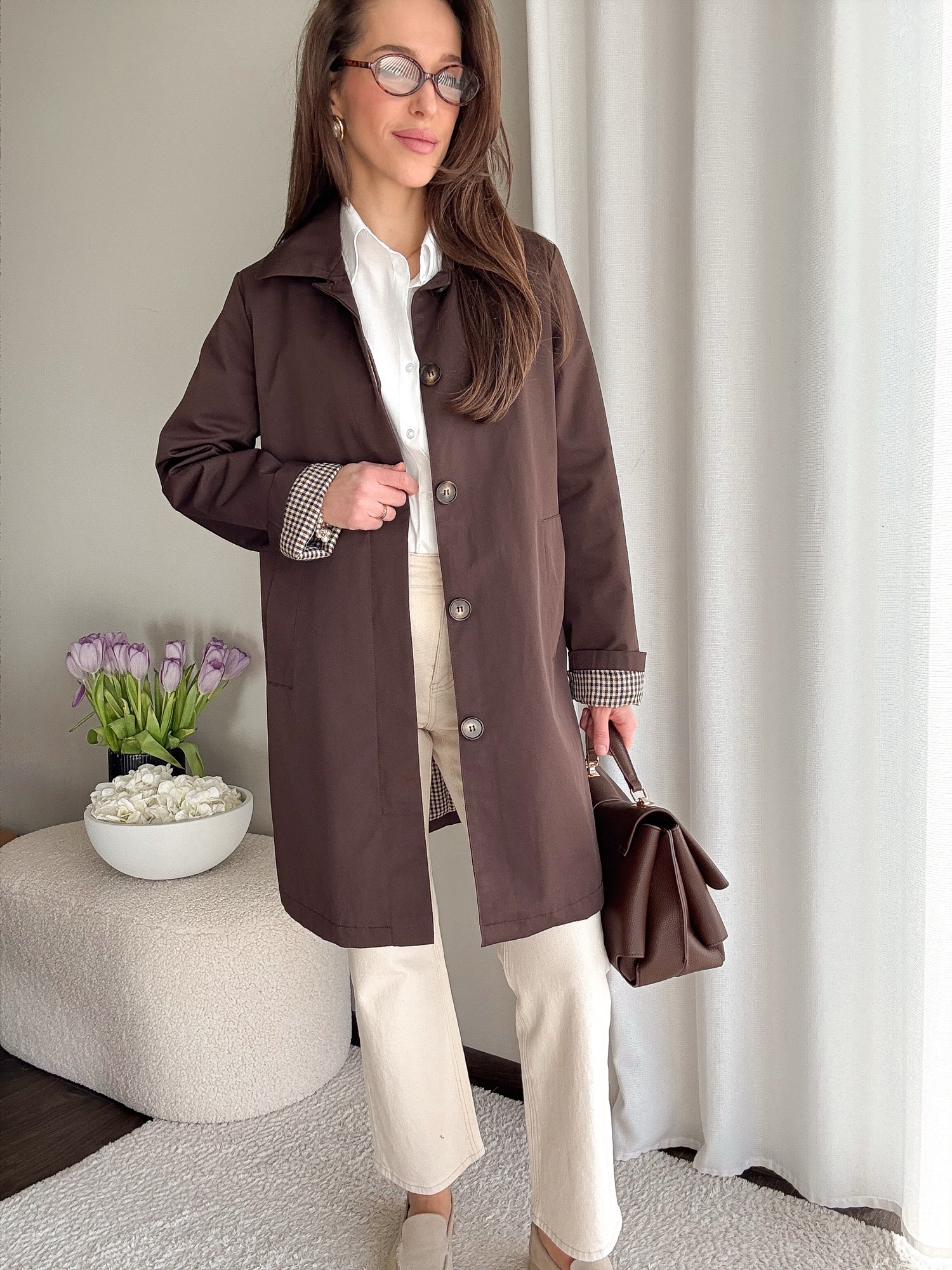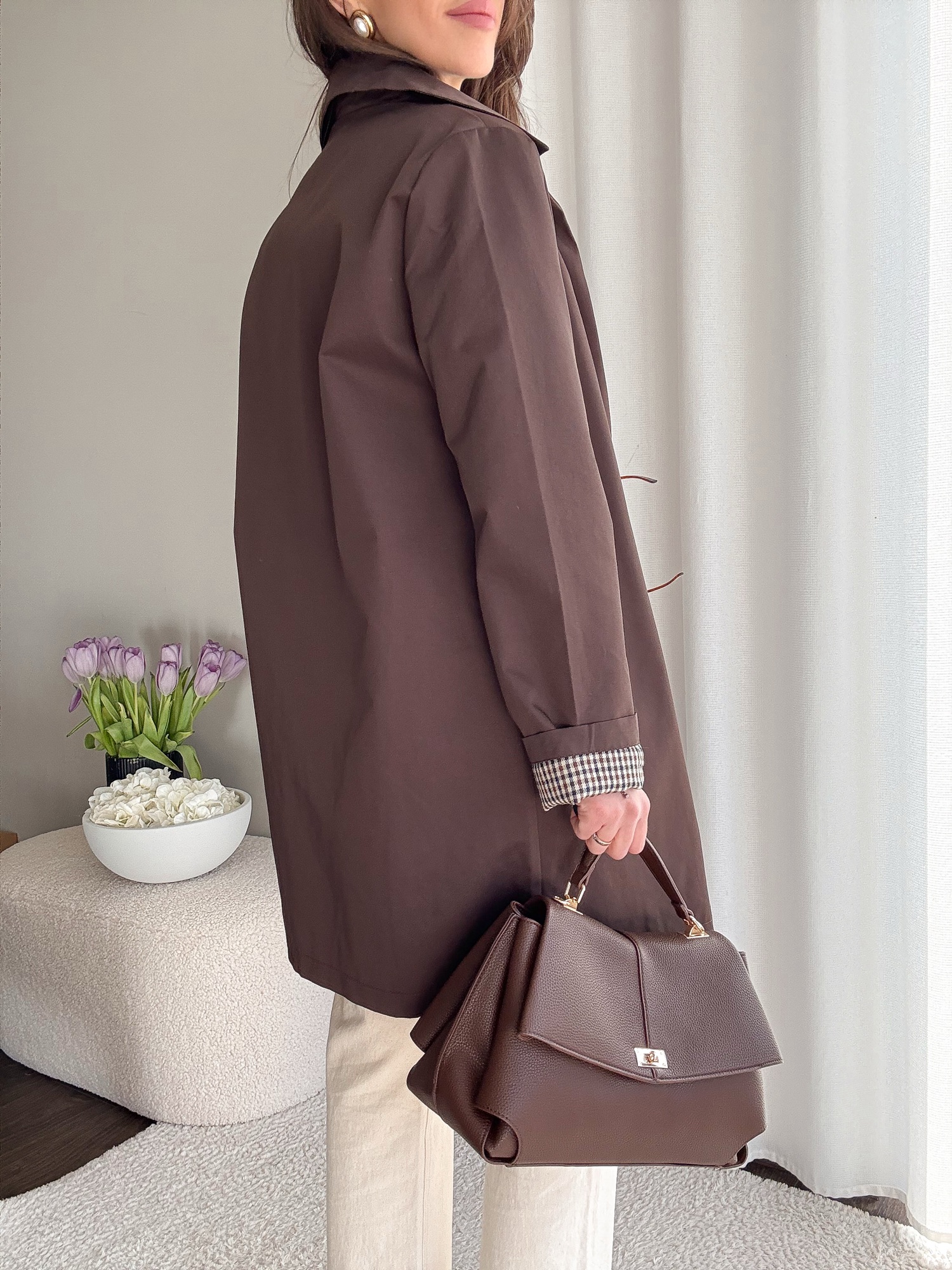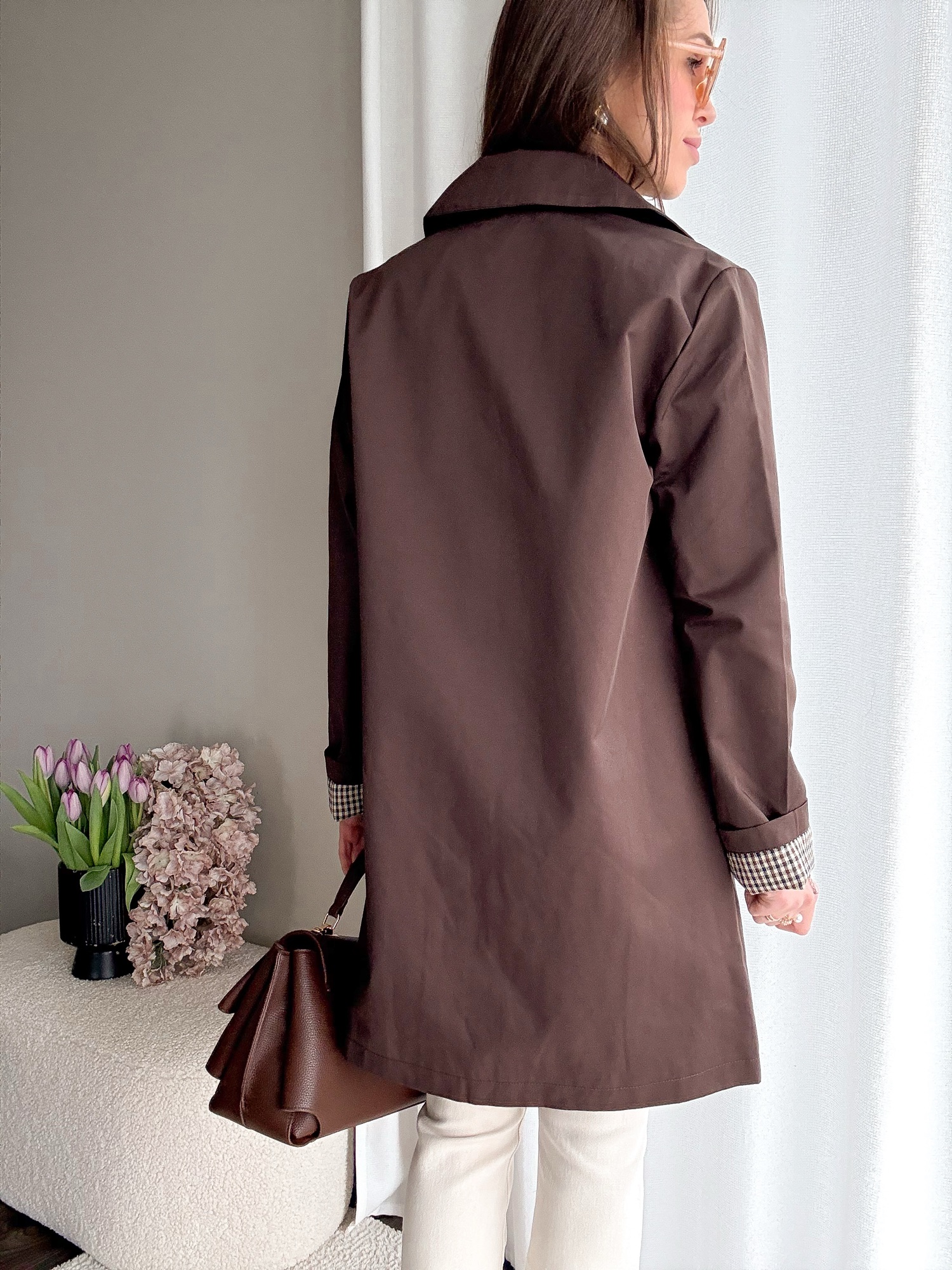 Klasyczny, krótki płaszczyk zapinany na szylkretowe guziki (schowane pod plisą).
